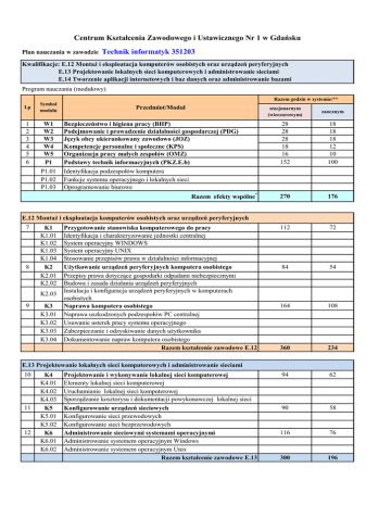 Centrum Kształcenia Zawodowego i Ustawicznego Nr 1 w Gdańsku Plan nauczania w zawodzie Technik informatyk 351203 Kwalifikacje: E.12 Montaż i eksploatacja komputerów osobistych oraz urządzeń peryferyjnych E.13 Projektowanie lokalnych sieci komputerowych i administrowanie sieciami E.14 Tworzenie aplikacji internetowych i baz danych oraz administrowanie bazami Program nauczania (modułowy) Razem godzin w systemie/** Lp Symbol modułu 1 2 3 4 5 6 W1 W2 W3 W4 W5 P1 P1.01 P1.02 P1.03 Przedmiot/Moduł Bezpieczeństwo i higiena pracy (BHP) Podejmowanie i prowadzenie działalności gospodarczej (PDG) Język obcy ukierunkowany zawodowo (JOZ) Kompetencje personalne i społeczne (KPS) Organizacja pracy małych zespołów (OMZ) Podstawy technik informacyjnych (PKZ.E.b) stacjonarnym (wieczorowym) zaocznym 28 28 28 18 16 152 18 18 18 12 10 100 270 176 112 72 84 54 164 108 360 234 94 62 90 58 116 76 300 196 Identyfikacja podzespołów komputera Funkcje systemu operacyjnego i lokalnych sieci Oprogramowanie biurowe Razem efekty wspólne* E.12 Montaż i eksploatacja komputerów osobistych oraz urządzeń peryferyjnych 7 8 K1 K1.01 K1.02 K1.03 K1.04 K2 K2.01 K2.02 K2.03 9 K3 K3.01 K3.02 K3.03 K3.04 Przygotowanie stanowiska komputerowego do pracy Identyfikacja i charakteryzowanie jednostki centralnej System operacyjny WINDOWS System operacyjny UNIX Stosowanie przepisów prawa w działalności informacyjnej Użytkowanie urządzeń peryferyjnych komputera osobistego Przepisy prawa dotyczące gospodarki odpadami niebezpiecznymi Budowa i zasada działania urządzeń peryferyjnych Instalacja i konfiguracja urządzeń peryferyjnych w komputerach osobistych Naprawa komputera osobistego Naprawa uszkodzonych podzespołów PC centralnej Usuwanie usterek pracy systemu operacyjnego Zabezpieczanie i odzyskiwanie danych użytkownika Dokumentowanie napraw komputera osobistego Razem kształcenie zawodowe E.12 E.13 Projektowanie lokalnych sieci komputerowych i administrowanie sieciami 10 11 12 K4 K4.01 K4.02 K4.03 K5 K5.01 K5.02 K6 K6.01 K6.02 Projektowanie i wykonywanie lokalnej sieci komputerowej Elementy lokalnej sieci komputerowej Uruchamianie lokalnej sieci komputerowej Sporządzanie kosztorysu i dokumentacji powykonawczej lokalnej sieci komputerowej urządzeń sieciowych Konfigurowanie Konfigurowanie sieci przewodowych Konfigurowanie sieci bezprzewodowych Administrowanie sieciowymi systemami operacyjnymi Administrowanie systemem operacyjnym Windows Administrowanie systemem operacyjnym Unix Razem kształcenie zawodowe E.13 E.14 Tworzenie aplikacji internetowych i baz danych oraz administrowanie bazami 13 14 15 16 K7 K7.01 K7.02 K8 K8.01 K8.02 K8.03 K9 K9.01 K9.02 K9.03 K9.04 PZ Tworzenie stron internetowych Stosowanie technik graficznych i multimedialnych Tworzenie stron internetowych w języku html Tworzenie baz danych i administrowanie bazami Projektowanie i tworzenie baz danych Tworzenie interfejsu użytkownika Administrowanie bazami danych Tworzenie aplikacji internetowych Programowanie w języku strukturalnym Programowanie w języku obiektowym Wykorzystanie języka programowania po stronie przeglądarki Wykorzystanie języka programowania po stronie serwera Razem kształcenie zawodowe E.14 110 72 82 54 228 148 420 274 Razem kształcenie zawodowe 1080 704 Ogółem godzin 1350 880 Praktyka zawodowa *** 160 godzin * Słuchacz, który zrealizował efekty wspólne lub zawodowe w ramach innych kwalifikacji, może być zwolniony z obowiązku odbywania tych zajęć ** Część godzin może być realizowana w formie kształcenia na odległość. ***Praktyka zawodowa realizowana jest w podmiocie zapewniającym rzeczywiste warunki pracy właściwe dla nauczanego zawodu