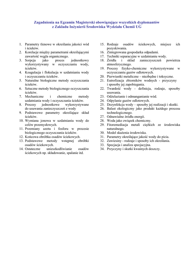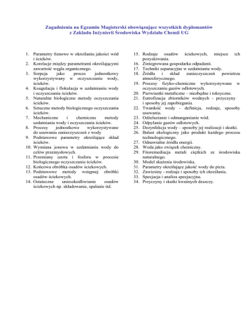 Zagadnienia na Egzamin Magisterski obowiązujące wszystkich dyplomantów z Zakładu InŜynierii Środowiska Wydziału Chemii UG 1. Parametry tlenowe w określaniu jakości wód i ścieków. 2. Korelacje między parametrami określającymi zawartość węgla organicznego. 3. Sorpcja jako proces jednostkowy wykorzystywany w oczyszczaniu wody, ścieków. 4. Koagulacja i flokulacja w uzdatnianiu wody i oczyszczaniu ścieków. 5. Naturalne biologiczne metody oczyszczania ścieków. 6. Sztuczne metody biologicznego oczyszczania ścieków. 7. Mechaniczne i chemiczne metody uzdatniania wody i oczyszczania ścieków. 8. Procesy jednostkowe wykorzystywane do usuwania zanieczyszczeń z wody 9. Podstawowe parametry określające skład ścieków. 10. Wymiana jonowa w uzdatnianiu wody do celów przemysłowych. 11. Przemiany azotu i fosforu w procesie biologicznego oczyszczania ścieków. 12. Końcowa obróbka osadów ściekowych. 13. Podstawowe metody wstępnej obróbki osadów ściekowych. 14. Ostateczne unieszkodliwianie osadów ściekowych np. składowanie, spalanie itd. 15. Rodzaje osadów ściekowych, miejsce ich pozyskiwania. 16. Zintegrowana gospodarka odpadami. 17. Techniki separacyjne w uzdatnianiu wody. 18. Źródła i skład zanieczyszczeń powietrza atmosferycznego. 19. Procesy fizyko-chemiczne wykorzystywane w oczyszczaniu gazów odlotowych. 20. Pierwiastki metaliczne – niezbędne i toksyczne. 21. Eutrofizacja zbiorników wodnych - przyczyny i sposoby jej zapobiegania. 22. Twardość wody - definicja, rodzaje, sposoby usuwania. 23. OdŜelazianie i odmanganianie wód. 24. Odpylanie gazów odlotowych. 25. Dezynfekcja wody – sposoby jej realizacji i skutki. 26. Balast ekologiczny jako produkt kaŜdego procesu technologicznego. 27. Odnawialne źródła energii. 28. Woda jako związek chemiczny. 29. Fitoremediacja metali cięŜkich ze środowiska naturalnego. 30. Model skaŜenia środowiska. 31. Parametry określające jakość wody do picia. 32. Zawiesiny - rodzaje i sposoby ich określania. 33. Specjacja i analiza specjacyjna. 34. Przyczyny i skutki kwaśnych deszczy.