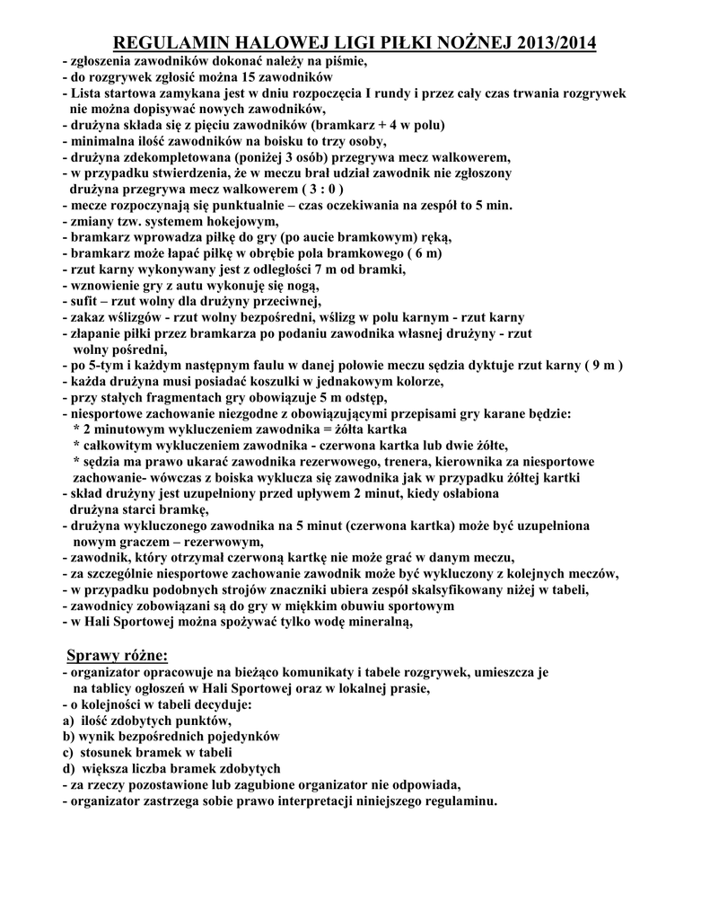 REGULAMIN HALOWEJ LIGI PIŁKI NOŻNEJ 2013/2014 - zgłoszenia zawodników dokonać należy na piśmie, - do rozgrywek zgłosić można 15 zawodników - Lista startowa zamykana jest w dniu rozpoczęcia I rundy i przez cały czas trwania rozgrywek nie można dopisywać nowych zawodników, - drużyna składa się z pięciu zawodników (bramkarz + 4 w polu) - minimalna ilość zawodników na boisku to trzy osoby, - drużyna zdekompletowana (poniżej 3 osób) przegrywa mecz walkowerem, - w przypadku stwierdzenia, że w meczu brał udział zawodnik nie zgłoszony drużyna przegrywa mecz walkowerem ( 3 : 0 ) - mecze rozpoczynają się punktualnie – czas oczekiwania na zespół to 5 min. - zmiany tzw. systemem hokejowym, - bramkarz wprowadza piłkę do gry (po aucie bramkowym) ręką, - bramkarz może łapać piłkę w obrębie pola bramkowego ( 6 m) - rzut karny wykonywany jest z odległości 7 m od bramki, - wznowienie gry z autu wykonuję się nogą, - sufit – rzut wolny dla drużyny przeciwnej, - zakaz wślizgów - rzut wolny bezpośredni, wślizg w polu karnym - rzut karny - złapanie piłki przez bramkarza po podaniu zawodnika własnej drużyny - rzut wolny pośredni, - po 5-tym i każdym następnym faulu w danej połowie meczu sędzia dyktuje rzut karny ( 9 m ) - każda drużyna musi posiadać koszulki w jednakowym kolorze, - przy stałych fragmentach gry obowiązuje 5 m odstęp, - niesportowe zachowanie niezgodne z obowiązującymi przepisami gry karane będzie: * 2 minutowym wykluczeniem zawodnika = żółta kartka * całkowitym wykluczeniem zawodnika - czerwona kartka lub dwie żółte, * sędzia ma prawo ukarać zawodnika rezerwowego, trenera, kierownika za niesportowe zachowanie- wówczas z boiska wyklucza się zawodnika jak w przypadku żółtej kartki - skład drużyny jest uzupełniony przed upływem 2 minut, kiedy osłabiona drużyna starci bramkę, - drużyna wykluczonego zawodnika na 5 minut (czerwona kartka) może być uzupełniona nowym graczem – rezerwowym, - zawodnik, który otrzymał czerwoną kartkę nie może grać w danym meczu, - za szczególnie niesportowe zachowanie zawodnik może być wykluczony z kolejnych meczów, - w przypadku podobnych strojów znaczniki ubiera zespół skalsyfikowany niżej w tabeli, - zawodnicy zobowiązani są do gry w miękkim obuwiu sportowym - w Hali Sportowej można spożywać tylko wodę mineralną, Sprawy różne: - organizator opracowuje na bieżąco komunikaty i tabele rozgrywek, umieszcza je na tablicy ogłoszeń w Hali Sportowej oraz w lokalnej prasie, - o kolejności w tabeli decyduje: a) ilość zdobytych punktów, b) wynik bezpośrednich pojedynków c) stosunek bramek w tabeli d) większa liczba bramek zdobytych - za rzeczy pozostawione lub zagubione organizator nie odpowiada, - organizator zastrzega sobie prawo interpretacji niniejszego regulaminu.