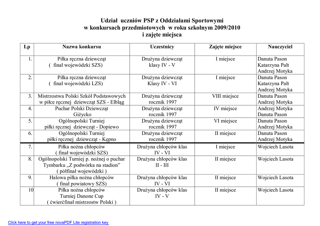 Udział uczniów PSP z Oddziałami Sportowymi w konkursach przedmiotowych w roku szkolnym 2009/2010 i zajęte miejsca Lp Nazwa konkursu Uczestnicy Zajęte miejsce 1. Piłka ręczna dziewcząt ( finał wojewódzki SZS) Drużyna dziewcząt klasy IV - V I miejsce 2. Piłka ręczna dziewcząt ( finał wojewódzki LZS) Drużyna dziewcząt Klasy IV - VI I miejsce Mistrzostwa Polski Szkół Podstawowych w piłce ręcznej dziewcząt SZS - Elbląg 4. Puchar Polski Dziewcząt Giżycko 5. Ogólnopolski Turniej piłki ręcznej dziewcząt - Dopiewo 6. Ogólnopolski Turniej piłki ręcznej dziewcząt - Kępno 7. Piłka nożna chłopców ( finał wojewódzki SZS) 8. Ogólnopolski Turniej p. nożnej o puchar Tymbarku „Z podwórka na stadion” ( półfinał wojewódzki ) 9. Halowa piłka nożna chłopców ( finał powiatowy SZS) 10. Piłka nożna chłopców Turniej Danone Cup ( ćwierćfinał mistrzostw Polski ) Drużyna dziewcząt rocznik 1997 Drużyna dziewcząt rocznik 1997 Drużyna dziewcząt rocznik 1997 Drużyna dziewcząt rocznik 1997 Drużyna chłopców klas IV - VI Drużyna chłopców klas II - III VIII miejsce Drużyna chłopców klas IV - VI Drużyna chłopców klas IV - V 3. Click here to get your free novaPDF Lite registration key Nauczyciel I miejsce Danuta Pason Katarzyna Palt Andrzej Motyka Danuta Pason Katarzyna Palt Andrzej Motyka Danuta Pason Andrzej Motyka Andrzej Motyka Danuta Pason Danuta Pason Andrzej Motyka Danuta Pason Andrzej Motyka Wojciech Lasota II miejsce Wojciech Lasota II miejsce Wojciech Lasota II miejsce Wojciech Lasota IV miejsce VI miejsce II miejsce 11. 12. 13. 14. 15. 16. 17. 18. Koszykówka chłopców ( finał powiatowy ) Wiosenne Wojewódzkie Biegi przełajowe Wojewódzki Konkurs Skoków i Rzutów LA Mały Olimpijczyk ( półfinał powiatowy ) Mały Olimpijczyk (finał powiatowy ) Wojewódzki Konkurs Języka Niemieckiego Ogólnopolski konkurs wiedzy o Janie Pawle II „Olimpus” Ogólnopolski Konkurs Matematyczny „Oxford” 19. Międzynarodowy Konkurs Matematyczny „Kangur matematyczny” 20. Ogólnopolski Konkurs Matematyczny dla klas III „Kangurek matematyczny” 21. Wojewódzki „Mini Konkurs Wiedzy Przyrodniczej” Click here to get your free novaPDF Lite registration key Drużyna chłopców klas V - VI Sebastian Strózik Ewelina Dajewska A. Szczygiecka –skok wzwyż J. Małojło – skok wzwyż W. Kurpiella – pchnięc. kulą P. Urbańczyk – pchnięc. kulą Drużyna dziewcząt klasy IV Drużyna chłopców klasy IV Antonia Sabasch II miejsce Wojciech Lasota I miejsce III miejsce II miejsce I miejsce II miejsce III miejsce III miejsce Wojciech Lasota III miejsce Danuta Pason Finalista Aneta Baron Wojciech Lasota Danuta Pason Katarzyna Palt Danuta Pason Karolina Zajączkowska Wyróżnienie Beata Cholewa Paulina Wieczorek Aleksandra Kubis Jakub Malij Tobiasz Wróbel Paulina Wieczorek Aleksandra Kubis Martyna Pietrzyk Wyróżnienie Wyróżnienie Wyróżnienie Wyróżnienie Wyróżnienie Wyróżnienie Wyróżnienie Urszula Warzecha Iwona Przybyłko Mikoła Tarapacz Michał Szleger Wyróżnienie Wyróżnienie Marzena Kamińska Izabela Paluch Maria Pozniak Tomasz Chabior Magda Pluta II miejsce VI miejsce X miejsce Urszula Warzecha Iwona Przybyłko Karina Wajman 22. Rejonowy konkurs PCK „Człowiek i jego środowisko” 23. Międzyszkolny konkurs pierwszej pomocy przedmedycznej 24. 27. Rejonowy Konkurs Recytatorski w języku niemieckim „Młodzież recytuje poezję” Konkurs Literacki w języku niemieckim „In der Sprache des Herzens“ Miedzyszkolny Konkurs „Młody Literat” Gminny konkurs matematyczny 28. Gminny konkurs historyczny 29. Gminny konkurs matematyczny dla klas III 25. 26. 30. 31. 32. Gminny konkurs polonistyczny Gminny konkurs języka angielskiego Gminny konkurs przyrodniczy Click here to get your free novaPDF Lite registration key Jakub Malij III miejsce Grzegorz Matyszok Jakub Malij IV miejsce Julia Gross uczestnik B. Cholewa S. Paprocka S. Hadamek B. Cholewa S. Paprocka S. Hadamek Katarzyna Lauer Antonia Sabasch wyróżnienie Katarzyna Lauer Jakub Malij II miejsce Stanisław Janczy Aleksandra Kubis Paulina Wieczorek Aleksandra Kubis Paweł Olejnik Mikołaj Tarapacz Michał Szleger Adrian Kroczak Justyna Gawrońska Tobiasz Wróbel Anna Beauvale Karolina Juzak Tobiasz Wróbel Jakub Małojło Antonia Sabasch Anna Wilusz Tobiasz Wróbel Michał Kołbuc IV miejsce VI miejsce II miejsce III miejsce I miejsce II miejsce III miejsce I miejsce III miejsce IV miejsce V miejsce I miejsce II miejsce III miejsce III miejsce III miejsce III miejsce Urszula Warzecha Aneta Budzyń Iza Paluch Marzena Kamińska Stanisław Janczy Anna Hendzel Zbigniew Wajman 33. Gminny konkurs ekologiczno – przyrodniczy dla klas I - III Ola Siedlecka Dominika Paluch I miejsce Mikołaj Tarapacz Piotr Poniży Julia Kocoń II miejsce Kacper Malij Anna Fiecek Paulina Oliwa III miejsce Dawid Stiller 34. Gminny przegląd młodych talentów „ Marta Andruszków wyróżnienie Talent 2010” Zuzanna Drop wyróżnienie Agata Domarus wyróżnienie 35. Gminny Konkurs Mini Olimpiada Wiedzy Maria Pozniak II miejsce Przyrodniczej 2010 „Przyjaciel Przyrody” Tomasz Chabior, VI miejsce 36. Konkurs „Śląskie Dziecięce Śpiewanie” Szkolny zespół regionalny Zwycięzcy eliminacji im. Adolfa Dygacza „Gagatki” rejonowych w Łubnianach i uczestnicy półfinałów w Piekarach Śląskich 37. Międzyszkolny Konkurs Szkolny zespół regionalny Gabi Moczko - solistka Kolęd i Pastorałek „Gagatki” II miejsce Komprachcice 2010 Zespół Gagatki -III miejsce 38. Wojewódzki Konkurs Pieśni Ludowej w Szkolny zespół regionalny III miejsce Gogolinie „Gagatki” ( lipiec 2009 ) 39. Międzynarodowy Konkurs Pieśni Ludowej Szkolny zespół regionalny III miejsce im. Stanisława Hadyny w Koszęcinie „Gagatki” ( wrzesień 2009 ) 40. XII Międzynarodowy Konkurs Pieśni Szkolny zespół regionalny Gabi Moczko - II miejsce Ludowej im. Stanisława Hadyny w „Gagatki” Zespół G
