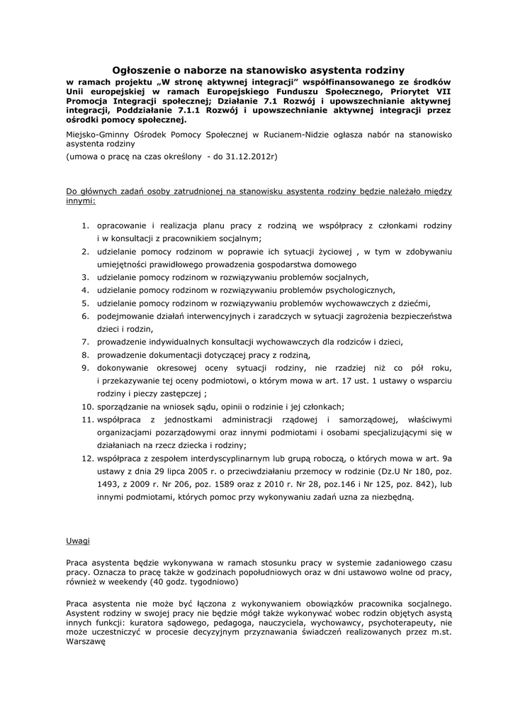 Ogłoszenie o naborze na stanowisko asystenta rodziny w ramach projektu „W stronę aktywnej integracji” współfinansowanego ze środków Unii europejskiej w ramach Europejskiego Funduszu Społecznego, Priorytet VII Promocja Integracji społecznej; Działanie 7.1 Rozwój i upowszechnianie aktywnej integracji, Poddziałanie 7.1.1 Rozwój i upowszechnianie aktywnej integracji przez ośrodki pomocy społecznej. Miejsko-Gminny Ośrodek Pomocy Społecznej w Rucianem-Nidzie ogłasza nabór na stanowisko asystenta rodziny (umowa o pracę na czas określony - do 31.12.2012r) Do głównych zadań osoby zatrudnionej na stanowisku asystenta rodziny będzie należało między innymi: 1. opracowanie i realizacja planu pracy z rodziną we współpracy z członkami rodziny i w konsultacji z pracownikiem socjalnym; 2. udzielanie pomocy rodzinom w poprawie ich sytuacji życiowej , w tym w zdobywaniu umiejętności prawidłowego prowadzenia gospodarstwa domowego 3. udzielanie pomocy rodzinom w rozwiązywaniu problemów socjalnych, 4. udzielanie pomocy rodzinom w rozwiązywaniu problemów psychologicznych, 5. udzielanie pomocy rodzinom w rozwiązywaniu problemów wychowawczych z dziećmi, 6. podejmowanie działań interwencyjnych i zaradczych w sytuacji zagrożenia bezpieczeństwa dzieci i rodzin, 7. prowadzenie indywidualnych konsultacji wychowawczych dla rodziców i dzieci, 8. prowadzenie dokumentacji dotyczącej pracy z rodziną, 9. dokonywanie okresowej oceny sytuacji rodziny, nie rzadziej niż co pół roku, i przekazywanie tej oceny podmiotowi, o którym mowa w art. 17 ust. 1 ustawy o wsparciu rodziny i pieczy zastępczej ; 10. sporządzanie na wniosek sądu, opinii o rodzinie i jej członkach; 11. współpraca z jednostkami administracji rządowej i samorządowej, właściwymi organizacjami pozarządowymi oraz innymi podmiotami i osobami specjalizującymi się w działaniach na rzecz dziecka i rodziny; 12. współpraca z zespołem interdyscyplinarnym lub grupą roboczą, o których mowa w art. 9a ustawy z dnia 29 lipca 2005 r. o przeciwdziałaniu przemocy w rodzinie (Dz.U Nr 180, poz. 1493, z 2009 r. Nr 206, poz. 1589 oraz z 2010 r. Nr 28, poz.146 i Nr 125, poz. 842), lub innymi podmiotami, których pomoc przy wykonywaniu zadań uzna za niezbędną. Uwagi Praca asystenta będzie wykonywana w ramach stosunku pracy w systemie zadaniowego czasu pracy. Oznacza to pracę także w godzinach popołudniowych oraz w dni ustawowo wolne od pracy, również w weekendy (40 godz. tygodniowo) Praca asystenta nie może być łączona z wykonywaniem obowiązków pracownika socjalnego. Asystent rodziny w swojej pracy nie będzie mógł także wykonywać wobec rodzin objętych asystą innych funkcji: kuratora sądowego, pedagoga, nauczyciela, wychowawcy, psychoterapeuty, nie może uczestniczyć w procesie decyzyjnym przyznawania świadczeń realizowanych przez m.st. Warszawę Wymagania konieczne: 1. obywatelstwo polskie 2. wykształcenie wyższe na kierunku pedagogika, psychologia, socjologia, nauki o rodzinie, praca socjalna lub średnie (min. 1 rok udokumentowanej pracy z rodziną lub osobami wykluczonymi społecznie) 3. pełna zdolność do czynności prawnych oraz korzystanie z pełni praw publicznych 4. niekaralność za przestępstwo umyślne lub umyślne przestępstwo skarbowe 5. co najmniej roczny staż pracy z rodziną lub osobami wykluczonymi społecznie Wymagania pożądane: 1. znajomość regulacji prawnych z zakresu: wsparcia rodziny i systemie pieczy zastępczej, pomocy społecznej, przeciwdziałania przemocy w rodzinie, przeciwdziałania alkoholizmowi, przeciwdziałania narkomanii, prawa pracy, przepisów o ochronie danych osobowych, 2. obsługa komputera 3. łatwość nawiązywania kontaktów interpersonalnych 4. umiejętność pracy w zespole Wymagane dokumenty i oświadczenia 1. życiorys z przebiegiem nauki i pracy zawodowej, list motywacyjny - podpisane odręcznie 2. kopie dokumentów potwierdzających posiadane wykształcenie 3. kopię dokumentu potwierdzającego obywatelstwo polskie 4. podpisane pisemne oświadczenie o pełnej zdolności do czynności prawnych, korzystaniu z pełni praw publicznych i o niekaralności za przestępstwa popełnione umyślnie lub umyślne przestępstwa skarbowe 5. podpisane oświadczenie, że kandydat nie jest i nie był pozbawiony władzy rodzicielskiej oraz władza rodzicielska nie została mu zawieszona ani ograniczona 6. podpisane oświadczenie, że kandydat wypełnia obowiązek alimentacyjny, w przypadku, gdy taki obowiązek został nałożony na podstawie tytułu wykonawczego pochodzącego lub zatwierdzonego przez sąd 7. podpisana klauzula o treści: „Wyrażam zgodę na przetwarzanie moich danych osobowych zawartych w ofercie pracy dla potrzeb rekrutacji, zgodnie z ustawą z dnia 29.08.1997 o ochronie danych osobowych. Dz. U. z 2002 r. nr 101, poz.926 ze zm." Osoby zainteresowane prosimy o przesłanie pocztą 31.05.2012 r. do godz. 15.00 na adres: kompletu dokumentów w terminie do Miejsko-Gminny Ośrodek Pomocy Społecznej w Rucianem-Nidzie ul. Polna 1; 12-220 Ruciane-Nida lub dostarczyć osobiście w zamkniętej kopercie do Ośrodka z dopiskiem na kopercie: „asystent rodziny". KOORDYNATOR PROJEKTU p.o. kierownika MGOPS Monika Cwalińska