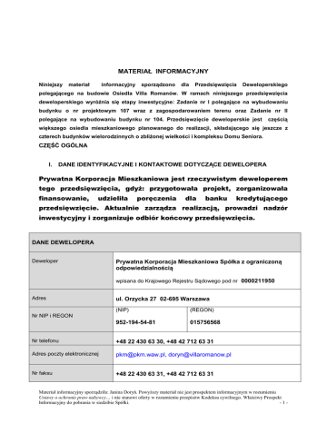 MATERIAŁ INFORMACYJNY Niniejszy materiał informacyjny sporządzono dla Przedsięwzięcia Deweloperskiego polegającego na budowie Osiedla Villa Romanów. W ramach niniejszego przedsięwzięcia deweloperskiego wyróżnia się etapy inwestycyjne: Zadanie nr I polegające na wybudowaniu budynku o nr projektowym 107 wraz z zagospodarowaniem terenu oraz Zadanie nr II polegające na wybudowaniu budynku nr 104. Przedsięwzięcie deweloperskie jest częścią większego osiedla mieszkaniowego planowanego do realizacji, składającego się jeszcze z czterech budynków wielorodzinnych o zbliżonej wielkości i kompleksu Domu Seniora. CZĘŚĆ OGÓLNA I. DANE IDENTYFIKACYJNE I KONTAKTOWE DOTYCZĄCE DEWELOPERA Prywatna Korporacja Mieszkaniowa jest rzeczywistym deweloperem tego przedsięwzięcia, gdyż: przygotowała projekt, zorganizowała finansowanie, udzieliła poręczenia dla banku kredytującego przedsięwzięcie. Aktualnie zarządza realizacją, prowadzi nadzór inwestycyjny i zorganizuje odbiór końcowy przedsięwzięcia. DANE DEWELOPERA Deweloper Prywatna Korporacja Mieszkaniowa Spółka z ograniczoną odpowiedzialnością wpisana do Krajowego Rejestru Sądowego pod nr 0000211950 Adres ul. Orzycka 27 02-695 Warszawa (NIP) (REGON) 952-194-54-81 015756568 Nr NIP i REGON Nr telefonu +48 22 430 63 30, +48 42 712 63 31 Adres poczty elektronicznej [email protected], [email protected] Nr faksu +48 22 430 63 31, +48 42 712 63 31 Materiał informacyjny sporządziła: Janina Doryń. Powyższy materiał nie jest prospektem informacyjnym w rozumieniu Ustawy o ochronie praw nabywcy… i nie stanowi oferty w rozumieniu przepisów Kodeksu cywilnego. Właściwy Prospekt Informacyjny do pobrania w siedzibie Spółki. -1- Adres strony internetowej Dewelopera Villa Romanów www.pkm.waw.pl jest spółka celową Prywatnej Korporacji Mieszkaniowej i jej wspólnika dla realizacji tego przedsięwzięcia, która jest hipotecznym właścicielem nieruchomości, inwestorem i kredytobiorcą oraz sprzedawcą lokali. DANE DEWELOPERA Deweloper Villa Romanów Spółka z ograniczoną odpowiedzialnością wpisana do Krajowego Rejestru Sądowego pod nr 0000393241 Adres ul. Romanowska 55E lok. 17 91-174 Łódź (NIP) (REGON) 521-361-48-46 144337133 Nr NIP i REGON Nr telefonu +48 42 712 63 31 Adres poczty elektronicznej [email protected], [email protected] Nr faksu +48 42 712 63 31 Adres strony internetowej Dewelopera www.villaromanow.pl II. DOŚWIADCZENIE DEWELOPERA HISTORIA I UDOKUMENTOWANE DOŚWIADCZENIE DEWELOPERA Udziałowcem w Spółce Villa Romanów jest Prywatna Korporacja Mieszkaniowa Spółka z o.o. Prywatna Korporacja Mieszkaniowa jest spółką deweloperską powstałą w 2004 roku z siedzibą w Warszawie. Prywatna Korporacja Mieszkaniowa zakresem swojej działalności obejmuje głównie realizację projektów mieszkaniowych w Łodzi, Zielonej Górze i Kostrzynie. Po zakończeniu budowy osiedla „Zielony Romanów” (ostatni budynek oddano do użytkowania w 2007r.) rozpoczęła budowę osiedla domów jednorodzinnych „Ogrody Romanów” w Łodzi. Inwestycja została podzielona na III etapy. Po zakończeniu budowy I etapu, Spółka przystąpiła do realizacji II i III etapu. Oprócz nadzoru merytorycznego i finansowego w procesie inwestycyjnym spółka zajmuje się marketingiem i sprzedażą mieszkań oraz zarządzaniem i administrowaniem ukończonych obiektów. Takie kompleksowe podejście do inwestycji daje gwarancję bezpieczeństwa i pewność realizacji całości przedsięwzięcia . PRZYKŁAD UKOŃCZONEGO PRZEDSIĘWZIĘCIA DEWELOPERSKIEGO (należy wskazać Materiał informacyjny sporządziła: Janina Doryń. Powyższy materiał nie jest prospektem informacyjnym w rozumieniu Ustawy o ochronie praw nabywcy… i nie stanowi oferty w rozumieniu przepisów Kodeksu cywilnego. Właściwy Prospekt Informacyjny do pobrania w siedzibie Spółki. -2- (o ile istnieją) trzy ukończone przedsięwzięcia deweloperskie, w tym ostatnie) Adres 91-174 Łódź ul. Romanowska 55 I Data rozpoczęcia 29.08.2005 Data wydania ostatecznego pozwolenia na użytkowanie 19.02.2007 PRZYKŁAD INNEGO UKOŃCZONEGO PRZEDSIĘWZIĘCIA DEWELOPERSKIEGO Adres 91-174 Łódź ul. Romanowska 55G Data rozpoczęcia 29.08.2005 Data wydania ostatecznego pozwolenia na użytkowanie 28.12.2007 PRZYKŁAD INNEGO UKOŃCZONEGO PRZEDSIĘWZIĘCIA DEWELOPERSKIEGO Adres 91-174 Łódź ul. Ogrody Romanów 1 -21 Data rozpoczęcia 05.10.2009 Data wydania ostatecznego pozwolenia na użytkowanie 07.04.2014 Czy przeciwko deweloperowi prowadzono (lub prowadzi się) postępowania egzekucyjne na kwotę powyżej 100 000 zł Nie III. INFORMACJE DOTYCZĄCE NIERUCHOMOŚCI I PRZEDSIĘWZIĘCIA DEWELOPERSKIEGO INFORMACJE DOTYCZĄCE GRUNTU Adres i nr działki ewidencyjnej1 Łódź, ul. Romanowska Działki o numerach 46/57, 46/61 Obręb B-55 Nr księgi wieczystej Istniejące obciążenia hipoteczne nieruchomości lub wnioski o wpis w LD1M/00280229/1 Wniosek nr DZKW/LD1M/00048541/15 z dn. 08.12.2015 o wpisanie hipoteki umownej łącznej do kwoty 10.800.000,00 zł. 1 Jeżeli działka nie posiada adresu, należy opisowo określić jej położenie. Materiał informacyjny sporządziła: Janina Doryń. Powyższy materiał nie jest prospektem informacyjnym w rozumieniu Ustawy o ochronie praw nabywcy… i nie stanowi oferty w rozumieniu przepisów Kodeksu cywilnego. Właściwy Prospekt Informacyjny do pobrania w siedzibie Spółki. -3- dziale czwartym księgi wieczystej W przypadku braku księgi wieczystej informacja o powierzchni działki i stanie prawnym nieruchomości2 Plan zagospodarowania przestrzennego dla sąsiadujących działek3 Informacje zawarte w publicznie dostępnych dokumentach dotyczących przewidzianych inwestycji w promieniu 1 km od przedmiotowej nieruchomości, w szczególności o budowie lub rozbudowie dróg, budowie linii szynowych oraz przewidzianych korytarzach powietrznych, a także znanych innych inwestycjach komunalnych, w szczególności oczyszczalniach ścieków,