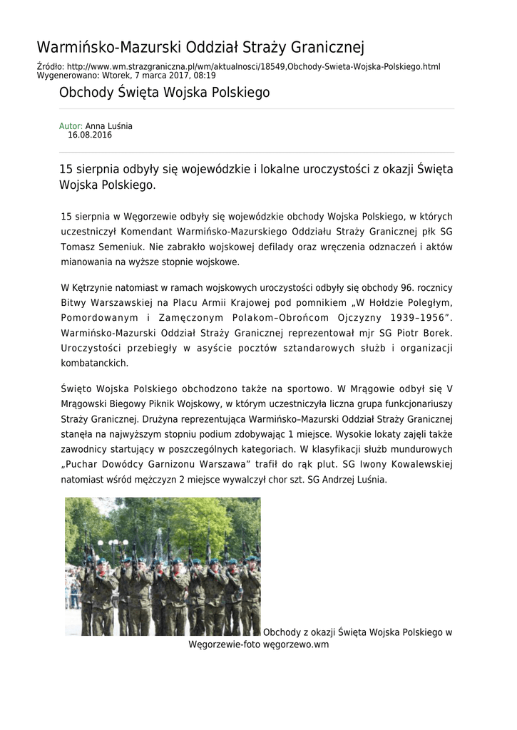 Warmińsko-Mazurski Oddział Straży Granicznej Źródło: http://www.wm.strazgraniczna.pl/wm/aktualnosci/18549,Obchody-Swieta-Wojska-Polskiego.html Wygenerowano: Wtorek, 7 marca 2017, 08:19 Obchody Święta Wojska Polskiego Autor: Anna Luśnia 16.08.2016 15 sierpnia odbyły się wojewódzkie i lokalne uroczystości z okazji Święta Wojska Polskiego. 15 sierpnia w Węgorzewie odbyły się wojewódzkie obchody Wojska Polskiego, w których uczestniczył Komendant Warmińsko-Mazurskiego Oddziału Straży Granicznej płk SG Tomasz Semeniuk. Nie zabrakło wojskowej defilady oraz wręczenia odznaczeń i aktów mianowania na wyższe stopnie wojskowe. W Kętrzynie natomiast w ramach wojskowych uroczystości odbyły się obchody 96. rocznicy Bitwy Warszawskiej na Placu Armii Krajowej pod pomnikiem „W Hołdzie Poległym, Pomordowanym i Zamęczonym Polakom–Obrońcom Ojczyzny 1939–1956”. Warmińsko-Mazurski Oddział Straży Granicznej reprezentował mjr SG Piotr Borek. Uroczystości przebiegły w asyście pocztów sztandarowych służb i organizacji kombatanckich. Święto Wojska Polskiego obchodzono także na sportowo. W Mrągowie odbył się V Mrągowski Biegowy Piknik Wojskowy, w którym uczestniczyła liczna grupa funkcjonariuszy Straży Granicznej. Drużyna reprezentująca Warmińsko–Mazurski Oddział Straży Granicznej stanęła na najwyższym stopniu podium zdobywając 1 miejsce. Wysokie lokaty zajęli także zawodnicy startujący w poszczególnych kategoriach. W klasyfikacji służb mundurowych „Puchar Dowódcy Garnizonu Warszawa” trafił do rąk plut. SG Iwony Kowalewskiej natomiast wśród mężczyzn 2 miejsce wywalczył chor szt. SG Andrzej Luśnia. Obchody z okazji Święta Wojska Polskiego w Węgorzewie-foto węgorzewo.wm Obchody z okazji Święta Wojska Polskiego w Węgorzewie-foto węgorzewo.wm Uroczystości w Kętrzynie Uroczystości w Kętrzynie Mrągowski Biegowy Piknik Wojksowy drużyna W-MOSG na podium
