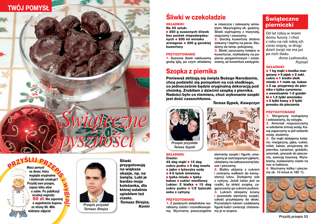 TWÓJ POMYSŁ Śliwki w czekoladzie w miseczce i zalewamy winiakiem. Marynujemy ok. godziny. Śliwki wyjmujemy z marynaty, osączamy i osuszamy. 2. Gorzką kuwerturę drobno siekamy i topimy na parze. Studzimy do temp. pokojowej. 3. Śliwki zanurzamy kolejno w kuwerturze, rozkładamy na paPRZYGOTOWANIE 1. Suszone śliwki nakłuwamy pierze pergaminowym i zostagrubą igłą, po czym układamy wiamy, aż kuwertura zastygnie. SKŁADNIKI Na 25 sztuk: ● 250 g suszonych śliwek bez pestek niepodwędzanych ● 200 ml winiaku armagnac ● 200 g gorzkiej kuwertury Szopka z piernika Ponieważ zbliżają się święta Bożego Narodzenia, chcę podzielić się pomysłem na coś słodkiego, co jednocześnie będzie oryginalną dekoracją pod choinkę. Zrobiłam z dziećmi szopkę z piernika. Radości było co niemiara, choć wykonanie szopki jest dość czasochłonne. Teresa Sypek, Kawęczyn Świąteczne pyszności Masz pomysł na deser, który wygląda oryginalnie i doskonale smakuje? Przyślij nam przepis, napisz kilka słów o sobie. Po publikacji oczekuj nagrody: 50 zł. Nie zapomnij o wypełnieniu kuponu ze strony 66. Mile widziane zdjęcia! Przepis przysłał Tomasz Strejza Śliwki przygotowuję na większe okazje, np. na święta. Lubi je bardzo moja koleżanka, dla której ostatnio upiekłem też ciasto. Tomasz Strejza, Konin Przepis przysłała Teresa Sypek elementy szopki i figurki, smarujemy je roztrzepanym jajkiem, układamy na natłuszczonej blasze i pieczemy. 2. Białka ubijamy z cukrem i ucieramy wałkiem do konsystencji lukru. Dodajemy sok z cytryny. Jeżeli lukier jest za rzadki, by skleić szopkę, zagęszczamy go cukrem pudrem. 3. Lukrem sklejamy ściany i pozostałe elementy szopki, całość przyklejamy do deski. PRZYGOTOWANIE 1. Z podanych składników wy- Pozostałym lukrem ozdabiamy rabiamy ciasto i rozwałkowuje- figurki ludzi i zwierząt. Ustawiamy. Wycinamy poszczególne my je w szopce. SKŁADNIKI Ciasto: 45 dag mąki ● 15 dag cukru pudru ● 5 dag masła ● jajko ● łyżeczka sody ● 4-5 łyżek śmietany ● łyżka miodu ● łyżka kakao ● cukier waniliowy Lukier: 2 białka ● 15 dag cukru pudru ● 1/2 łyżeczki soku z cytryny Świąteczne pierniczki Od lat robią w moim domu furorę. I choć z roku na rok robię ich coraz więcej, w drugi dzień świąt nie ma już po nich śladu. Anna Laskowska, Poznań SKŁADNIKI ● 1 kg mąki ● kostka margaryny ● 5 jajek ● 2 szkl. cukru ● 1 średni słoik miodu ● 1 małe op. kakao ● 2 op. przyprawy do piernika ● łyżka cynamonu ● ewentualnie 1-2 goździki ● 1,5 łyżki amoniaku ● 2 łyżki kawy ● 2 łyżki proszku do pieczenia PRZYGOTOWANIE 1. Margarynę roztapiamy i odstawiamy, by ostygła. 2. Amoniak rozpuszczamy w odrobinie zimnej wody. Kawę zaparzamy w pół szklanki wody, studzimy. 3. Do mąki dodajemy kolejno: margarynę, jajka, cukier, miód, kakao, przyprawę do piernika, cynamon, goździki, amoniak, proszek do pieczenia, esencję kawową. Wyrabiamy, zostawiamy ciasto na noc w lodówce. 4. Wycinamy kółka i pieczemy ok. 10 minut w 180 °C. Przyślij przepis 53