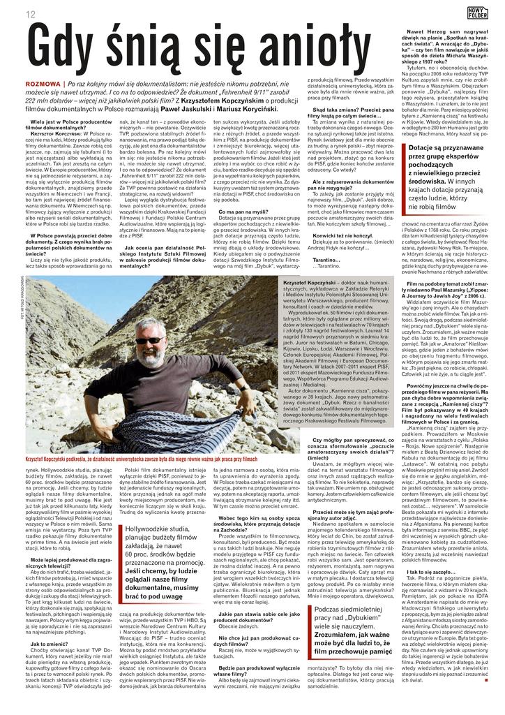 12 Gdy śnią się anioły ROZMOWA | Po raz kolejny mówi się dokumentalistom: nie jesteście nikomu potrzebni, nie możecie się nawet utrzymać. I co na to odpowiedzieć? Że dokument „Fahrenheit 9/11” zarobił 222 mln dolarów – więcej niż jakikolwiek polski film? Z Krzysztofem Kopczyńskim o produkcji filmów dokumentalnych w Polsce rozmawiają Paweł Jaskulski i Mariusz Koryciński. Wielu jest w Polsce producentów filmów dokumentalnych? Krzysztof Kopczyński: W Polsce raczej nie ma ludzi, którzy produkują tylko filmy dokumentalne. Zawsze robią coś jeszcze, np. zajmują się fabułami (i to jest najczęstsze) albo wykładają na uczelniach. Tak jest zresztą na całym świecie. W Europie producentów, którzy nie są jednocześnie reżyserami, a zajmują się wyłącznie produkcją filmów dokumentalnych, znajdziemy przede wszystkim w Niemczech i we Francji, bo tam jest najwięcej źródeł finansowania dokumentu. W Niemczech są np. filmowcy żyjący wyłącznie z produkcji albo reżyserii seriali dokumentalnych, które w Polsce robi się bardzo rzadko. Jak ocenia pan działalność Polskiego Instytutu Sztuki Filmowej w zakresie produkcji filmów dokumentalnych? ten sukces wykorzysta. Jeśli udałoby się zwiększyć kwotę przeznaczaną rocznie z różnych źródeł, a przede wszystkim z PISF, na produkcję dokumentów i zmniejszyć biurokrację, więcej utalentowanych ludzi zajmowałoby się produkowaniem filmów. Jeżeli ktoś jest zdolny i ma wybór, co chce robić w życiu, bardzo rzadko decyduje się spędzić je na wypełnianiu kolejnych papierków, z czego przecież nic nie wynika. Za dyskusyjny uważam też system przyznawania dotacji w PISF, choć środowisku on się podoba. Co ma pan na myśli? Dotacje są przyznawane przez grupę ekspertów pochodzących z niewielkiego przecież środowiska. W innych krajach dotacje przyznają często ludzie, którzy nie robią filmów. Dzięki temu mniej dbają o układy środowiskowe. Kiedy ubiegałem się o podwyższenie dotacji Szwedzkiego Instytutu Filmowego na mój film „Dybuk”, wystarczy- FOT. WITOLD KRASSOWSKI W Polsce powstają przecież dobre dokumenty. Z czego wynika brak popularności polskich dokumentów na świecie? Liczy się nie tylko jakość produktu, lecz także sposób wprowadzania go na nak, że kanał ten – z powodów ekonomicznych – nie powstanie. Oczywiście TVP, pozbawiona stabilnych źródeł finansowania, ma prawo podjąć taką decyzję, ale jest ona dla dokumentalistów bardzo bolesna. Po raz kolejny mówi im się: nie jesteście nikomu potrzebni, nie możecie się nawet utrzymać. I co na to odpowiedzieć? Że dokument „Fahrenheit 9/11” zarobił 222 mln dolarów – więcej niż jakikolwiek polski film? Że TVP powinna postawić na działania strategiczne, na rozwój widowni? Lepiej wygląda dystrybucja festiwalowa polskich dokumentów, przede wszystkim dzięki Krakowskiej Fundacji Filmowej i Fundacji Polskie Centrum Audiowizualne, które wspierają ją logistycznie i finansowo. Mają na to pieniądze z PISF. z produkcją filmową. Przede wszystkim działalnością uniwersytecką, która zawsze była dla mnie równie ważna, jak praca przy filmach. Skąd taka zmiana? Przecież pana filmy krążą po całym świecie… Ta zmiana wynika z naturalnej potrzeby dokonania czegoś nowego. Ocena sytuacji rynkowej także jest istotna. Rynek światowy jest dla mnie obecnie za trudny, a rynek polski – zbyt nieprzewidywalny. Można pracować dwa lata nad projektem, złożyć go na konkurs do PISF, gdzie koniec końców zostanie odrzucony. Co wtedy? Ale z reżyserowania dokumentów pan nie rezygnuje? To zależy, jak zostanie przyjęty mój najnowszy film, „Dybuk”. Jeśli dobrze, to może wyreżyseruję następny dokument, choć jako filmowiec mam czasem poczucie amatorszczyzny swoich działań. Nie kończyłem szkoły filmowej… Konwicki też nie kończył. Dziękuję za to porównanie. (śmiech) Andrzej Fidyk nie kończył… Tarantino… …Tarantino. Krzysztof Kopczyński – doktor nauk humanistycznych, wykładowca w Zakładzie Retoryki i Mediów Instytutu Polonistyki Stosowanej Uniwersytetu Warszawskiego, producent filmowy, konsultant i coach w dziedzinie mediów. Wyprodukował ok. 50 filmów i cykli dokumentalnych, które były oglądane przez miliony widzów w telewizjach i na festiwalach w 70 krajach i zdobyły 130 nagród festiwalowych. Laureat 14 nagród filmowych przyznanych w siedmiu krajach. Juror na festiwalach w Batumi, Chicago, Kijowie, Lipsku, Łodzi, Warszawie i Wrocławiu. Członek Europejskiej Akademii Filmowej, Polskiej Akademii Filmowej i European Documentary Network. W latach 2007–2011 ekspert PISF, od 2011 ekspert Mazowieckiego Funduszu Filmowego. Współtwórca Programu Edukacji Audiowizualnej i Medialnej. Autor dokumentu „Kamienna cisza”, pokazywanego w 39 krajach. Jego nowy pełnometrażowy dokument „Dybuk. Rzecz o banalności świata” został zakwalifikowany do międzynarodowego konkursu filmów dokumentalnych tegorocznego Krakowskiego Festiwalu Filmowego. Krzysztof Kopczyński podkreśla, że działalność uniwersytecka zawsze była dla niego równie ważna jak praca przy filmach rynek. Hollywoodzkie studia, planując budżety filmów, zakładają, że nawet 60 proc. środków będzie przeznaczone na promocję. Jeśli chcemy, by ludzie oglądali nasze filmy dokumentalne, musimy brać to pod uwagę. Nie jest już tak jak przed kilkunastu laty, kiedy pokazywaliśmy film w paśmie wysokiej oglądalności Telewizji Polskiej i od razu wszyscy w Polsce o nim mówili. Sama emisja nie wystarczy. Poza tym TVP rzadko pokazuje filmy dokumentalne w prime time. A na świecie jest wiele stacji, które to robią. Może lepiej produkować dla zagranicznych telewizji? Aby do nich trafić, trzeba wiedzieć, jakich filmów potrzebują, i mieć wsparcie z własnego kraju, przede wszystkim ze strony osób odpowiedzialnych za produkcję i zakupy dla stacji telewizyjnych
