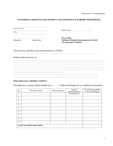 Załącznik nr 1 do Regulaminu WNIOSEK O PRZYZNANIE POMOCY FINANSOWEJ W FORMIE PIENIĘŻNEJ ……………………………………………… Nazwisko i Imię …………………………………………….. Żabno, dnia …………………………….. Adres …………………………………………….. …………………….. Jednostka ………………….. Stanowisko Kierownik Zakładu Obsługi Samorządowych Szkół i Przedszkoli w Żabnie Zwracam się z prośbą o przyznanie pomocy w formie: ………………………………………………………………………………………………… Prośbę motywuję tym, że: ………………………………………………………………………………………………………… ………………………………………………………………………………………………………… ………………………………………………………………………………………………………… ………………………………………………………………………………………………………… ………………………………………………………………………………………………………… ………………………………………………………… ………………………………………………………………………………………………… ………………………………………………………………………………………………… Dane dotyczące członków rodziny* Oświadczam, że moja rodzina składa się z ………osoby/osób będących na wspólnym utrzymaniu. Lp. Nazwisko i Imię 1. Data urodzenia Stopień pokrewieństwa* wnioskodawca Wysokość przychodu w zł za rok ubiegły 2. 3. 4. 5. 6. 7. 8. 9. Łączny przychód całej rodziny 1 Oświadczam, że wysokość przychodu miesięcznego przypadającego na jednego członka rodziny wynosi …………………….. zł ………………………………………………. (słownie) Potwierdzam prawdziwość danych własnoręcznym podpisem i jestem świadom odpowiedzialności karnej, że za składanie fałszywych zeznań, zgodnie z art. 233§1 K.K. grozi kara pozbawienia wolności do lat trzech. ……………………………………. (Data i podpis wnioskodawcy) Decyzja o przyznaniu świadczenia: Komisja na posiedzeniu w dniu …………….. przyznała/nie przyznała dofinansowania do ………………………… w kwocie: ……………zł (słownie: ….……………………………..) Żabno, dnia ………………………… podpisy komisji: ………………….. przedstawiciel ZNP …………………. przedstawiciel NSZZ Solidarność ……………………… dyrektor szkoły ……………………………. kierownik ZOSSiP * zgodnie z § 3 ust.2 i § 5 ust 8 Regulaminu ZFŚŚ do uprawnionych członków rodziny pozostających na utrzymaniu osoby uprawnionej do korzystania z Funduszu zalicza się: a) dzieci własne, przysposobione oraz przyjęte na wychowanie w ramach rodziny zastępczej do ukończenia 18 roku życia, a jeżeli się kształcą w szkole - do czasu ukończenia nauki, nie dłużej jednak niż do ukończenia 25 lat Podstawą ustalenia średniego przychodu przypadającego na jednego członka rodziny jest suma wszystkich przychodów wszystkich osób stanowiących rodzinę z roku poprzedzającego złożenie wniosku wyliczonego na podstawie zeznania podatkowego od osób opodatkowanych podatkiem dochodowym od osób fizycznych, dochody opodatkowane podatkiem dochodowym zryczałtowanym i kwot wypłaconych z tytułu pełnienia funkcji społecznych i obywatelskich oraz dochodu z gospodarstwa rolnego wyliczane na podstawi art. 8 ust 9 ustawy o pomocy społecznej podzielonych przez liczbę członków rodziny i liczbę 12 miesięcy. 2
