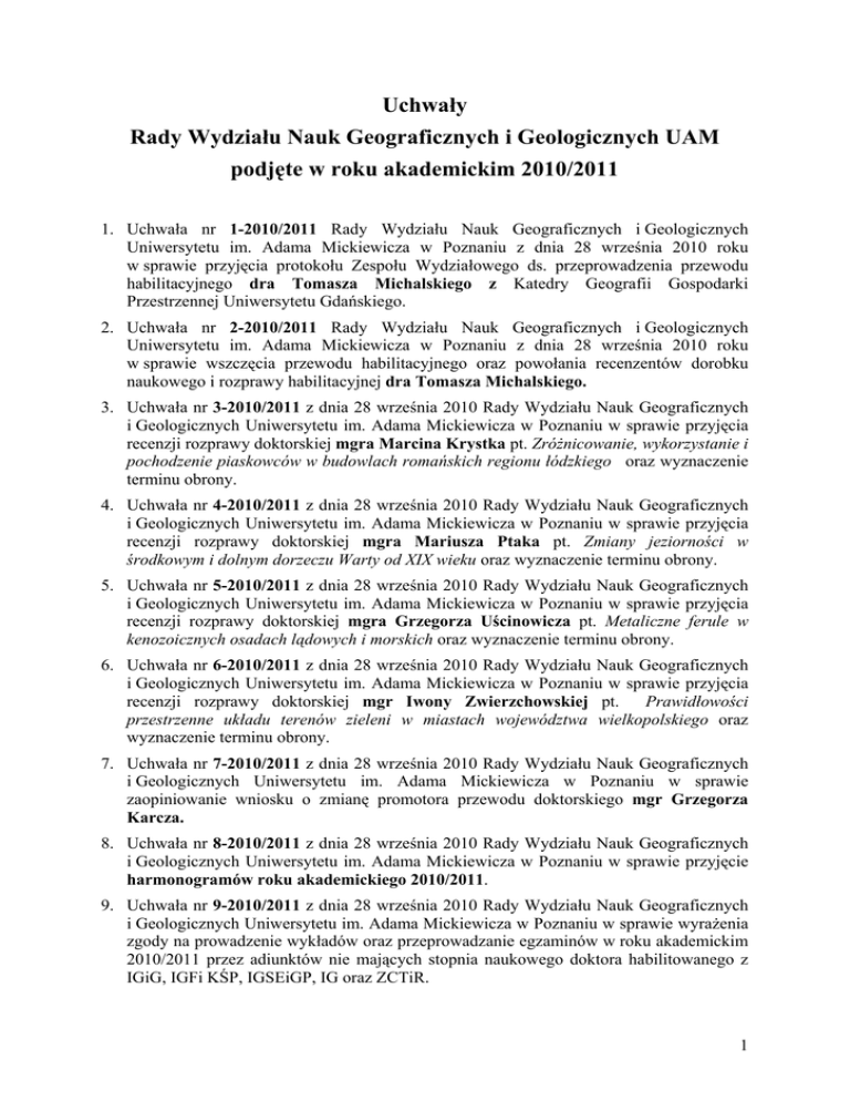 Uchwały Rady Wydziału Nauk Geograficznych i Geologicznych UAM podjęte w roku akademickim 2010/2011 1. Uchwała nr 1-2010/2011 Rady Wydziału Nauk Geograficznych i Geologicznych Uniwersytetu im. Adama Mickiewicza w Poznaniu z dnia 28 września 2010 roku w sprawie przyjęcia protokołu Zespołu Wydziałowego ds. przeprowadzenia przewodu habilitacyjnego dra Tomasza Michalskiego z Katedry Geografii Gospodarki Przestrzennej Uniwersytetu Gdańskiego. 2. Uchwała nr 2-2010/2011 Rady Wydziału Nauk Geograficznych i Geologicznych Uniwersytetu im. Adama Mickiewicza w Poznaniu z dnia 28 września 2010 roku w sprawie wszczęcia przewodu habilitacyjnego oraz powołania recenzentów dorobku naukowego i rozprawy habilitacyjnej dra Tomasza Michalskiego. 3. Uchwała nr 3-2010/2011 z dnia 28 września 2010 Rady Wydziału Nauk Geograficznych i Geologicznych Uniwersytetu im. Adama Mickiewicza w Poznaniu w sprawie przyjęcia recenzji rozprawy doktorskiej mgra Marcina Krystka pt. Zróżnicowanie, wykorzystanie i pochodzenie piaskowców w budowlach romańskich regionu łódzkiego oraz wyznaczenie terminu obrony. 4. Uchwała nr 4-2010/2011 z dnia 28 września 2010 Rady Wydziału Nauk Geograficznych i Geologicznych Uniwersytetu im. Adama Mickiewicza w Poznaniu w sprawie przyjęcia recenzji rozprawy doktorskiej mgra Mariusza Ptaka pt. Zmiany jeziorności w środkowym i dolnym dorzeczu Warty od XIX wieku oraz wyznaczenie terminu obrony. 5. Uchwała nr 5-2010/2011 z dnia 28 września 2010 Rady Wydziału Nauk Geograficznych i Geologicznych Uniwersytetu im. Adama Mickiewicza w Poznaniu w sprawie przyjęcia recenzji rozprawy doktorskiej mgra Grzegorza Uścinowicza pt. Metaliczne ferule w kenozoicznych osadach lądowych i morskich oraz wyznaczenie terminu obrony. 6. Uchwała nr 6-2010/2011 z dnia 28 września 2010 Rady Wydziału Nauk Geograficznych i Geologicznych Uniwersytetu im. Adama Mickiewicza w Poznaniu w sprawie przyjęcia recenzji rozprawy doktorskiej mgr Iwony Zwierzchowskiej pt. Prawidłowości przestrzenne układu terenów zieleni w miastach województwa wielkopolskiego oraz wyznaczenie terminu obrony. 7. Uchwała nr 7-2010/2011 z dnia 28 września 2010 Rady Wydziału Nauk Geograficznych i Geologicznych Uniwersytetu im. Adama Mickiewicza w Poznaniu w sprawie zaopiniowanie wniosku o zmianę promotora przewodu doktorskiego mgr Grzegorza Karcza. 8. Uchwała nr 8-2010/2011 z dnia 28 września 2010 Rady Wydziału Nauk Geograficznych i Geologicznych Uniwersytetu im. Adama Mickiewicza w Poznaniu w sprawie przyjęcie harmonogramów roku akademickiego 2010/2011. 9. Uchwała nr 9-2010/2011 z dnia 28 września 2010 Rady Wydziału Nauk Geograficznych i Geologicznych Uniwersytetu im. Adama Mickiewicza w Poznaniu w sprawie wyrażenia zgody na prowadzenie wykładów oraz przeprowadzanie egzaminów w roku akademickim 2010/2011 przez adiunktów nie mających stopnia naukowego doktora habilitowanego z IGiG, IGFi KŚP, IGSEiGP, IG oraz ZCTiR. 1 10. Uchwała nr 10-2010/2011 z dnia 28 września 2010 Rady Wydziału Nauk Geograficznych i Geologicznych Uniwersytetu im. Adama Mickiewicza w Poznaniu w sprawie wyrażenia zgody na prowadzenie prac magisterskich oraz seminariów przez adiunktów nie mających stopnia naukowego doktora habilitowanego z IGFiKŚP, IG, IGSEiGP oraz ZCTiR. 11. Uchwała nr 11-2010/2011 z dnia 28 września 2010 Rady Wydziału Nauk Geograficznych i Geologicznych Uniwersytetu im. Adama Mickiewicza w Poznaniu w sprawie pozytywnego zaopiniowania wniosków o przyznanie stypendiów MNiSW za osiągnięcia w nauce dla Inez Beszterdy, Joanny Fabiś, Janusza Górnego, Rafała Smyka oraz wybitne osiągnięcia sportowe dla Michaliniy, Eleonory Kryszak i Romana Wesołowskiego. 12. Uchwała nr 12-2010/2011 z dnia 28 września 2010 Rady Wydziału Nauk Geograficznych i Geologicznych Uniwersytetu im. Adama Mickiewicza w Poznaniu w sprawie pozytywnego zaopiniowania wniosków o przyznanie Medalu Uniwersytetu im. Adama Mickiewicza mgr Ewie Głosińskiej. 13. Uchwała nr 13-2010/2011 z dnia 28 września 2010 Rady Wydziału Nauk Geograficznych i Geologicznych Uniwersytetu im. Adama Mickiewicza w Poznaniu w sprawie przyjęcia sprawozdań z wyników rekrutacji na rok akademicki 2010/2011. 14. Uchwała nr 14-2010/2011 z dnia 28 września 2010 Rady Wydziału Nauk Geograficznych i Geologicznych Uniwersytetu im. Adama Mickiewicza w Poznaniu w sprawie powołania na kuratora Zakładu Gospodarki Przestrzennej prof. UAM dr hab. Waldemara Ratajczaka. 15. Uchwała nr 15-2010/2011 z dnia 28 września 2010 Rady Wydziału Nauk Geograficznych i Geologicznych Uniwersytetu im. Adama Mickiewicza w Poznaniu w sprawie powołania prof. zw. dr hab. Adama Choińskiego na członka Uczelnianego Zespołu Odwoławczego. 16. Uchwała nr 16-2010/2011 z dnia 28 września 2010 Rady Wydziału Nauk Geograficznych i Geologicznych Uniwersytetu im. Adama Mickiewicza w Poznaniu w sprawie udzielenia dr Leszkowi Sobkowiakowi urlopu szkoleniowego w terminie od 02.01.2011do 28.02.2011, urlopu na przygotowanie rozprawy habilitacyjnej w terminie od 01.03.2011 do 30.04.2011) oraz urlopu naukowego bezpłatnego w terminie 02.05.2011 do 31. 08 2011. 17. Uchwała nr 17-2010/2011 z dnia 28 września 2010 Rady Wydziału Nauk Geograficznych i Geologicznych Uniwersytetu im. Adama Mickiewicza w Poznaniu w sprawie udzielenia dr Agacie Buchwał urlopu szkoleniowego w terminie od 01.10.2010 do 30.11.2010 oraz naukowego bezpłatnego w terminie od 01.12.2010 do 31.08.2011. 18. Uchwała nr 18-2010/2011 z dnia 28 września 2010 Rady Wydziału Nauk Geograficznych i Geologicznych Uniwersytetu im. Adama Mickiewicza w Poznaniu w sprawie udzielenia dr Robertowi Kudłakowi urlopu szkoleniowego w terminie od 01.11.2010 do 31.12.2010 oraz urlopu bezpłatnego w terminie od 01.01.2011 do 30.09.2012. 19. Uchwała nr 19-2010/2011 z dnia 28 września 2010 Rady Wydziału Nauk Geograficznych i Geologicznych Uniwersytetu im. Adama Mickiewicza w Poznaniu w sprawie pozytywnego zaopiniowania wniosku o zmian