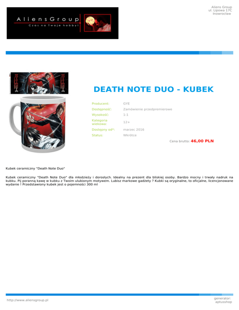 Aliens Group ul. Lipowa 17C Inowrocław DEATH NOTE DUO - KUBEK Producent: GYE Dostępność: Zamówienie przedpremierowe Wysokość: 1:1 Kategoria wiekowa: 12+ Dostępny od*: marzec 2016 Status: Wkrótce Cena brutto: 46,00 PLN Kubek ceramiczny "Death Note Duo" Kubek ceramiczny "Death Note Duo" dla młodzieży i dorosłych. Idealny na prezent dla bliskiej osoby. Bardzo mocny i trwały nadruk na kubku. Pij poranną kawę w kubku z Twoim ulubionym motywem. Lubisz markowe gadżety ? Kubki są oryginalne, to oficjalne, licencjonowane wydanie ! Przedstawiony kubek jest o pojemności 300 ml http://www.aliensgroup.pl generator: aptusshop