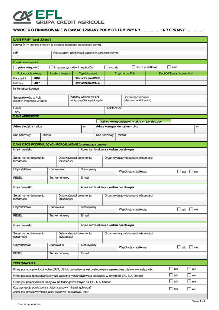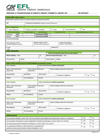 WNIOSEK O FINANSOWANIE W RAMACH ZMIANY PODMIOTU UMOWY NR ......................... NR SPRAWY ...................... DANE FIRMY (dalej „Klient”) Nazwa firmy (zgodnie z wpisem do ewidencji działalności gospodarczej lub KRS) Podstawowa działalność (zgodnie ze stanem faktycznym) NIP Forma księgowości pełna księgowość księga pr zychodów i r ozchodów Liczba miesięcy Rok obrachunkowy karta podatkowa r yczałt Przychód w PLN Typ dokumentu Poprzedni 2016 Oświadczenie/RZiS Bieżący 2017 Oświadczenie/RZiS inna Dochód/Strata (brutto w PLN) Nr konta bankowego Kapitały własne w PLN (dotyczy spółek kapitałowych) Suma aktywów w PLN (na dzień wypełniania wniosku) E-mail Liczba pracowników (włącznie z właścicielami) Telefon/Fax nbv DANE ADRESOWE Adres korespondencyjny taki sam jak siedziby Adres siedziby – ulica Kod pocztowy nr Miasto Adres korespondencyjny – ulica Kod pocztowy nr Miasto DANE OSÓB PODPISUJĄCYCH POROZUMIENIE (przejmujący umowę) Imię i nazwisko Seria i numer dokumentu tożsamości Adres zamieszkania z kodem pocztowym Data ważności dokumentu tożsamości Obywatelstwo Stanowisko Stan cywilny PESEL Tel. komórkowy E-mail Imię i nazwisko Seria i numer dokumentu tożsamości Wspólnota majątkowa: tak nie tak nie tak nie Adres zamieszkania z kodem pocztowym Data ważności dokumentu tożsamości Obywatelstwo Stanowisko Stan cywilny PESEL Tel. komórkowy E-mail Imię i nazwisko Seria i numer dokumentu tożsamości Organ wydający dokument tożsamości Organ wydający dokument tożsamości Wspólnota majątkowa: Adres zamieszkania z kodem pocztowym Data ważności dokumentu tożsamości Obywatelstwo Stanowisko Stan cywilny PESEL Tel. komórkowy E-mail Organ wydający dokument tożsamości Wspólnota majątkowa: ZOBOWIĄZANIA Firma posiada zaległości wobec ZUS, US lub prowadzone jest postępowanie egzekucyjne z tytułu ww. należności tak nie Firma posiada zobowiązania z tytułu zaciągniętych kredytów lub leasingów w innych niż EFL S.A. firmach tak nie Firma jest poręczycielem kredytów lub leasingów w innych niż EFL S.A. firmach tak nie Czy występują powiązania z dotychczasowym Leasingobiorcą? Jeżeli tak, proszę wymienić jakie: osobowe /kapitałowe / inne* tak nie Strona 1 z 4 *zaznaczyć właściwe OŚWIADCZENIE* 1. Wyrażam zgodę na przetwarzanie moich danych osobowych przez Europejski Fundusz Leasingowy SA („EFL”), również w przyszłości, w tym przekazywane ich następującym podmiotom: 1) Credit Agricole Societe Anonyme z siedzibą w Paryżu lub 2) jednostkom powiązanym z Credit Agricole Societe Anonyme z siedzibą w Paryżu w rozumieniu ustawy z dnia 29 września 1994 r. o rachunkowości (tekst jednolity z 2009 r., Dz. U. Nr 152, poz. 1223 ze zm.) lub 3) jednostkom podporządkowanym w stosunku do EFL w rozumieniu ustawy z dnia 29 września 1994 r. o rachunkowości (tekst jednolity z 2009 r., Dz. U. Nr 152, poz. 1223 ze zm.), w tym: EFL Service S.A. z siedzibą we Wrocławiu, Carefleet S.A. z siedzibą we Wrocławiu, EFL Finance S.A. z siedzibą we Wrocławiu; Credit Agricole Bank Polska z siedzibą we Wrocławiu, Eurofactor S.A. z siedzibą w Warszawie; zwanym dalej łącznie lub osobno „Jednostkami Grupy Credit Agricole”, w celu: realizacji obowiązków sprawozdawczych dotyczących nadzoru skonsolidowanego, w tym w sporządzania skonsolidowanych sprawozdań finansowych, zarządzania lub oceny ryzyka kredytowego, stosowania metod statystycznych 2. Przetwarzanie (również w przyszłości) przez EFL oraz Jednostki Grupy Credit Agricole moich danych osobowych, w celu prowadzenia marketingu produktów lub usług Jednostek Grupy Credit Agricole oraz w celu uczestniczenia w badaniach opinii klienta, loteriach, konkursach dotyczących oferowanych przez EFL lub Jednostki Grupy Credit Agricole usług i produktów lub przedstawienia informacji o usługach i produktach innych podmiotów oferowanych za pośrednictwem EFL lub Jednostki Grupy Credit Agricole. Wyrażam zgodę Nie wyrażam 3. Otrzymywanie informacji handlowych lub ofert EFL lub Jednostek Grupy Credit Agricole, za pomocą wszelkich środków komunikacji elektronicznej w rozumieniu ustawy z dnia 18 lipca 2002 r. o świadczeniu usług drogą elektroniczną (Dz. U. Nr 144 poz. 1204 ze zm.) Wyrażam zgodę Telefon: Nie wyrażam E-mail: 4. Zgoda na dostarczanie przez EFL odpowiedzi na złożone reklamacje pocztą elektroniczną na adres e-mail wskazany w pkt 3 powyżej. Wyrażam zgodę 5. Nie wyrażam Przyjmuję do wiadomości, że: administratorem danych osobowych w rozumieniu ustawy z dnia 29 sierpnia 1997 r. o ochronie danych osobowych (tekst jednolity z 2002 r., Dz. U. Nr 101, poz. 926 ze zm.), pozyskanych w związku ze złożonym oświadczeniem o zawarcie umowy leasingu jest Europejski Fundusz Leasingowy S.A. z siedzibą we Wrocławiu (adres: pl. Orląt Lwowskich 1, 53-605 Wrocław), który będzie je przetwarzał w celu doprowadzenia do zawarcia i wykonania umowy leasingu oraz we wszystkich innych celach wskazanych w niniejszym oświadczeniu, przysługuje mi prawo dostępu do treści moich danych osobowych oraz ich poprawienia. Upoważniam Europejski Fundusz Leasingowy S.A. z siedzibą we Wrocławiu przy Pl. Orląt Lwowskich 1 do wystąpienia do Biura Informacji Gospodarczej InfoMonitor S.A. z siedzibą w Warszawie przy ul. Zygmunta Modzelewskiego 77 („BIG Infomonitor”) o ujawnienie informacji gospodarczych o moich zobowiązaniach oraz do wystąpienia za pośrednictwem BIG Infomonitor o udostępnienie z Biura Informacji Kredytowej S.A. i Związku Banków Polskich danych dotyczących mojego wymagalnego zadłużenia wobec banków lub innych instytucji ustawowo upoważnionym do udzielania kredytów, przekraczającego 200 złotych (dwieście złotych; dotyczy osoby będącej Konsumentem) oraz 500 złotych (pięćset złotych; dotyczy podmiotu będącego Przedsiębiorcą) lub braku danych o takim zadłużeniu. Okres ważności upoważnienia: - na podstawie art. 