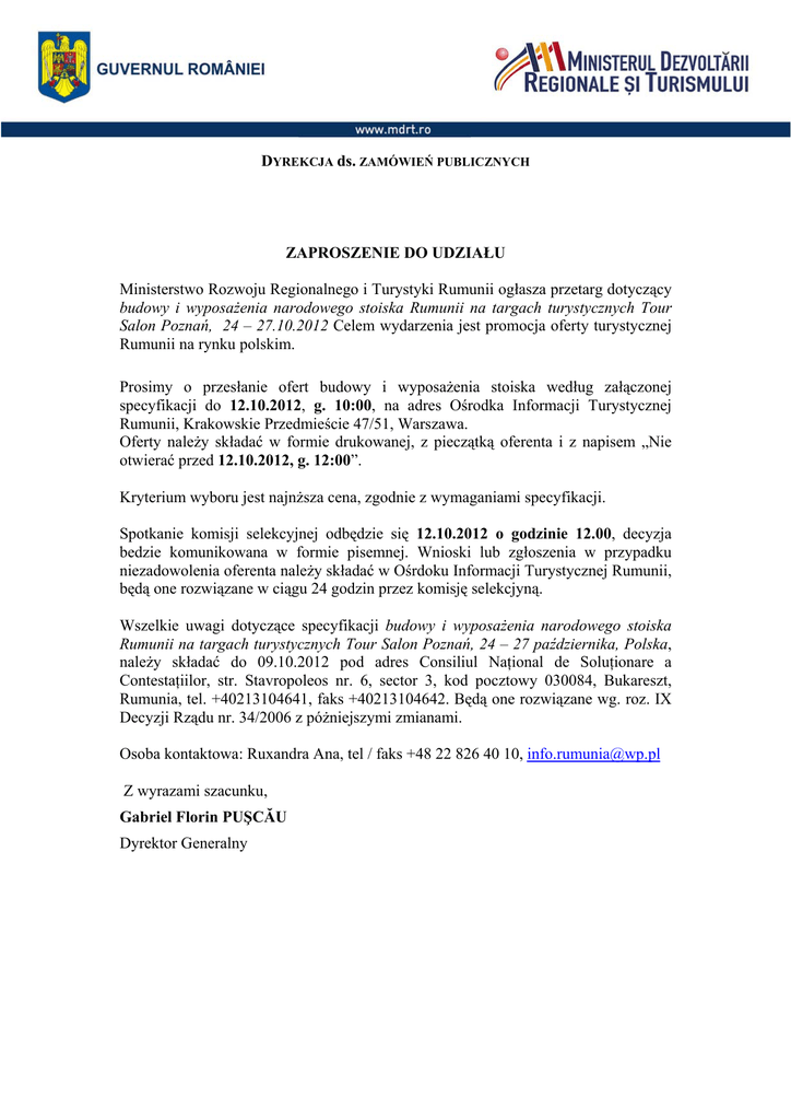 DYREKCJA ds. ZAMÓWIEŃ PUBLICZNYCH ZAPROSZENIE DO UDZIAŁU Ministerstwo Rozwoju Regionalnego i Turystyki Rumunii ogłasza przetarg dotyczący budowy i wyposażenia narodowego stoiska Rumunii na targach turystycznych Tour Salon Poznań, 24 – 27.10.2012 Celem wydarzenia jest promocja oferty turystycznej Rumunii na rynku polskim. Prosimy o przesłanie ofert budowy i wyposażenia stoiska według załączonej specyfikacji do 12.10.2012, g. 10:00, na adres Ośrodka Informacji Turystycznej Rumunii, Krakowskie Przedmieście 47/51, Warszawa. Oferty należy składać w formie drukowanej, z pieczątką oferenta i z napisem „Nie otwierać przed 12.10.2012, g. 12:00”. Kryterium wyboru jest najnższa cena, zgodnie z wymaganiami specyfikacji. Spotkanie komisji selekcyjnej odbędzie się 12.10.2012 o godzinie 12.00, decyzja bedzie komunikowana w formie pisemnej. Wnioski lub zgłoszenia w przypadku niezadowolenia oferenta należy składać w Ośrdoku Informacji Turystycznej Rumunii, będą one rozwiązane w ciągu 24 godzin przez komisję selekcjyną. Wszelkie uwagi dotyczące specyfikacji budowy i wyposażenia narodowego stoiska Rumunii na targach turystycznych Tour Salon Poznań, 24 – 27 października, Polska, należy składać do 09.10.2012 pod adres Consiliul Naţional de Soluţionare a Contestaţiilor, str. Stavropoleos nr. 6, sector 3, kod pocztowy 030084, Bukareszt, Rumunia, tel. +40213104641, faks +40213104642. Będą one rozwiązane wg. roz. IX Decyzji Rządu nr. 34/2006 z póżniejszymi zmianami. Osoba kontaktowa: Ruxandra Ana, tel / faks +48 22 826 40 10, [email protected] Z wyrazami szacunku, Gabriel Florin PUŞCĂU Dyrektor Generalny