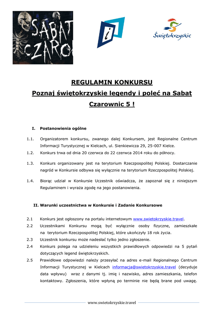 REGULAMIN KONKURSU Poznaj świętokrzyskie legendy i poleć na Sabat Czarownic 5 ! I. 1.1. Postanowienia ogólne Organizatorem konkursu, zwanego dalej Konkursem, jest Regionalne Centrum Informacji Turystycznej w Kielcach, ul. Sienkiewicza 29, 25-007 Kielce. 1.2. Konkurs trwa od dnia 20 czerwca do 22 czerwca 2014 roku do północy. 1.3. Konkurs organizowany jest na terytorium Rzeczpospolitej Polskiej. Dostarczanie nagród w Konkursie odbywa się wyłącznie na terytorium Rzeczpospolitej Polskiej. 1.4. Biorąc udział w Konkursie Uczestnik oświadcza, że zapoznał się z niniejszym Regulaminem i wyraża zgodę na jego postanowienia. II. Warunki uczestnictwa w Konkursie i Zadanie Konkursowe 2.1 Konkurs jest ogłoszony na portalu internetowym www.swietokrzyskie.travel. 2.2 Uczestnikami Konkursu mogą być wyłącznie osoby fizyczne, zamieszkałe na terytorium Rzeczpospolitej Polskiej, które ukończyły 18 rok życia. 2.3 Uczestnik konkursu może nadesłać tylko jedno zgłoszenie. 2.4 Konkurs polega na udzieleniu wszystkich prawidłowych odpowiedzi na 5 pytań dotyczących legend świętokrzyskich. 2.5 Prawidłowe odpowiedzi należy przesyłać na adres e-mail Regionalnego Centrum Informacji Turystycznej w Kielcach [email protected] (decyduje data wpływu) wraz z danymi tj. imię i nazwisko, adres zamieszkania, telefon kontaktowy. Zgłoszenia, które wpłyną po terminie nie będą brane pod uwagę. www.swietokrzyskie.travel Wyniki konkursu zostaną zamieszczone 23 czerwca 2014 r. na portalu www.swietokrzyskie.travel. 2.6 Każdy Uczestnik w czasie trwania Konkursu może przesłać tylko jedno zgłoszenie. Wzięcie na udziału w konkursie umieszczenie adresu jest jednoznaczne e-mail w z bazie zezwoleniem autora newsletter portalu www.swietokrzyskie.travel . 2.7 Organizatorzy nie ponoszą odpowiedzialności za niedotarcie lub opóźnione dotarcie zgłoszenia do Organizatora. 2.8 Organizatorzy zastrzegają sobie prawo do wykluczenia z udziału w Konkursie tych osób, które nie przestrzegają postanowień Regulaminu. 2.9 Udział w Konkursie i podanie związanych z udziałem danych jest całkowicie dobrowolne. III. Nagrody w Konkursie 3.1 Nagrody to 20 podwójnych zaproszeń na koncert „Sabat Czarownic 5”, który odbędzie się dnia 27 czerwca 2014 roku w Kielcach. 1 wylosowanej osobie przysługują 2 zaproszenia. 3.2 Zdobywca nagrody w Konkursie nie może żądać wymiany nagrody na jej równowartość pieniężną ani na nagrodę innego rodzaju. 3.3 Uczestnika, któremu zostaną wydane zaproszenia obowiązuje całkowity zakaz sprzedaży zaproszeń pod groźbą kary i ścigania prawnego. IV. Zasady przyznawania i wydawania nagród w Konkursie 5.1 Wśród osób, które prześlą prawidłowe odpowiedzi zostanie wylosowanych 20, które otrzymają podwójne zaproszenia na koncert. Zaproszenia będą do odbioru w siedzibie Regionalnego Centrum Informacji Turystycznej w Kielcach w godzinach pracy placówki, poczynając od dnia następującego po dacie ogłoszenia wyników konkursu. Decyzja Organizatora o przyznaniu nieodwołalna. www.swietokrzyskie.travel nagród jest ostateczna i 5.2 Nagrodę można odebrać wyłącznie osobiście w biurze Regionalnego Centrum Informacji Turystycznej w Kielcach w godzinach pracy placówki. Wszelkiego rodzaju pisemne upoważnienia nie będą brane pod uwagę. 5.3 Wydanie nagród nastąpi wyłącznie po okazaniu dowodu osobistego i podaniu adresu-email, z którego zgłoszenie zostało wysłane. V. 6.1 Postępowanie reklamacyjne Reklamacje, co do przebiegu Konkursu mogą być zgłaszane pisemnie na adres Organizatora: Regionalne Centrum Informacji Turystycznej w Kielcach, ul. Sienkiewicza 29, 25-007 Kielce. O zachowaniu terminu składania reklamacji decyduje data dotarcia reklamacji pod wskazany w niniejszym punkcie adres. 6.2 Prawo złożenia reklamacji przysługuje jedynie Uczestnikom Konkursu. Pisemna reklamacja powinna zawierać imię, nazwisko i dokładny adres Uczestnika, jak również dokładny opis i wskazanie przyczyny reklamacji. Reklamacje rozpatrywane są przez Komisję Konkursową w terminie 14 dni od dnia doręczenia Organizatorowi. 6.3 Organizator rozpatrywać będzie reklamacje Uczestników na podstawie Regulaminu. 6.4 Decyzja Organizatora w przedmiocie reklamacji jest ostateczna i wiążąca. Uczestnik o decyzji Organizatora zostanie powiadomiony listem poleconym na adres podany w reklamacji w terminie 7 dni od daty rozpatrzenia reklamacji. VI. Postanowienia końcowe 6.2 Organizator zastrzega sobie prawo dokonywania zmian w Regulaminie w czasie trwania Konkursu. Zmiany te obowiązują od dnia zamieszczenia ich na stronach internetowych. 6.3 Wszelkie spory wynikłe z tytułu wykonania zobowiązań związanych z niniejszym Konkursem będą rozstrzygane przez Sąd właściwy według siedziby Organizatora. www.swietokrzyskie.travel 6.4 Zasady przeprowadzania Wszelkie materiały Konkursu określa wyłącznie niniejszy Regulamin. mają charakter wyłącznie promocyjno-reklamowe informacyjny. 6.5 Uczestnicy ponoszą pełną odpowiedzialność za zgodność z prawdą danych podanych w związku z Konkursem. 6.6 Organizator nie ponosi odpowiedzialności za skutki podania przez Uczestnika nieprawdziwych danych lub danych innej osoby. 6.7 Organizator nie ponosi odpowiedzialności za niemożność odbioru nagrody z przyczyn leżących po stronie laureata Konkursu. 6.8 Organizator nie ponosi odpowiedzialności za opóźnienia lub jakiekolwiek przeszkody w komunikacji z Uczestnikami Konkursu wynikające z przyczyn niezależnych od niego. 6.9 Administratorem Informacji danych Turystycznej Przetwarzanie danych osobowych w uczestników Kielcach, osobowych ul. jest Regionalne Sienkiewicza uczestników Konkursu 29, 25-007 Centrum Kielce. następuje zgodnie z ustawą z dnia 29 sierpnia 1997 r. o ochronie danych osobowych (tekst jedn. Dz. U. z 2002 r. nr 101 poz. 926 z późn. zm.). Podanie danych osobowych jest dobrowolne jednak niezbędne do wzięcia udziału w Konk