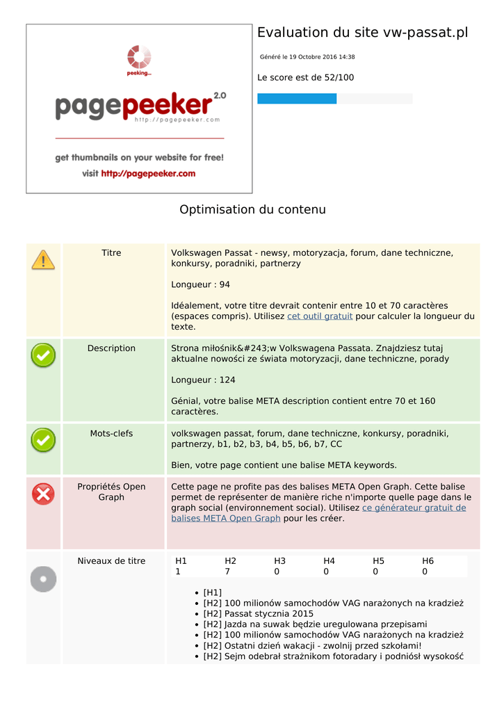 Evaluation du site vw-passat.pl Généré le 19 Octobre 2016 14:38 Le score est de 52/100 Optimisation du contenu Titre Volkswagen Passat - newsy, motoryzacja, forum, dane techniczne, konkursy, poradniki, partnerzy Longueur : 94 Idéalement, votre titre devrait contenir entre 10 et 70 caractères (espaces compris). Utilisez cet outil gratuit pour calculer la longueur du texte. Description Strona miłośników Volkswagena Passata. Znajdziesz tutaj aktualne nowości ze świata motoryzacji, dane techniczne, porady Longueur : 124 Génial, votre balise META description contient entre 70 et 160 caractères. Mots-clefs volkswagen passat, forum, dane techniczne, konkursy, poradniki, partnerzy, b1, b2, b3, b4, b5, b6, b7, CC Bien, votre page contient une balise META keywords. Propriétés Open Graph Niveaux de titre Cette page ne profite pas des balises META Open Graph. Cette balise permet de représenter de manière riche n'importe quelle page dans le graph social (environnement social). Utilisez ce générateur gratuit de balises META Open Graph pour les créer. H1 1 H2 7 [H1] [H2] [H2] [H2] [H2] [H2] [H2] H3 0 H4 0 H5 0 H6 0 100 milionów samochodów VAG narażonych na kradzież Passat stycznia 2015 Jazda na suwak będzie uregulowana przepisami 100 milionów samochodów VAG narażonych na kradzież Ostatni dzień wakacji - zwolnij przed szkołami! Sejm odebrał strażnikom fotoradary i podniósł wysokość Optimisation du contenu mandatów [H2] Fotoradary strażników zakazane Images Nous avons trouvé 23 image(s) sur cette page Web. 19 attribut(s) alt sont vides ou manquants. Ajouter un texte alternatif permet aux moteurs de recherche de mieux comprendre le contenu de vos images. Ratio texte/HTML Ratio : 29% Idéal! le ratio de cette page texte/HTML est entre 25 et 70 pour cent. Flash Iframe Parfait, aucun contenu FLASH n'a été détecté sur cette page. Génial, il n'y a pas d'Iframes détectés sur cette page. Liens Réécriture d'URLs Bien. Vos liens sont optimisés! Tiret bas dans les URLs Parfait! Aucuns soulignements détectés dans vos URLs. Liens dans la page Nous avons trouvé un total de 29 lien(s) dont 0 lien(s) vers des fichiers Statistics Liens externes : noFollow 0% Liens externes : Passing Juice 0% Liens internes 100% Liens dans la page Texte d'ancre Type Juice Newsy Interne Passing Juice Forum Interne Passing Juice Dane techniczne Interne Passing Juice Liens dans la page Konkursy Interne Passing Juice Poradniki Interne Passing Juice Partnerzy Interne Passing Juice Galeria Interne Passing Juice Zasoby Interne Passing Juice Czytaj dalej Interne Passing Juice Czytaj dalej Interne Passing Juice kontrolka świateł do jazdy dziennej na liczniku Interne Passing Juice Jazda na suwak będzie uregulowana przepisami Interne Passing Juice Ankieta ubezpieczeniowa, czyli ile płacicie za ubezpieczenie wyniki Interne Passing Juice 10 biegowe DSG w nowym Golfie GTI? Interne Passing Juice Gesty i dotyk zamiast przycisków - czy to się przyjmie? Interne Passing Juice Beetle Cabrio 2013 oficjalnie przedstawiony Interne Passing Juice INNE Interne Passing Juice VW Interne Passing Juice Ostatni dzień wakacji - zwolnij przed szkołami! Interne Passing Juice Sejm odebrał strażnikom fotoradary i podniósł wysokość mandatów Interne Passing Juice FOTORADARY Interne Passing Juice MANDATY Interne Passing Juice PRZEPISY Interne Passing Juice ZOBACZ Interne Passing Juice vw-passat.pl Interne Passing Juice RSS Interne Passing Juice Kontakt Interne Passing Juice Reklama Interne Passing Juice Zaprzyjaźnione strony Interne Passing Juice Mots-clefs Nuage de mots-clefs czytaj artykuł tags fotoradary passat się dalej vag będzie samochodów Cohérence des mots-clefs Mot-clef Contenu czytaj 6 dalej 6 się 5 samochodów 5 będzie 5 Titre Mots-clefs Description Niveaux de titre Ergonomie Url Domaine : vw-passat.pl Longueur : 12 Favicon Génial, votre site web dispose d'un favicon. Imprimabilité Aucun style CSS pour optimiser l'impression n'a pu être trouvé. Langue Vous n'avez pas précisé la langue. Utilisez ce générateur gratuit de balises META en ligne pour preciser la langue de votre site Dublin Core Cette page ne profite pas des métadonnées Dublin Core. Document Doctype XHTML 1.0 Transitional Document Encodage Vous n'avez pas spécifié le charset du document. Utilisez ce générateur gratuit de balises META pour préciser le charset du document. Validité W3C Erreurs : 22 Avertissements : 1 E-mail confidentialité Génial, aucune adresse e-mail n'a été trouvé sous forme de texte! HTML obsolètes Génial! Nous n'avons pas trouvé de balises HTML obsolètes dans votre code. Astuces vitesse Excellent, votre site n'utilise pas de tableaux imbriqués. Mauvais, votre site web utilise des styles css inline. Mauvais, votre site web contient trop de fichiers CSS (plus de 4). Mauvais, votre site web contient trop de fichiers javascript (plus de 6). Parfait : votre site tire parti de gzip. Mobile Optimisation mobile Icône Apple Méta tags viewport Contenu FLASH Optimisation Sitemap XML Votre site web dispose d’une sitemap XML, ce qui est optimal. http://vw-passat.pl/sitemap.xml Robots.txt http://vw-passat.pl/robots.txt Votre site dispose d’un fichier robots.txt, ce qui est optimal. Mesures d'audience Votre site web dispose d’une outil d'analytics, ce qui est optimal. Optimisation Google Analytics Powered by TCPDF (www.tcpdf.org)