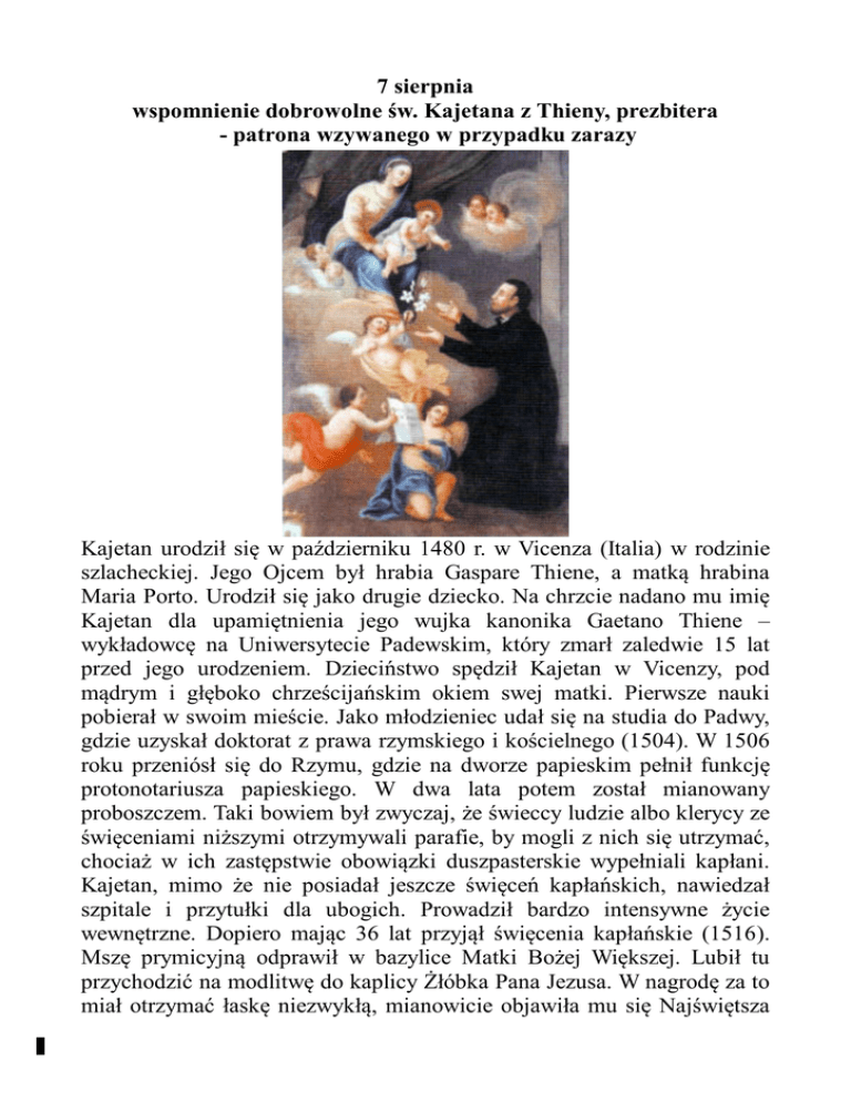 7 sierpnia wspomnienie dobrowolne św. Kajetana z Thieny, prezbitera - patrona wzywanego w przypadku zarazy Kajetan urodził się w październiku 1480 r. w Vicenza (Italia) w rodzinie szlacheckiej. Jego Ojcem był hrabia Gaspare Thiene, a matką hrabina Maria Porto. Urodził się jako drugie dziecko. Na chrzcie nadano mu imię Kajetan dla upamiętnienia jego wujka kanonika Gaetano Thiene – wykładowcę na Uniwersytecie Padewskim, który zmarł zaledwie 15 lat przed jego urodzeniem. Dzieciństwo spędził Kajetan w Vicenzy, pod mądrym i głęboko chrześcijańskim okiem swej matki. Pierwsze nauki pobierał w swoim mieście. Jako młodzieniec udał się na studia do Padwy, gdzie uzyskał doktorat z prawa rzymskiego i kościelnego (1504). W 1506 roku przeniósł się do Rzymu, gdzie na dworze papieskim pełnił funkcję protonotariusza papieskiego. W dwa lata potem został mianowany proboszczem. Taki bowiem był zwyczaj, że świeccy ludzie albo klerycy ze święceniami niższymi otrzymywali parafie, by mogli z nich się utrzymać, chociaż w ich zastępstwie obowiązki duszpasterskie wypełniali kapłani. Kajetan, mimo że nie posiadał jeszcze święceń kapłańskich, nawiedzał szpitale i przytułki dla ubogich. Prowadził bardzo intensywne życie wewnętrzne. Dopiero mając 36 lat przyjął święcenia kapłańskie (1516). Mszę prymicyjną odprawił w bazylice Matki Bożej Większej. Lubił tu przychodzić na modlitwę do kaplicy Żłóbka Pana Jezusa. W nagrodę za to miał otrzymać łaskę niezwykłą, mianowicie objawiła mu się Najświętsza 1 Maryja Panna z Dzieciątkiem i złożyła mu swojego Syna na ręce. Odtąd Kajetan zaczął wyróżniać się jeszcze większym nabożeństwem do Dzieciątka Jezus. To szczególne nabożeństwo przekazał swoim synom duchowym. Wierzył głęboko w Opatrzność Bożą. W 1520 roku na wezwanie matki opuścił Rzym i powrócił do rodzinnego miasta Vicenza. Tu oddał się całkowicie pracy apostolskiej: na ambonie, w konfesjonale, w katechizacji ubogiej dziatwy i młodzieży, w odwiedzaniu chorych w szpitalach i ubogich w przytułkach. Dokoła niego zaczęli gromadzić się uczniowie. W trzy lata potem (1523), po załatwieniu spraw rodzinnych, powrócił do Rzymu. Z powodu wielkiej gorliwości zwano go "łowcą dusz". W rok później otrzymał breve papieskie zatwierdzające nową rodzinę zakonną (1524). Wśród jego pierwszych towarzyszy znaleźli się: Giampietro (Jan-Piotr) Caraffa, biskup Chieti, późniejszy papież Paweł IV, Bonifacy Colli i Paweł Consiglieri. Z nimi jako z pierwszymi współzałożycielami Kajetan złożył uroczystą profesję. Tak powstał nowy zakon Kleryków Regularnych, zwanych pospolicie teatynami. W 1527 roku cesarz Niemiec i król Hiszpanii - Karol V - z regularną armią hiszpańską najechał Rzym. Ucierpieli na tym również teatyni. Sam Kajetan był przez pewien czas więziony. Druga placówka zakonu została założona w Wenecji. Tam teatyni wyróżnili się i wsławili niezwykłym poświęceniem w posłudze chorym w czasie zarazy w latach 1528-1529. Kajetan zetknął się ze św. Hieronimem Emiliani, który założył także nową rodzinę zakonną dla opieki nad sierocą i opuszczoną dziatwą. W 1547 roku na kapitule generalnej w Rzymie zapadła decyzja przyłączenia się do teatynów rodziny zakonnej pod nazwą somasków, założonej przez św. Hieronima. Unia jednak nie trwała długo, gdyż po śmierci Kajetana obie rodziny zakonne rozeszły się i zaczęły iść własną drogą, wyznaczoną przez Opatrzność. W tym samym 1547 roku w Neapolu wybuchła wojna domowa. Kajetan miał prosić Boga, by przyjął ofiarę jego życia dla zahamowania rozlewu krwi. Bóg widać przyjął ofiarę swego wiernego sługi, gdyż tego samego roku dnia 7 sierpnia Kajetan zmarł po 67 latach życia. Beatyfikacja sługi Bożego odbyła się w 1629 r. Dokonał jej Urban VIII. Do chwały świętych wyniósł Kajetana Klemens X w 1671 r. On też rozszerzył jego kult na cały Kościół (1673). W ikonografii św. Kajetan jest przedstawiany w zakonnym habicie przepasany rzemieniem, w białych skarpetkach, w birecie, z różańcem w dłoni. Jego atrybutami są m.in.: czaszka, Dziecię Jezus na rękach, krzyż, lilia, otwarta Ewangelia, ptak, zwój. 2 Modlitwy: Święty Kajetanie, który za życia nigdy obojętnie nie przechodziłeś obok człowieka potrzebującego i zawsze z wielka gorliwością wspierałeś ubogich, chorych oraz wszystkich, których dotknęła jakakolwiek nędza, proszę Cię i ja o pomoc w moim utrapieniu. Racz wstawić się za mną u Boga i wyprosić mi łaskę znalezienia pracy. Ty, który tak wiele razy widziałeś z bliska ludzką biedę i ze wszystkich sił starałeś się pomagać ludziom nią dotkniętym, proś Pana Boga, aby zachował od biedy mnie i moją rodzinę. Pomóż mi zwrócić moje kroki we właściwym kierunku i znaleźć odpowiednie dla mnie zatrudnienie. Uproś mi łaskę spotkania na drodze moich poszukiwań dobrych i wrażliwych ludzi, którzy mi pomogą i wesprą moje ludzkie wysiłki. Proszę Cię także, abyś pomógł mi dostrzec głębszy sens tego doświadczenia, jakie obecnie przeżywam, abym przez ten krzyż, który teraz niosę – krzyż niepokoju, niepewności i lęku o przyszłość – stał(-a) się człowiekiem bardziej wrażliwym na potrzeby bliźnich i bardziej miłosiernym wobec ubogich i potrzebujących. Obym umiał(-a) dzielić się tym, co posiadam, i zawsze właściwie korzystał(-a) z dóbr materialnych, nie przeceniając nigdy ich wartości w swoim życiu. Módl się za mną, abym doznał(-a) łaski, o którą tak usilnie proszę i abym razem z Tobą mógł(mogła) z wdzięcznością wielbić miłosierdzie i dzielić się z ludźmi swoją radością z otrzymanego daru ku chwale Boga. Amen. Litania do św. Kajetana z Thieny, założyciela teatynów Kyrie, eleison. Chryste, eleison. Kyrie, eleison. Chryste usłysz nas. Chryste wysłuchaj nas. Ojcze z ni