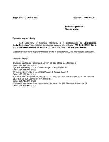 Sygn. akt: G.391.4.2013 Gdańsk; 18.03.2013r. Tablica ogłoszeń Strona www Sprawa: wybór oferty Sąd Apelacyjny w Gdańsku informuje, iż w postępowaniu na „Sprzątanie budynków Sądu” do realizacji zamówienia przyjęto ofertę firmy PW Emir ZPCH Sp. z o.o. 87-800 Włocławek ul. Barska 10 z ceną ofertową: 108.330,00zł brutto. Uzasadnienie wyboru: najkorzystniejsza oferta w postępowaniu, nie podlegająca odrzuceniu. Pozostałe oferty: 1) Zakład Sprzątania i Estetyzacji „Błysk” 82-300 Elbląg ul. 12 Lutego 6 Cena: 141.545,28zł brutto 2) Clean Service Sp. z o.o. 10-165 Olsztyn ul. Artyleryjska 3h Cena: 157.038,00zł brutto 3)Hombre Service Sp. z o.o. 81-855 Sopot ul. Rzemieślnicza 3 Cena: 126.198,00zł brutto 4)Konsorcjum DGP Clean Partner Sp. z o.o. DGP Dozorbud Grupa Polska Sp. z o.o. Gos-Zec Sp. z o.o. 59-220 Legnica ul. N.M.Panny 5e Cena: 124.716,00zł brutto 5) Konsorcjum Jantar 2 Sp. z o.o. Jantar Sp. z o.o. 76-200 Słupsk ul. Z.Augusta 71 Cena: 158.366,40zł brutto