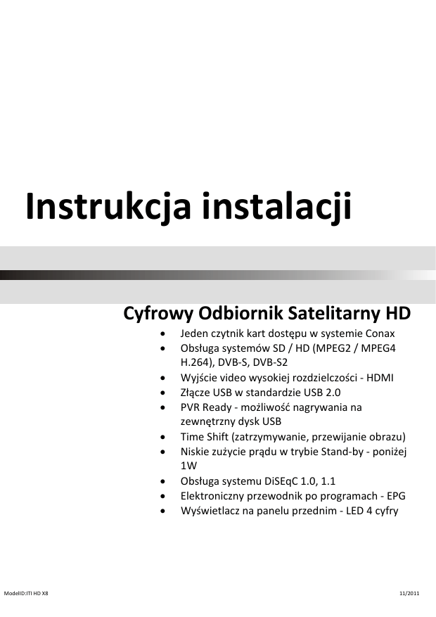 Instrukcja instalacji Cyfrowy Odbiornik Satelitarny HD • • • • • • • • • • ModelID:ITI HD X8 Jeden czytnik kart dostępu w systemie Conax Obsługa systemów SD / HD (MPEG2 / MPEG4 H.264), DVB-S, DVB-S2 Wyjście video wysokiej rozdzielczości - HDMI Złącze USB w standardzie USB 2.0 PVR Ready - możliwość nagrywania na zewnętrzny dysk USB Time Shift (zatrzymywanie, przewijanie obrazu) Niskie zużycie prądu w trybie Stand-by - poniżej 1W Obsługa systemu DiSEqC 1.0, 1.1 Elektroniczny przewodnik po programach - EPG Wyświetlacz na panelu przednim - LED 4 cyfry 11/2011 Pilot zdalnego sterowania Przycisk Funkcja - POWER Włącza/wyłącza odbiornik z/do trybu czuwania. HDMI Przełącza rozdzielczość wyjścia obrazu. - MUTE Przyciski numeryczne FAV MENU INFO EPG EXIT ◄ /► Włącza/wyłącza dźwięk. Wybiera kanał; pozwala na wprowadzanie wartości parametrów w menu. Przełącza czas automatycznego przejścia do trybu czuwania Wył/ 10/ 30/ 60/ 90/ 120 minut. Przełącza listę kanałów na tryb ulubionych, wyświetla aktualnie wybraną listę ulubionych. Przełącza odbiornik na poprzednio oglądany kanał. Wyświetla menu główne na ekranie; w menu przechodzi do poprzedniego poziomu menu. Wyświetla pasek informacyjny kanału. Wyświetla elektroniczny przewodnik po kanałach. Anuluje wybór użytkownika, przechodzi z menu do trybu oglądania. Reguluje głośność odbiornika, steruje kursorem w lewo/prawo. ▲/▼ Zmienia kanały, steruje kursorem do góry/w dół. OK Wyświetla listę kanałów. Wybór funkcji w menu. TV/ FIND P- / P+ Przełącza odbiornik pomiędzy trybami TV/Radio. Umożliwia wyszukanie kanału po nazwie wpisanej za pomocą klawiszy numerycznych. Przenosi kursor na następną lub poprzednią stronę w menu i liście kanałów. SUB-T Konfiguracja napisów pod obrazem. HOME Funkcja opcjonalna (zależna od wersji oprogramowania odbiornika). STATUS Wyświetla okno statusu odbiornika. AUDIO Konfiguracja ustawień dźwięku. TEXT PVR MAILBOX SLOW, SKIP-, SKIP+, REW, FF, PLAY, PAUSE, STOP, REC CZERWONY, ZIELONY, ŻÓŁTY, NIEBIESKI, BIAŁY Wyświetla teletekst dla aktualnego kanału. Wyświetla listę nagrań. Wyświetla listę Twoje Płatności Sterowanie funkcjami video (timeshift, odtwarzanie nagrań, nagrywanie). Przyciski kolorowe (funkcje odpowiadające komentarzom na ekranie). Proste podłączenie Po zakupie odbiornika, rozpakuj go i sprawdź, czy wszystkie poniższe akcesoria znajdują się w zestawie: • Odbiornik • Pilot zdalnego starowania • Instrukcja szybkiej instalacji • Baterie - 2x AAA (opcjonalne) Aby zainstalować baterie w pilocie, należy zdjąć klapkę zabezpieczającą przedział baterii na tylnej stronie pilota. Jeśli w przedziale znajdują się stare baterie, muszą zostać usunięte. Następnie należy umieścić tam baterie. Należy zwrócić szczególną uwagę na kierunek montażu obu baterii - polaryzację. Poprawna polaryzacja baterii oznaczona jest w przedziale baterii pilota. Po umieszczeniu baterii w przedziale, należy umieścić klapkę zabezpieczająca na swoim pierwotnym miejscu. Następnie, podłącz przewód z konwertera LNB / anteny (1 na rysunku obok) do gniazda ANTENA SAT odbiornika (3). Za pomocą kabla HDMI lub SCART (4) podłącz odbiornik z telewizorem (2). Na końcu należy podłączyć przewód zasilający (5) do gniazdka sieciowego. Uruchom telewizor i włącz odbiornik przyciskiem pilota – Power. Po krótkiej chwili na ekranie telewizora ukaże się interfejs obsługi odbiornika (OSD). Jeśli telewizor nie wyświetla OSD, źródło sygnału w telewizorze jest źle wybrane. Sprawdź dokumentację telewizora w celu wyszukania informacji o tym jak wybrać źródło sygnału. Uwagi eksploatacyjne Współpraca z zewnętrznym napędem USB W trakcie doboru i eksploatacji napędu USB (dysk, pamięć flash) należy zwrócić uwagę na to aby napęd: • Był zgodny ze standardem USB 2.0 i posiadał odpowiednie parametry prędkości zapisu i odczytu danych, • Posiadał najlepiej jedną partycję, sformatowaną w obsługiwanym formacie danych, • Jeśli zachodzi taka potrzeba (szczególnie w przypadku dysków twardych USB, które cechują się dużym zużyciem prądu), był zasilany z zewnętrznego zasilacza, • Nie był odłączany w trakcie operacji zapisu lub odczytu danych, • Nie był silnie zapełniony lub sfragmentowany, Niedopasowanie urządzenia do powyższych zaleceń może spowodować niepoprawną pracę urządzeń i w skrajnych przypadkach może spowodować ich uszkodzenie. Producent nie ponosi odpowiedzialności za szkody bezpośrednio lub pośrednio spowodowane jakimikolwiek problemami skutkującymi utratą nagrywanych lub edytowanych danych zgromadzonych na zewnętrznym napędzie USB podłączanym do odbiornika, jak również nie udziela gwarancji w odniesieniu do jakichkolwiek innych danych znajdujących się na podłączanym napędzie USB, w przypadku nieprawidłowego działania funkcji odbiornika. Automatyczne wyłączenie zasilania Zgodnie z aktualnie obowiązującymi wymaganiami zawartymi w dyrektywach Unii Europejskiej, zakupiony przez Państwa odbiornik został wyposażony w funkcję „Automatycznego Wyłączenia Zasilania”. Jej działanie polega na przełączeniu odbiornika do stanu czuwania po okresie 3 godzin od ostatniego aktywnego użycia. W praktyce oznacza to, że jeżeli w ciągu tego czasu do odbiornika nie zostanie wydana żadna komenda za pomocą przycisków pilota zdalnego sterowania lub klawiatury na panelu przednim, odbiornik wyłączy się. Moment wyłączenia odbiornika zostanie poprzedzony (2 minuty wcześniej) stosownym komunikatem wyświetlonym na ekranie telewizora. Jednocześnie informujemy, że funkcja ta jest domyślnie aktywna w oprogramowaniu dedykowanym na kraje Unii Europejskiej, jednak na własne życzenie możecie Państwo ją wyłączyć za pomocą odpowiedniej funkcji w menu odbiornika. Prosta konfiguracja Odbiornik po podłączeniu i 
