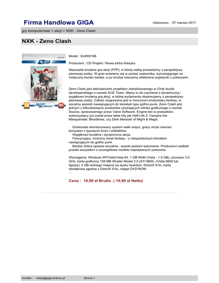 Firma Handlowa GIGA Utworzono : 07 marzec 2017 gry komputerowe > akcji > NXK - Zeno Clash NXK - Zeno Clash Model : Ext000166 Producent : CD Projekt / Nowa eXtra Klasyka Niezwykle brutalna gra akcji (FPP), w której walkę prowadzimy z perspektywy pierwszej osoby. W grze wcielamy się w postać wojownika, wyruszającego na mistyczny koniec świata, a po drodze staczamy efektowne pojedynki z potworami. Zeno Clash jest debiutanckim projektem zlokalizowanego w Chile studia developerskiego o nazwie ACE Team. Mamy tu do czynienia z dynamiczną i wyjątkowo brutalną grą akcji, w której wydarzenia obserwujemy z perspektywy pierwszej osoby. Całość rozgrywana jest w mrocznym środowisku fantasy, w wyraźny sposób nawiązującym do tematyki typu gothic-punk. Zeno Clash jest jednym z kilkudziesięciu produktów używających silnika graficznego o nazwie Source, opracowanego przez Valve Software. Engine ten w przeszłości wykorzystany już został przez takie hity jak Half-Life 2, Vampire the Masquerade: Bloodlines, czy Dark Messiah of Might & Magic. Doskonale skonstruowany system walki wręcz, gracz może również korzystać z typowych broni i artefaktów. Wyjątkowo brutalna i dynamiczna akcja. Fascynujący, mroczny świat fantasy - z niespotykanym klimatem nawiązującym do gothic punk. Bardzo dobra oprawa wizualna - wysoki poziom wykonania. Producenci zadbali przede wszystkim o szczegółowe modele napotykanych potworów. Wymagania: Windows XP/Vista/Vista 64, 1 GB RAM (Vista - 1,5 GB), procesor 3,0 GHz, karta graficzna 128 MB Shader Model 2.0 (ATI 9600, nVidia 6600 lub lepsza), 3 GB wolnego miejsca na dysku twardym, DirectX 9.0c, karta dźwiękowa zgodna z DirectX 9.0c, napęd DVD-ROM � Cena : 19,99 zł Brutto ( 19,99 zł Netto) kontakt : - [email protected] Strona 1