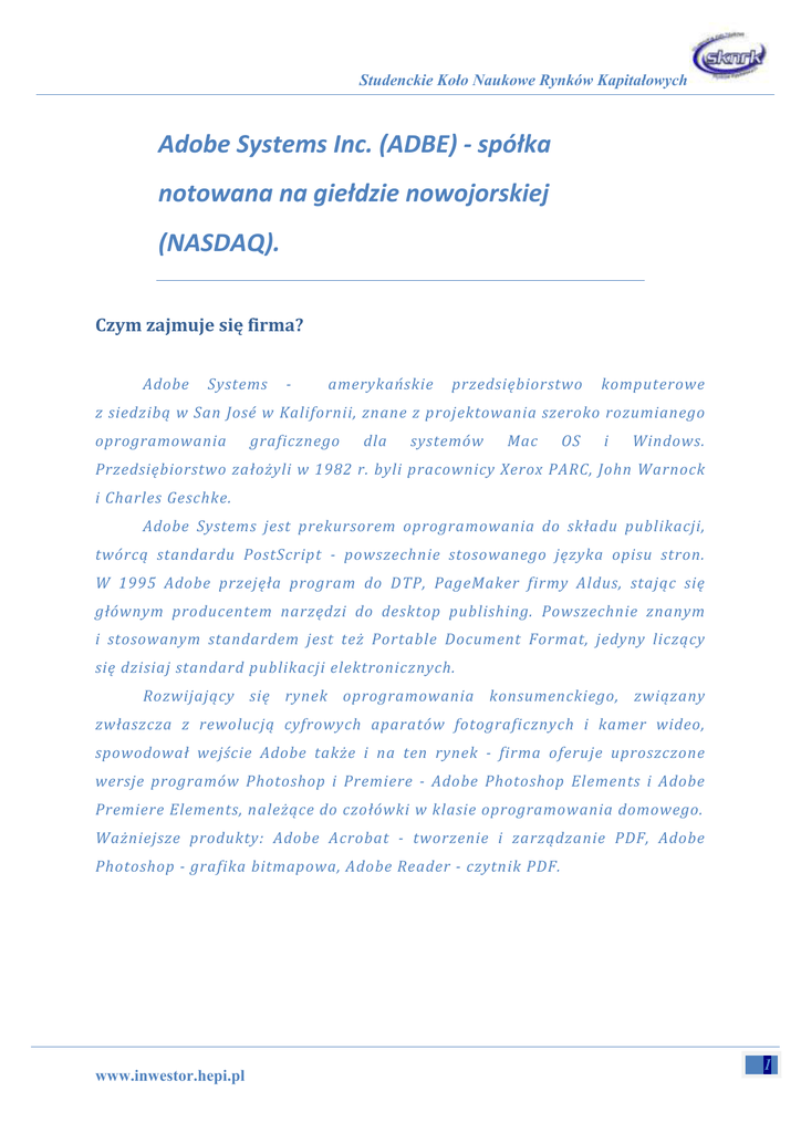 Studenckie Koło Naukowe Rynków Kapitałowych Adobe Systems Inc. (ADBE) - spółka notowana na giełdzie nowojorskiej (NASDAQ). Czym zajmuje się firma? Adobe Systems - amerykańskie przedsiębiorstwo komputerowe z siedzibą w San José w Kalifornii, znane z projektowania szeroko rozumianego oprogramowania graficznego dla systemów Mac OS i Windows. Przedsiębiorstwo założyli w 1982 r. byli pracownicy Xerox PARC, John Warnock i Charles Geschke. Adobe Systems jest prekursorem oprogramowania do składu publikacji, twórcą standardu PostScript - powszechnie stosowanego języka opisu stron. W 1995 Adobe przejęła program do DTP, PageMaker firmy Aldus, stając się głównym producentem narzędzi do desktop publishing. Powszechnie znanym i stosowanym standardem jest też Portable Document Format, jedyny liczący się dzisiaj standard publikacji elektronicznych. Rozwijający się rynek oprogramowania konsumenckiego, związany zwłaszcza z rewolucją cyfrowych aparatów fotograficznych i kamer wideo, spowodował wejście Adobe także i na ten rynek - firma oferuje uproszczone wersje programów Photoshop i Premiere - Adobe Photoshop Elements i Adobe Premiere Elements, należące do czołówki w klasie oprogramowania domowego. Ważniejsze produkty: Adobe Acrobat - tworzenie i zarządzanie PDF, Adobe Photoshop - grafika bitmapowa, Adobe Reader - czytnik PDF. www.inwestor.hepi.pl 1 Studenckie Koło Naukowe Rynków Kapitałowych NAJWAśNIEJSZE INFORMACJE O PRZEMYŚLE OPROGRAMOWANIA KOMPUTEROWEGO Przemysł Kapitalizacja 541 * Wskaźnik cena/zysk (P/E) 27.5 Wskaźnik cena/wartość księgowa (P/BV) 10.9 Stopa zwrotu z kapitału akcyjnego (ROE) 23.9% *- w MLD USD B/D=Brak danych Kapitalizacja jest bardzo wysoka (541 MLD USD) co świadczy o tym, że analizowany przemysł należy do jednych z największych na nowojorskiej giełdzie. NAJWAśNIEJSZE INFORMACJE O SPÓŁCE Okres 2007 2006 2005 Przychody* 2,575.3 1,966.32 1,666.58 Zysk brutto* 2,282.84 1,853.74 1,562.2 Zysk netto** 505.81 602.84 450.4 Zysk na akcję EPS 0.83 1.19 0.91 Stopa dywidendy B/D B/D B/D 2007 rok Kapitalizacja* 25.22 Wskaźnik cena/zysk (P/E) 47.87 Stopa zwrotu z aktywów (ROA) 7.89% Stopa zwrotu z kapitału akcyjnego 10.69% www.inwestor.hepi.pl 2 Studenckie Koło ło Naukowe Rynków Kapitałowych (ROE) Dochód na akcje 4.346 Kwartalny wzrost przychodów (YOY) EBIDA -0.90% 1.04 Kwartalny wzrost zysku (YOY) 36.90% Wskaźnik Beta 2.37 Roczna stopa zwrotu 9.41% Data wypłaty dywidendy 12.04.2005 W poniedziałekk na giełdzie nowojorskiej akcje Adobe straciły iły 0.86% do 42.89 USD, dzięki czemu ich łączna wartość wyniosła w do 25.22 mld USD. Spółka Adobe jest w dobrej kondycji finansowej, co potwierdza wypracowany przez spółkę zysk netto w wysokości 505,81 MLN USD. Wzrost zysku netto spółki wykazuje tendencje wzrostową co jest informacją korzystną dla inwestorów. Wskaźnik cena/zysk Spółka Przemysł 47,87 27,5 Następną ważną informacją na którą trzeba zwrócić uwagę jest wartość wskaźnika Beta (2.37), ), którego akcje wykazują dużo większą zmienność w porównaniu z indeksem S&P 500 co oznacza, że Adobe jest walorem ofensywnym dla la inwestorów długoterminowych. Jeżeli indeks S&P 500 wzrośnie o 1% to analizowana alizowana spółka wzrośnie o 2.37%. 2. %. Natomiast w sytuacji, gdy indeks S&P 500 spadnie o 1% to Adobe spadnie o 2.37%. 2. Wskaźnik cena/zysk jaki odnotowała spółka (47.87) jest ponad 74% wyższy szy w porównaniu z średnią dla pozostałych spółek (27.5) ( co jest informacją bardzo pozytywną. pozy www.inwestor.hepi.pl 3 Studenckie Koło Naukowe Rynków Kapitałowych Wartość wskaźnika ROE dla Adobe (10.69%) jest niższa niż średnia wartość dla analizowanego przemysłu (23.9%) co oznacza, że spółka osiągnęła niższą stopę zwrotu z kapitału własnego niż średnia dla całego przemysłu co jest informacją negatywną. Wnioski: Analizowana spółka charakteryzuje się dobrymi wskaźnikami co wpływa pozytywnie dla potencjalnych inwestorów długoterminowych. Wypracowany przez spółkę zysk netto oraz wysoki poziom wskaźnika cena/zysk wpływają korzystnie dla potencjalnych inwestorów. Jedynie niski poziom wskaźnika ROE wpływa negatywnie. Analizując powyższe dane można stwierdzić, że spółka wpływa pozytywnie dla inwestora długoterminowego. Zestawienie porównawcze Nazwa spółki ADBE AAPL MSFT Adobe Systems Incorporated Apple Inc. Microsoft Corporation Akcja której firmy będzie miała szacunkowo największy wzrost ceny? Cena obecna 42.89 99.92 30.12 65.14 106.49 36.89 51.89% 6.58% 22.48% 74.72 124.19 36.67 74.22% 24.29% 21.76% Cena na koniec roku finansowego Zmiana ceny w % Cena na przyszły rok finansowy Zmiana ceny w % Jaki poziom przychodów i zysku netto odnotowała spółka w ciągu ostatnich 12-miesięcy? Przychody* 2.57 21.59 49.56 Zysk netto* 544.59** 2.79 13.86 www.inwestor.hepi.pl 4 Studenckie Koło Naukowe Rynków Kapitałowych Jaki wzrost przychodów i zysku netto odnotowała spółka? Wzrost przychodów -0.90% 22.50% 16.20% Wzrost zysku netto 36.90% 81.90% 12.90% Jaki jest stosunek ceny akcji do zysku? Wskaźnik cena/zysk (P/E) 47.90 31.60 21.70 Jak kształtowała się cena akcji w ciągu ostatnich 12-miesięcy? Zmiana ceny w ciągu ostatnich 9.3% 17.0% -1.6% 11.2% 24.3% 6.3% 9.4% 42.0% 24.7% 1.04 3.94 17.94 Zysk na akcję (EPS) 0.896 3.161 1.170 Pracownicy 6,082 17,787 71,000 -0.90% 20.80% 6.00% 25.22 86.40 294.94 3- miesięcy Zmiana ceny w ciągu ostatnich 6- miesięcy Zmiana ceny w ciągu ostatnich 12- miesięcy EBIDA * Kwartalna stopa wzrostu (YOY) Kapitalizacja * *= w MLD USD Łączna wartość akcji Adobe wynosi 25.22 mld USD. Kalifornijska spółka ma sporą przewagę nad pozostałymi spółkami, w skład której wchodzą: firma komputerowa Apple oraz obecnie największa firma świata w branży komputerowej Microsoft Corporation. W 2007 roku firma komputerowa Adobe zarobiła netto 544,59 mln USD. Przychody Adobe wyniosł
