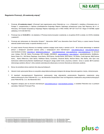 Regulamin Promocji „W weekendy więcej” 1. Promocja „W weekendy więcej” („Promocja”) jest organizowana przez Polkomtel sp. z o.o. („Polkomtel”) z siedzibą w Warszawie przy ul. Postępu 3, zarejestrowaną w rejestrze przedsiębiorców Krajowego Rejestru Sądowego prowadzonym przez Sąd Rejonowy dla m. st. Warszawy, XIII Wydział Gospodarczy Krajowego Rejestru Sądowego pod nr KRS 419430, NIP 527-10-37-727, Regon 011307968, kapitał zakładowy 3 510 300 000 PLN. 2. Promocja trwa od 12.04.2014 r. do odwołania. Z Promocji można korzystać w weekendy, tj. od godziny 00:00 w sobotę do 23:59 w niedzielę („weekend”). 3. Promocja jest adresowana do Abonentów Simplus1 1, Abonentów 36i622 oraz Abonentów Sami Swoi3 3 którzy w czasie trwania Promocji dokonali zasileń konta kwotą i w sposób określony w ust. 4. 4. W czasie trwania Promocji Abonenci do każdego zasilenia swojego konta kwotą o wartości od 20 – 99 zł brutto dokonanego w weekend jednym z dostępnych sposobów poprzez jedną z następujących stron internetowych:. www.doladuj.plus.pl, www.plusbank.plus.pl, www.facebook.com/plus www.blue.pl, doladowania.allegro.pl, www.doladowania.pl, www.agadka24.pl, www.tutajdoladuj.pl; na stronach www: Inteligo, PKO BP, Banku Pocztowego, BPH Sez@m, BZWBK24, www.bzwbk24.pl, www.mbank.pl, ,payudoladowania, MultiBanku, Banku Pekao S.A., ING Banku Śląskiego, Invest Banku, BOŚ Banku, Nordea Banku, BGŻ Banku, VW Banku, Credit Agricole, BNB Paribas banku, , Banku Millennium, Getin Banku, Raiffeisen Banku, Eurobanku, Deutsche Banku, Meritum Banku, Alior Banku, Alior Sync oraz bankowości elektronicznej Banków Spółdzielczych oferujących usługę zasileń konta, przyznany zostanie bonus w postaci 20 % wartości dokonanego zasilenia („Bonus”), który zostanie automatycznie aktywowany na koncie Abonenta po dokonaniu zasilenia. 5. Bonus nie przedłuża okresu ważności dla usług wychodzących. 6. Abonent może wykorzystać Bonus na wszystkie usługi telekomunikacyjne dostępne dla danego Abonenta zgodnie z taryfą, z której korzysta. 7. W kwestiach nieuregulowanych Regulaminem zastosowanie mają odpowiednio postanowienia Regulaminu świadczenia usług telekomunikacyjnych przez Polkomtel Sp. z o.o. dla Abonentów Simplus/Sami Swoi lub Regulaminu świadczenia usług te lekomunikacyjnych przez Polkomtel Sp. z o.o. dla Abonentów 36.6. 8. Regulamin dostępny jest na stronach internetowych www.doladuj.plus.pl, www.facebook.com/plus, w siedzibie Polkomtel oraz w punktach sprzedaży i Salonach Firmowych Plus. 1 2 3 . W rozumieniu Regulaminu świadczenia usług telekomunikacyjnych przez Polkomtel Sp. z o.o. dla Abonentów Simplus. W rozumieniu Regulaminu świadczenia usług telekomunikacyjnych przez Polkomtel Sp. z o.o. dla Abonentów 36.6. W rozumieniu Regulaminu świadczenia usług telekomunikacyjnych przez Polkomtel Sp. z o.o. dla Abonentów Sami Swoi.