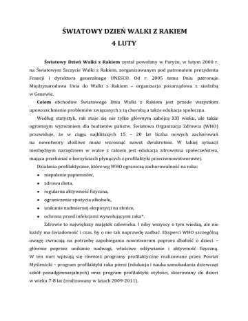 ŚWIATOWY DZIEŃ WALKI Z RAKIEM 4 LUTY Światowy Dzień Walki z Rakiem został powołany w Paryżu, w lutym 2000 r. na Światowym Szczycie Walki z Rakiem, zorganizowanym pod patronatem prezydenta Francji i dyrektora generalnego UNESCO. Od r. 2005 temu Dniu patronuje Międzynarodowa Unia do Walki z Rakiem – organizacja pozarządowa z siedzibą w Genewie. Celem obchodów Światowego Dnia Walki z Rakiem jest przede wszystkim upowszechnienie problemów związanych z tą chorobą a także edukacja społeczna. Według statystyk, rak staje się nie tylko głównym zabójcą XXI wieku, ale także ogromnym wyzwaniem dla budżetów państw. Światowa Organizacja Zdrowia (WHO) przewiduje, że w ciągu najbliższych 15 – 20 lat liczba nowych zachorowań na nowotwory złośliwe może wzrosnąć nawet dwukrotnie. W takiej sytuacji niezbędnym narzędziem w walce z rakiem jest edukacja zdrowotna społeczeństwa, mająca przekonać o korzyściach płynących z profilaktyki przeciwnowotworowej. Działania profilaktyczne, które wg WHO ograniczą zachorowalność na raka: niepalenie papierosów, zdrowa dieta, regularna aktywność fizyczna, ograniczenie spożycia alkoholu, unikanie nadmiernej ekspozycji na słońce, ochrona przed infekcjami wywołującymi raka*. Zdrowie to największy majątek człowieka. I niby wszyscy o tym wiedzą, ale nie każdy ma świadomość i czas, by o nie tak naprawdę zadbać. Eksperci WHO szczególną uwagę zwracają na potrzebę zapobiegania nowotworom poprzez dbałość o dzieci – głównie poprzez unikanie nadwagi, właściwe odżywianie i aktywność fizyczną. W ten nurt wpisują się również programy profilaktyczne realizowane przez Powiat Myślenicki – program profilaktyki raka piersi (edukacja i nauka samobadania dziewcząt szkół ponadgimnazjalnych) oraz program profilaktyki otyłości, skierowany do dzieci w wieku 7-8 lat (realizowany w latach 2009-2011).