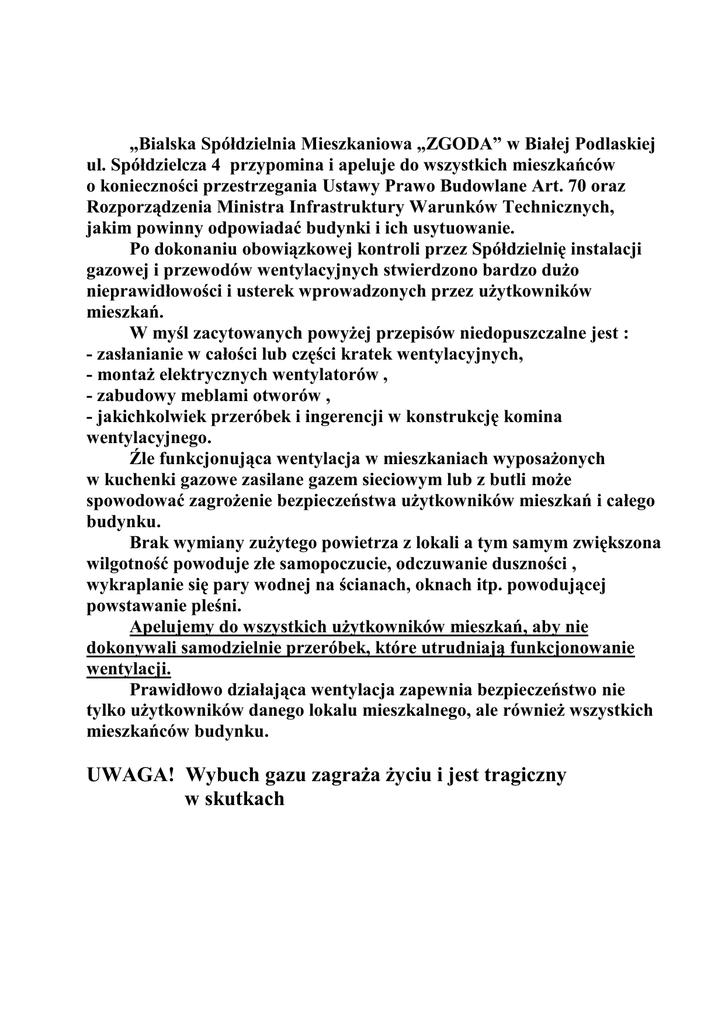 „Bialska Spółdzielnia Mieszkaniowa „ZGODA” w Białej Podlaskiej ul. Spółdzielcza 4 przypomina i apeluje do wszystkich mieszkańców o konieczności przestrzegania Ustawy Prawo Budowlane Art. 70 oraz Rozporządzenia Ministra Infrastruktury Warunków Technicznych, jakim powinny odpowiadać budynki i ich usytuowanie. Po dokonaniu obowiązkowej kontroli przez Spółdzielnię instalacji gazowej i przewodów wentylacyjnych stwierdzono bardzo dużo nieprawidłowości i usterek wprowadzonych przez użytkowników mieszkań. W myśl zacytowanych powyżej przepisów niedopuszczalne jest : - zasłanianie w całości lub części kratek wentylacyjnych, - montaż elektrycznych wentylatorów , - zabudowy meblami otworów , - jakichkolwiek przeróbek i ingerencji w konstrukcję komina wentylacyjnego. Źle funkcjonująca wentylacja w mieszkaniach wyposażonych w kuchenki gazowe zasilane gazem sieciowym lub z butli może spowodować zagrożenie bezpieczeństwa użytkowników mieszkań i całego budynku. Brak wymiany zużytego powietrza z lokali a tym samym zwiększona wilgotność powoduje złe samopoczucie, odczuwanie duszności , wykraplanie się pary wodnej na ścianach, oknach itp. powodującej powstawanie pleśni. Apelujemy do wszystkich użytkowników mieszkań, aby nie dokonywali samodzielnie przeróbek, które utrudniają funkcjonowanie wentylacji. Prawidłowo działająca wentylacja zapewnia bezpieczeństwo nie tylko użytkowników danego lokalu mieszkalnego, ale również wszystkich mieszkańców budynku. UWAGA! Wybuch gazu zagraża życiu i jest tragiczny w skutkach