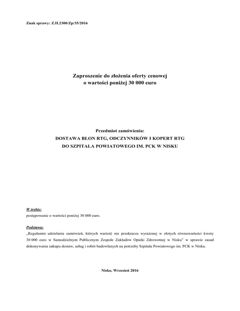 Znak sprawy: Z.II.2300/Zp/35/2016 Zaproszenie do złożenia oferty cenowej o wartości poniżej 30 000 euro Przedmiot zamówienia: DOSTAWA BŁON RTG, ODCZYNNIKÓW I KOPERT RTG DO SZPITALA POWIATOWEGO IM. PCK W NISKU W trybie: postępowanie o wartości poniżej 30 000 euro. Podstawa: „Regulamin udzielania zamówień, których wartość nie przekracza wyrażonej w złotych równowartości kwoty 30 000 euro w Samodzielnym Publicznym Zespole Zakładów Opieki Zdrowotnej w Nisku” w sprawie zasad dokonywania zakupu dostaw, usług i robót budowlanych na potrzeby Szpitala Powiatowego im. PCK w Nisku. Nisko, Wrzesień 2016 Dostawa błon rtg, odczynników i kopert rtg do Szpitala Powiatowego im. PCK w Nisku Znak sprawy: Z.II.2300/Zp/35/2016 Nisko, dnia: 16/09/2016 r. OGŁOSZENIE O ZAMÓWIENIU KTÓREGO WARTOŚĆ NIE PRZEKRACZA WYRAŻONEJ W ZŁOTYCH RÓWNOWARTOŚCI KWOTY 30.000 EURO 1) Zamawiający: Samodzielny Publiczny Zespół Zakładów Opieki Zdrowotnej ul. Kościuszki 1, 37-400 Nisko NIP: 865-20-74-945, REGON: 000306680 Tel. (15) 8416 703, 8416 779, Fax. (15) 8416 704, www.szpital-nisko.pl, e-mail: [email protected] 2) Opis przedmiotu zamówienia: Dostawa błon rtg, odczynników i kopert rtg do Szpitala Powiatowego im. PCK w Nisku (szczegółowy opis przedmiotu zamówienia stanowi załącznik nr 1 do niniejszego ogłoszenia) 3) Termin wykonania zamówienia: Sukcesywnie w ciągu roku od daty udzielenia zamówienia. 4) Wykaz oświadczeń lub dokumentów, jakie mają dostarczyć wykonawcy wraz z ofertą: Lp. Wymagany dokument 1. Formularz ofertowy. Wypełniony formularz ofertowy. 2. Formularz cenowy. Wypełniony formularz cenowy. 3. Oświadczenie o spełnianiu warunków. 4. Oświadczenie o braku podstaw do wykluczenia. 5. 6. 7. Aktualny odpis lub oświadczenie. Aktualny odpis z właściwego rejestru, jeżeli odrębne przepisy wymagają wpisu do rejestru, w celu wykazania braku podstaw do wykluczenia w oparciu o art. 24 ust. 1 pkt. 2 ustawy, wystawiony nie wcześniej niż 6 miesięcy przed upływem terminu składania wniosków o dopuszczenie do udziału w postępowaniu o dzielenie zamówienia albo składania ofert, a w stosunku do osób fizycznych oświadczenie w zakresie art. 24 ust. 1 pkt. 2 ustawy. Wykaz dostaw lub usług. Wykaz wykonanych, a w przypadku świadczeń okresowych lub ciągłych również wykonywanych, dostaw lub usług w zakresie niezbędnym do wykazania spełniania warunku wiedzy i doświadczenia w okresie ostatnich trzech lat przed upływem terminu składania ofert albo wniosków o dopuszczenie do udziału w postępowaniu, a jeżeli okres prowadzenia działalności jest krótszy - w tym okresie, z podaniem ich wartości, przedmiotu, dat wykonania i odbiorców, oraz załączeniem dokumentu potwierdzającego, że te dostawy lub usługi zostały wykonane lub są wykonywane należycie. Karty charakterystyki substancji niebezpiecznej. Karty charakterystyki substancji niebezpiecznych, zaoferowanych odczynników sporządzone w języku polskim wydana przez producenta oferowanego przedmiotu zamówienia. 8. Certyfikaty, deklaracje zgodności, świadectwa rejestracyjne. 9. Oświadczenie producenta (wraz z typem filmu, numerem katalogowym i nazwą producenta) informujące, że oferowane filmy są przez niego produkowane i są dedykowane do posiadanej przez Zamawiającego kamery laserowej Kodak Dry View 5800. 5) Informacje o sposobie porozumiewania się Zamawiającego z wykonawcami oraz przekazywania oświadczeń lub dokumentów, a także wskazanie osób uprawnionych do porozumiewania się z wykonawcami: Komunikacja między Zamawiającym a Wykonawcami odbywa się za pośrednictwem operatora pocztowego w rozumieniu ustawy z dnia 23 listopada 2012 r. – Prawo pocztowe (Dz. U. poz. 1529 oraz z 2015 r. poz. 1830), osobiście, za pośrednictwem posłańca, faksu lub przy użyciu środków komunikacji elektronicznej w rozumieniu ustawy z dnia 18 lipca 2002 r. o świadczeniu usług drogą elektroniczną (Dz. U. z 2013 r. poz. 1422, z 2015 r. poz. 1844 oraz z 2016 r. poz. 147 i 615), (…) jeżeli Zamawiający lub Wykonawca przekazują oświadczenia, wnioski, zawiadomienia oraz informacje za pośrednictwem faksu lub przy użyciu środków komunikacji elektronicznej w rozumieniu ustawy z dnia 18 lipca 2002 r. o świadczeniu usług drogą elektroniczną, każda ze stron na żądanie drugiej strony niezwłocznie potwierdza fakt ich otrzymania, Zamawiający będzie porozumiewał się z Wykonawcami w formie pisemnej. Osoby uprawnione do porozumiewania się z wykonawcami: Roman Ryznar – Główny Specjalista ds. Ekonomiczno-Administracyjnych, tel. (15) 8416 701, Piotr Tabor – Specjalista ds. zamówień publicznych, tel. (15) 8416 779. System ProPublico © Datacomp Strona 2/14 Dostawa błon rtg, odczynników i kopert rtg do Szpitala Powiatowego im. PCK w Nisku 6) Termin związania ofertą: 30 dni. 7) Opis sposobu przygotowywania ofert: - Wykonawca może złożyć tylko jedną ofertę, - oferta musi być sporządzona zgodnie z opisem przedmiotu zamówienia stanowiącym załącznik nr 1 do niniejszego ogłoszenia, - Wykonawca jest obowiązany wskazać w ofercie części zamówienia, których wykonanie zamierza powierzyć podwykonawcom. - Wykonawca zamieszcza ofertę w kopercie opisanej w następujący sposób: „Dostawa błon rtg, odczynników i kopert rtg do Szpitala Powiatowego im. PCK w Nisku. NIE OTWIERAĆ przed: 26/09/2016”. 8) Miejsce oraz termin składania ofert: Siedziba Zamawiającego, pokój nr 12 do dnia: 26/09/2016 r. do godziny 10.00 9) Opis sposobu obliczenia ceny: Cenę należy podać w złotych polskich z dokładnością dwóch miejsc po przecinku. 10) Opis kryteriów, którymi Zamawiający będzie się kierował przy wyborze oferty, wraz z podaniem znaczenia tych kryteriów i sposobu oceny ofert: - Zamawiający będzie oceniał oferty według następujących kryteriów: Nr - Nazwa kryterium Waga 1 Cena (koszt) 85 % 2 Warunki płatności 10 % 3 Termin realizacji zamówienia 5% pun