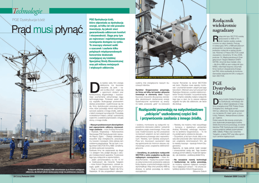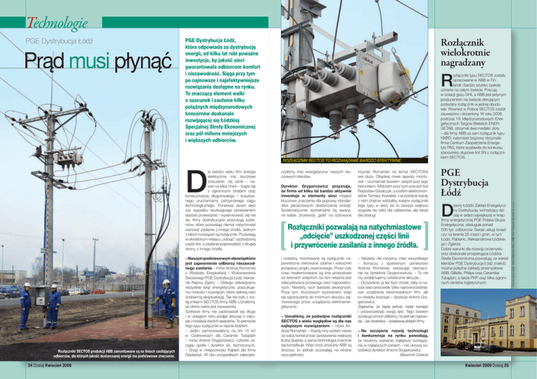 Technologie Prąd musi płynąć Rozłącznik wielokrotnie nagradzany PGE Dystrybucja Łódź, która odpowiada za dystrybucję energii, od kilku lat robi poważne inwestycje, by jakość sieci gwarantowała odbiorcom komfort i niezawodność. Sięga przy tym po najnowsze i najefektywniejsze rozwiązania dostępne na rynku. To znaczący element walki o szacunek i zaufanie kilku potężnych międzynarodowych koncernów doskonale rozwijającej się Łódzkiej Specjalnej Strefy Ekonomicznej oraz pół miliona mniejszych i większych odbiorców. R rozłącznik sectos to rozwiązanie bardzo efektywne D Rozłączniki SECTOS produkcji ABB zamontowane są na liniach zasilających odbiorców, dla których jakość dostarczanej energii ma podstawowe znaczenie. 24 Dzisiaj Kwiecień 2009 la bardzo wielu firm energia elektryczna ma kluczowe znaczenie. Jej zanik – nawet na kilka chwil – wiąże się z ogromnymi stratami oraz koniecznością długotrwałego i kosztownego uruchamiania zatrzymanego ciągu technologicznego. Ponieważ awarii sieci czy wypadku skutkującego przerwaniem dostaw przewidzieć i wyeliminować się nie da, firmy dystrybucyjne poszukują systemów, które pozwalają niemal natychmiast wznowić zasilanie z innego źródła. Jednym z takich rozwiązań są rozłączniki. Pozwalają w określonym miejscu „odciąć” uszkodzoną część linii, a zasilanie poprowadzić z drugiej strony, z innego źródła. czyliśmy linie energetyczne naszych kluczowych klientów. – Naszym podstawowym obowiązkiem jest zapewnienie odbiorcy niezawodnego zasilania – mówi Andrzej Romański z Wydziału Eksploatacji i Wykonawstwa Sieciowego PGE Dystrybucja Łódź, kierownik Rejonu Zgierz. – Dlatego odwiedzamy wszystkie targi energetyczne, poszukujemy nowości i rozwiązań, które ułatwią nam codzienną eksploatację. Tak też było z rozłącznikami SECTOS firmy ABB. Uznaliśmy, że oferta warta jest rozważenia. Szefowie firmy nie zastanawiali się długo i w ubiegłym roku podjęli decyzję o zakupie i instalacji dwóch aparatów. To pierwsze tego typu rozłączniki w rejonie łódzkim. – Jeden zamontowaliśmy na linii 15 kV w Cedrowicach dla Ceramiki Tubądzin – mówi Antonii Grygorcewicz, członek zarządu spółki i dyrektor ds. technicznych. – Drugi w miejscowości Rąbień dla firmy Geplastyk. W obu przypadkach zabezpie- i izolatory, montowane są rozłączniki napowietrzne sterowane zdalnie i wskaźniki przepływu prądu zwarciowego. Przez cały czas modernizowane są linie przesyłowe na terenach wiejskich, bo tam właśnie jest zdecydowana przewaga sieci napowietrznych. Niestety, tych bardziej awaryjnych. Poza tym, kluczowym wyzwaniem staje się ograniczenie do minimum obszaru zajmowanego przez urządzenia elektroenergetyczne. Dyrektor Grygorcewicz przyznaje, że firma od kilku lat bardzo aktywnie inwestuje w elementy sieci mające kluczowe znaczenie dla poprawy standardów jakościowych dostarczanej energii. Systematycznie wymieniane są awaryjne kable, przewody „gołe” na izolowane Inżynier Romański na temat SECTOSA wie dużo. Obydwa nowe aparaty montował i uruchamiał bowiem zespół pod jego kierunkiem. Mistrzem przy tych pracach był Radosław Góralczyk, a szefem elektromonterów Tomasz Kowalski. I oczywiście każdy z nich chętnie widziałby kolejne rozłączniki tego typu w sieci, bo to zawsze większa wygoda nie tylko dla odbiorców, ale także dla obsługi. Rozłączniki pozwalają na natychmiastowe „odcięcie” uszkodzonej części linii i przywrócenie zasilania z innego źródła. – Uznaliśmy, że podwójne rozłączniki SECTOS z wielu względów są dla nas najlepszym rozwiązaniem – mówi Andrzej Romański. – Każdy inny system niesie za sobą konieczność postawienia większej liczby słupów, a sama technologia znacznie się komplikuje. Więc choć produkty ABB są droższe, to jednak pozwalają na istotne oszczędności. – Niestety, nie możemy mieć wszystkiego – tłumaczy z dyskretnym uśmiechem Andrzej Romański, wskazując nieznacznie na dyrektora Grygorcewicza. – To nie my podejmujemy ostateczne decyzje... – Oczywiście, ja też bym chciał, żeby w naszej sieci pracowały tylko najnowocześniejsze urządzenia renomowanych firm, ale to niestety kosztuje – ripostuje Antonii Grygorcewicz. Zapewnia, że będą jednak nadal rozwijać i unowocześniać swoją sieć. Tego bowiem oczekują od nich odbiorcy. I to jest tak naprawdę – jak stwierdza – podstawą działań firmy. ozłączniki typu SECTOS zostały opracowane w ABB w Finlandii i bardzo szybko zyskały uznanie na całym świecie. Pracują w izolacji gazu SF6, a ABB jest jedynym producentem na świecie oferującym podwójny rozłącznik w jednej obudowie. Również w Polsce SECTOS został zauważony i doceniony. W roku 2006, podczas 19. Międzynarodowych Energetycznych Targów Bielskich ENERGETAB, otrzymał dwa medale: złoty – dla firmy ABB za sam rozłącznik typu NXBD, natomiast brązowy otrzymała firma Centrum Zaopatrzenia Energetyki PAS, która wystawiła do konkursu stanowisko słupowe linii SN z rozłącznikiem SECTOS. PGE Dystrybucja Łódź D awny Łódzki Zakład Energetyczny Dystrybucja, wchodzący dzisiaj w skład największej w kraju firmy energetycznej PGE Polska Grupa Energetyczna, obsługuje ponad 500 tys. odbiorców. Swoje usługi świadczy na terenie 25 miast i gmin, w tym Łodzi, Pabianic, Aleksandrowa Łódzkiego i Zgierza. Dobre warunki dla rozwoju przemysłu oraz doskonale prosperująca Łódzka Strefa Ekonomiczna powodują, że wśród klientów PGE Dystrybucja Łódź znaleźć można potężne zakłady przemysłowe ABB, Gillette, Philips oraz Ceramika Tubądzin, a także PKP oraz kilka ogromnych centrów logistycznych. – Na szczęście rozwój technologii i konkurencja na rynku powodują, że możemy wybierać najlepsze rozwiązania w najlepszych cenach – nie ukrywa satysfakcji dyrektor Antonii Grygorcewicz. Sławomir Dolecki Kwiecień