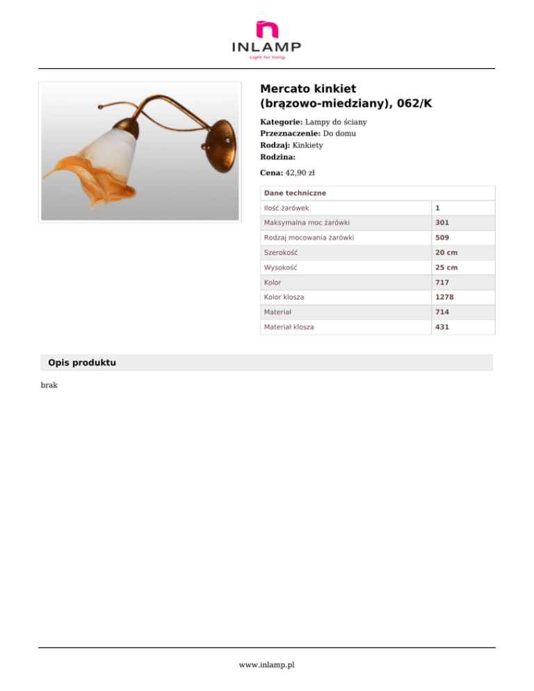 Mercato kinkiet (brązowo-miedziany), 062/K Kategorie: Lampy do ściany Przeznaczenie: Do domu Rodzaj: Kinkiety Rodzina: Cena: 42,90 zł Dane techniczne Ilość żarówek 1 Maksymalna moc żarówki 301 Rodzaj mocowania żarówki 509 Szerokość 20 cm Wysokość 25 cm Kolor 717 Kolor klosza 1278 Materiał 714 Materiał klosza 431 Opis produktu brak www.inlamp.pl