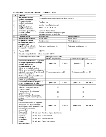 SYLABUS PRZEDMIOTU / MODUŁU KSZTAŁCENIA Lp. 1 2 3 4 5 6 7 8 9 10 Element Nazwa przedmiotu/ modułu kształcenia Typ przedmiotu/ modułu kształcenia Instytut Kod przedmiotu/ modułu kształcenia Kierunek, specjalność, poziom i profil kształcenia Forma studiów Rok studiów, semestr Forma zajęć i liczba godzin dydaktycznych wymagających bezpośredniego udziału nauczyciela i studentów Punkty ECTS Opis Ochrona konserwatorska układów historycznych Fakultatywny Instytut Nauk Technicznych PPWSZ-A-2-116 B -s/n kierunek: Architektura poziom kształcenia: drugiego stopnia profil kształcenia: praktyczny Stacjonarne: Rok I, sem I Niestacjonarne: Rok I, sem I Stacjonarne: Niestacjonarne: Ćwiczenia projektowe: 20 Ćwiczenia projektowe: 20 4 ECTS Nakład pracy studenta – bilans punktów ECTS Forma aktywności studenta 11 Obciążenie studenta Studia stacjonarne Obciążenie studenta na zajęciach wymagających bezpośredniego godz.: 50 ECTS: 2 udziału nauczycieli akademickich, w tym: Udział w wykładach (godz.) Udział w ćwiczeniach/ seminariach/ zajęciach praktycznych/ praktykach Ćwiczenia projektowe: 20 zawodowych (godz.) Dodatkowe godziny kontaktowe z nauczycielem (godz.) Udział w egzaminie (godz.) Obciążenie studenta związane z godz.: 50 ECTS: 2 nauką samodzielną, w tym: Samodzielne studiowanie tematyki zajęć/ przygotowanie się do 20 ćwiczeń (godz.) Przygotowanie do zaliczenia/ 10 egzaminu (godz.) Wykonanie zadań domowych (referat, projekt, prezentacja itd.) 20 (godz.) Suma (obciążenie studenta na zajęciach wymagających bezpośredniego godz.: 100 ECTS: 4 udziału nauczycieli akademickich oraz związane z nauką samodzielną) Nauczyciel Dr inż. arch. Krystyna Styrna-Bartkowicz akademicki Dr inż. arch. Maria Staruch odpowiedzialny za Dr inż. arch. Jacek Czubiński przedmiot/ Dr inż. arch. Paweł Maryńczuk moduł (egzaminujący) Studia niestacjonarne godz.: 50 ECTS: 2 - Ćwiczenia projektowe : 20 godz.: 50 ECTS: 2 20 10 20 godz.: 100 ECTS: 4 12 13 Nauczyciele akademiccy prowadzący przedmiot/ moduł Wymagania (kompetencje) wstępne 14 Założenia i cele przedmiotu 15 Efekty kształcenia Dr inż. arch. Krystyna Styrna-Bartkowicz Dr inż. arch. Maria Staruch Dr inż. arch. Jacek Czubiński Dr inż. arch. Paweł Maryńczuk Zaliczenie przedmiotu Historia urbanistyki, Historia architektury powszechnej, Historia architektury Polskiej.Ma szczegółową wiedzę niezbędną do rozumienia społecznych, ekonomicznych, prawnych i pozatechnicznych uwarunkowań projektowania architektonicznego obiektów zabytkowych. C1 –zapoznanie z metodami ochrony i działaniami konserwatorskimi stosowanymi w obrębie zabytkowych i historycznych układów przestrzennych C2– opanowanie zasad postępowania konserwatorskiego w zakresie ochrony zasobów dziedzictwa urbanistycznego - oraz przykłady dobrych praktyk urbanistycznokonserwatorskich. C4 – doskonalenie umiejętności posługiwania się i korzystania w pracy zawodowej wiedzą z zakresu historii i teorii architektury, teorii urbanistyki, sztuk pięknych, nauk technicznych i nauk humanistycznych; Opis efektów kształcenia w zakresie: WIEDZY W1 Ma świadomość konieczności ochrony wartości kulturowych oraz zyskuje umiejętność posługiwania się właściwymi zasadami i sprawdzonymi metodami postępowania konserwatorskiego, zna metody pracy konserwatora-urbanisty. W2 Posiada wiedzę na temat historycznych układów urbanistycznych. Jego wiedza jest poszerzona o wiadomości z zakresu historii urbanistyki od 2 poł. XIX wieku do czasów współczesnych. UMIEJĘTNOŚCI U1 Potrafi prawidłowo identyfikować problemy konserwatorskie, rozpoznaje i określa podstawowe problemy planowania przestrzennego i regionalnego wobec konieczności ochrony dóbr kultury. U2 Potrafi prowadzić badania historyczne na Odniesienie do kierunkowych efektów kształcenia Odniesienie do efektów kształcenia dla obszaru K_W07 K_W06 T2P_W04 T2P_W06 T2P_W07 lnzP_W01 InzP_W02 InzP_W03 K_W08 K_W12 T2P_W04 T2P_W05 T2P_W06 T2P_W07 InzP_W01 InzP_W02 InzP_W03 InzP_W04 K_U01 T2P_U01 T2P_U02 T2P_U04 T2P_U06 T2P_U08 T2P_U09 T2P_U11 T2P_U12 T2P_U15 T2P_U16 T2P_U17 T2P_U18 T2P_U19 InzP_U02 InzP_U03 InzP_U04 InzP_U07 InzP_U08 InzP_U09 InzP_U11 T2P_U01 K_U06 podstawie których rozpoznaje zasoby dziedzictwa kulturowego KOMPETENCJI SPOŁECZNYCH K1 Jest świadomy roli społecznej architekta i rozumie pozatechniczne aspekty i skutki jego działalności, w tym jej wpływ na środowisko oraz związaną z tym odpowiedzialność za podejmowane decyzje. 17 18 Treści kształcenia Stosowane metody dydaktyczne Metody weryfikacji efektów kształcenia (w odniesieniu do poszczególnych efektów) T2P_U02 T2P_U03 T2P_U06 T2P_U07 T2P_U08 T2P_U12 T2P_U14 T2P_U16 T2P_U18 lnzP_U03 lnzP_U05 lnzP_U06 lnzP_U07 lnzP_U09 lnzP_U10 lnzP_U11 lnzP_U12 K_K01 T2P_K01 T2P_K04 T2P_K05 T2P_K06 lnzP_K01 lnzP_K02 T2P_K07 T2P_K03 InzP_K01 Ma świadomość potrzeby postępowania w K_K02 sposób profesjonalny, postrzegania zasad etyki zawodoweji poszanowania różno-rodności poglądów i kultur. 1.Zadania i cele organizacji oraz instytucji zajmujących się ochroną dziedzictwa kulturowego m. innymi: Międzynarodowa Rada Ochrony Zabytków i Miejsc Historycznych (ang. International Council on Monuments and Sites, w skrócie ICOMOS); Międzynarodowy Komitet Konserwacji Dziedzictwa Przemysłowego TICCIH (The International Committee for the Conservation of the IndustrialHeritage) 2. Powody i konsekwencje nieumiejętnego zarządzania dziedzictwem urbanistycznym. 3. Badania urbanistyczno-terenowe, kwerendy archiwalne, dokumentacje badań archeologicznych i architektonicznych jako sposoby rozpoznawania zasobów dziedzictwa kulturowego. 4. Dziedzictwo kulturowe miast od 2 poł. XIX wieku. 5. Karta Ateńska z 1931 r., Karta Ateńska Urbanistyki z 1933 r., Karta Wenecka 1964 r., Nowa Karta Ateńska Urbanistyki 1998 r. 5. Współczesne zagrożenia dla tożsamości przestrzeni miejskiej. ćwiczenia, dyskusja, rozw