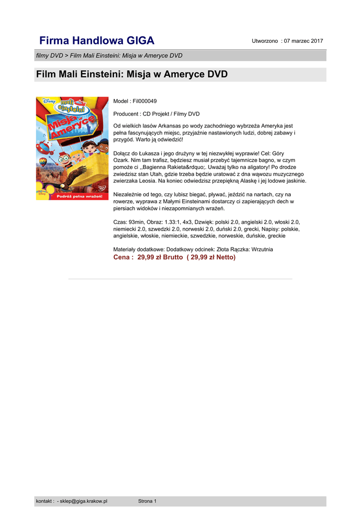 Firma Handlowa GIGA Utworzono : 07 marzec 2017 filmy DVD > Film Mali Einsteini: Misja w Ameryce DVD Film Mali Einsteini: Misja w Ameryce DVD Model : Fil000049 Producent : CD Projekt / Filmy DVD Od wielkich lasów Arkansas po wody zachodniego wybrzeża Ameryka jest pełna fascynujących miejsc, przyjaźnie nastawionych ludzi, dobrej zabawy i przygód. Warto ją odwiedzić! Dołącz do Łukasza i jego drużyny w tej niezwykłej wyprawie! Cel: Góry Ozark. Nim tam trafisz, będziesz musiał przebyć tajemnicze bagno, w czym pomoże ci ,,Bagienna Rakieta”. Uważaj tylko na aligatory! Po drodze zwiedzisz stan Utah, gdzie trzeba będzie uratować z dna wąwozu muzycznego zwierzaka Leosia. Na koniec odwiedzisz przepiękną Alaskę i jej lodowe jaskinie. Niezależnie od tego, czy lubisz biegać, pływać, jeździć na nartach, czy na rowerze, wyprawa z Małymi Einsteinami dostarczy ci zapierających dech w piersiach widoków i niezapomnianych wrażeń. Czas: 93min, Obraz: 1.33:1, 4x3, Dzwięk: polski 2.0, angielski 2.0, włoski 2.0, niemiecki 2.0, szwedzki 2.0, norweski 2.0, duński 2.0, grecki, Napisy: polskie, angielskie, włoskie, niemieckie, szwedzkie, norweskie, duńskie, greckie Materiały dodatkowe: Dodatkowy odcinek: Złota Rączka: Wrzutnia Cena : 29,99 zł Brutto ( 29,99 zł Netto) kontakt : - [email protected] Strona 1