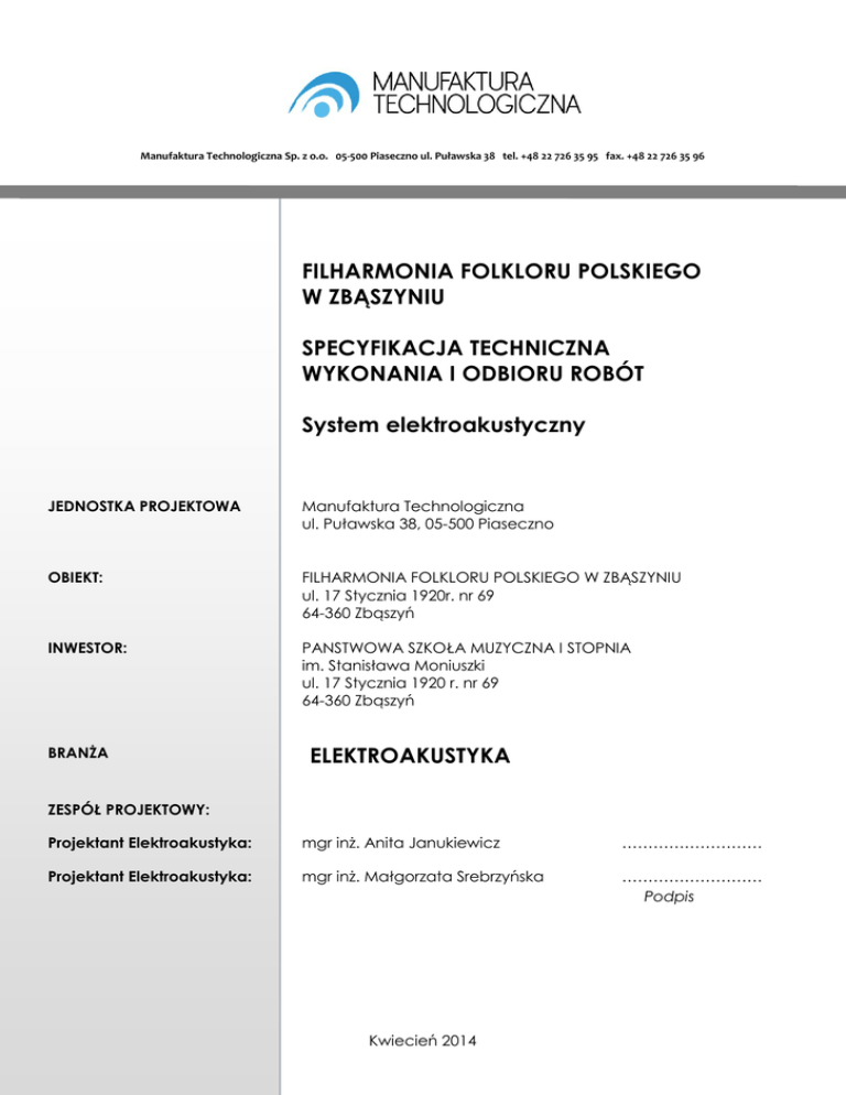 Manufaktura Technologiczna Sp. z o.o. 05-500 Piaseczno ul. Puławska 38 tel. +48 22 726 35 95 fax. +48 22 726 35 96 FILHARMONIA FOLKLORU POLSKIEGO W ZBĄSZYNIU SPECYFIKACJA TECHNICZNA WYKONANIA I ODBIORU ROBÓT System elektroakustyczny JEDNOSTKA PROJEKTOWA Manufaktura Technologiczna ul. Puławska 38, 05-500 Piaseczno OBIEKT: FILHARMONIA FOLKLORU POLSKIEGO W ZBĄSZYNIU ul. 17 Stycznia 1920r. nr 69 64-360 Zbąszyń INWESTOR: PANSTWOWA SZKOŁA MUZYCZNA I STOPNIA im. Stanisława Moniuszki ul. 17 Stycznia 1920 r. nr 69 64-360 Zbąszyń BRANŻA ELEKTROAKUSTYKA ZESPÓŁ PROJEKTOWY: Projektant Elektroakustyka: mgr inż. Anita Janukiewicz ……………………… Projektant Elektroakustyka: mgr inż. Małgorzata Srebrzyńska ……………………… Podpis Kwiecień 2014 F i l h a r m o n i a F o l k l o r u P o l s k i e go w Z b ą s z y n i u E l e k tr o a k u s ty k a – S T Wi O R SPIS TREŚCI: 1. WSTĘP.................................................................................................................................. 3 2. PRZEDMIOT SZCZEGÓŁOWEJ SPECYFIKACJI TECHNICZNEJ ......................................... 3 3. ZAKRES STOSOWANIA SPECYFIKACJI .............................................................................. 3 4. ZAKRES PRAC ..................................................................................................................... 3 5. OKREŚLENIA I DEFINICJE ................................................................................................... 5 5.1 POJĘCIA PODSTAWOWE .......................................................................................... 5 6. SPECYFIKACJA TECHNICZNA ........................................................................................... 6 7. OGÓLNE WYMAGANIA DOTYCZĄCE ROBÓT ............................................................. 20 8. URZĄDZENIA I MATERIAŁY .............................................................................................. 20 9. SPRZĘT ............................................................................................................................... 20 10. WYKONANIE ROBÓT ....................................................................................................... 21 11. SPOSÓB WYKONANIA ROBÓT ....................................................................................... 21 11.1 WYTYCZNE PROWADZENIA INSTALACJI ................................................................ 21 12. KONTROLA JAKOŚCI ROBÓT ......................................................................................... 22 13. OBMIAR ROBÓT ............................................................................................................... 23 14. ODBIORY ROBÓT I PODSTAWY PŁATNOŚCI ................................................................. 23 15. ROZWIAZANIA ZAMIENNE I RÓWNOWAŻNE ................................................................ 24 16. WNIOSEK MATERIAŁOWY ............................................................................................... 25 2 F i l h a r m o n i a F o l k l o r u P o l s k i e go w Z b ą s z y n i u E l e k tr o a k u s ty k a – S T Wi O R 1. WSTĘP Grupa robót: 45.3 Roboty w zakresie robót instalacyjnych Klasa robót: 45.31 Roboty związane z montażem instalacji elektrycznych i osprzętu Kody CPV: 51310000-8 Usługi instalowania urządzeń telewizyjnych, radiowych, dźwiękowych i wideo 32000000-3 Sprzęt radiowy, telewizyjny, komunikacyjny, telekomunikacyjny i podobny 2. PRZEDMIOT SZCZEGÓŁOWEJ SPECYFIKACJI TECHNICZNEJ Przedmiotem niniejszej specyfikacji są wymagania techniczne dotyczące wykonania i odbioru robót budowlanych instalacji, urządzeń oraz elementów systemu FILHARMONI FOLKLORU POLSKIEGO W ZBĄSZYNIU, ul. 17 Stycznia 1920r. nr 69, 64-360 Zbąszyń. 3. ZAKRES STOSOWANIA SPECYFIKACJI Niniejsza specyfikacja będzie stosowana, jako dokument przetargowy i kontraktowy przy zlecaniu i realizacji robót wymienionych w punkcie 4. Ustalenia zawarte w niniejszej specyfikacji obejmują wszystkie czynności umożliwiające i mające na celu wykonanie robót instalacyjnych, dostawy, montażu oraz uruchomienia systemu, o którym mowa w punkcie 4. opracowania. 4. ZAKRES PRAC Zakres prac powinien obejmować, ale nie ograniczać się do: a) zapewnienia wymaganej siły roboczej, sprzętu i materiałów, b) koordynacji prac instalacyjnych z innymi branżami, c) wykonania tras kablowych i ułożenia okablowania systemu elektroakustycznego, d) dostawy i montażu urządzeń systemu elektroakustycznego Filharmonii Folkloru Polskiego, objętych opracowaniem projektu technicznego, będącego integralną częścią całego projektu, e) wykonania przyłączy sygnałowych, 3 F i l h a r m o n i a F o l k l o r u P o l s k i e go w Z b ą s z y n i u E l e k tr o a k u s ty k a – S T Wi O R f) wykonania połączeń przewodów w szafach teletechnicznych, skrzyniach transportowych oraz pomiędzy nimi, g) podłączenia obwodów zasilania w szafach sprzętowych oraz przyłączach sygnałowych, h) konfiguracji i strojenia systemu nagłośnieniowego w oparciu o pomiary akustyczne, i) konfiguracji i oprogramowania wszystkich urządzeń cyfrowych objętych przedmiotem dostawy w tym konsolet fonicznych, j) opracowania i dostarczenia dokumentacji powykonawczej, k) pomiarów elektroakustycznych wykonanego systemu w tym pomiarów akustycznych zainstalowanego systemu nagłaśniającego, l) uruchomienia, demonstracji oraz szkolenia personelu obsługującego system, m) dostarczenia karty gwarancyjnej na dostarczony oraz zainstalowany system i wszystkie jego komponenty podlegające gwarancji. 4 F i l h a r m o n i a F o l k l o r u P o l s k i e go w Z b ą s z y n i u E l e k tr o a k u s ty k a – S T Wi O R 5. OKREŚLENIA I DEFINICJE 5.1 POJĘCIA PODSTAWOWE Określenia i nazewnictwo użyte w niniejszej szczegółowej specyfikacji technicznej są zgodne z obowiązującymi Polskimi Normami, w 