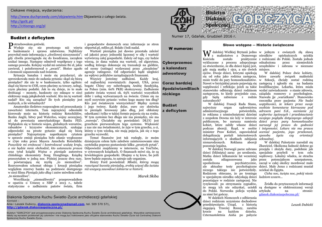 Ciekawe miejsca, wydarzenia: Biuletyn Diakonii Społecznej hp://www.duchprawdy.com/objawienia.htm Objawienia z całego świata. hp://gosc.pl/ hp://cizengo.org/pl Numer 17, Gdańsk, Grudzień 2016 r. BudŜet z deficytem P otrzebowałem gotówki. Wydaje się: nic prostszego niż wizyta w bankomacie i sprawa załatwiona. Najbliższy przywitał mnie informacją o „chwilowej nieczynności”; gdy chwila przeciągnęła się do kwadransa, zacząłem szukać innego. Następny odmówił współpracy z tego samego powodu. Kolejny wydał mi ostatnie 80 zł, jakie zawierał, i poinformował o „awarii”. Słońce zgasło i ciemność zapanowała nad światem. Sytuacja banalna i może się przydarzyć, ale sprowokowała mnie do zadania pytania: skąd się biorą pieniądze? Ale nie te w bankomacie, tylko ogólnie: skąd się bierze to COŚ, czym płacimy za towary, usługi, czym płacimy podatki. Jak to się dzieje, że te małe drobiazgi – monety, banknoty czy mknące w sieci elektrony mają jakąkolwiek wartość. Kto im tę wartość nadał? Kto nią zarządza? Ile tych pieniędzy jest realnych, a ile wirtualnych? Amatorskie śledztwo rozpocząłem od przeszukania zawartości internetu. Tam najczęściej odnośniki kierowały mnie na historię rodziny Rotschildów, Banku Anglii, bitwy pod Waterloo, wojny secesyjnej, aż do powstania amerykańskiego Banku FED. Wplątałem się w historie wojen, globalnych wzrostów, rabunków i kryzysów ekonomicznych, szukając odpowiedzi na proste pytanie: skąd się biorą pieniądze? Najczęstszym napotkanym cytatem w sprawie emisji pieniądza było zdanie wygłoszone w 1790 roku przez Mayera Amschela Rotschilda: Pozwólcie mi emitować i kontrolować walutę kraju, a nie będzie mnie obchodzić, kto ustanawia prawa oraz tytuł książki Wojna o pieniądz autorstwa chińskiego ekonomisty Song Hongbinga. Książkę przeczytałem w jedną noc. Później jeszcze dwa razy, z powtarzającą się myślą „to niemożliwe”. Rozrysowałem schemat obiegu i kreacji pieniądza względem rezerwy banku na podstawie dostępnego w sieci filmu Pieniądz jako dług i znów mówiłem sobie „to niemożliwe”. Weryfikację „niemożliwości” przeprowadziłem w oparciu o Ustawę o NBP z 2013 r., tabele statystyczne o zadłużeniu państw świata, firm i gospodarstw domowych oraz informacje ze stron nbportal.pl, mfiles.pl. Bolało i boli nadal. Wartość pieniądza już dawno przestała zależeć od jakości pracy jednostki łączonej w siłę i wartość wytwórczą całej gospodarki. Zależy od tego, czy ludzie wierzą, że dana waluta ma wartość, od algorytmu, według którego dokonuje się transakcji na giełdzie, od oceny (ratingu) wydawanej przez „niezależne” agencje ratingowe. Od odporności bądź uległości na wpływy polityków zarządzających finansami. Wszyscy jesteśmy zadłużeni. Każdy kraj, od najbardziej rozwiniętych: Japonii, USA, przez bogate Chiny czy suberbogatą Arabię Saudyjską, na Polsce (min. 60% PKB) skończywszy. Zadłużenie państw świata wynosi ok. 65% wartości wszystkich dóbr i usług wytwarzanych na świecie. Ciśnie się na myśl oczywiste pytanie: wobec kogo mamy ten dług? Kto jest światowym wierzycielem? Błędny system i jego twórcy. Każdy dolar, euro czy złotówka to pieniądz kreowany jako dług, jest obłożony odsetkami i tylko w takiej formie pojawia się na rynku. W tym systemie bez długu nie ma pieniędzy, nie ma „rozwoju”. Chciałoby się powiedzieć: DŁUG jest grzechem pierworodnym tego systemu. Większość z nas nie ma świadomości, że żyje w tym grzechu, a ci, którzy o tym wiedzą, nie mają pojęcia, jak się z tego grzechu wyzwolić. Temat finansów jest tak rozległy, że moim dzisiejszym celem było zaledwie zainteresowanie nim czytelnika poprzez postawienie kilku „prostych pytań”. Odpowiedzi znajdziemy w internecie, na YouTube, w cytowanych książkach. O finansach mówi się, że są krwiobiegiem gospodarki. Dbajmy o tę krew, bo jeśli krew będzie zepsuta, to zatruje cały organizm. Henry Ford powiedział: Młodzi, którzy mogą rozwiązać kwestię pieniędzy, zrobią więcej dla świata niż wszyscy zawodowi żołnierze w historii. Marek Skiba Diakonia Społeczna Ruchu Światło-Życie archidiecezji gdańskiej Kontakt : Ania i Leszek Dubiccy, [email protected], tel. 509 570 571, http://gdansk.diakoniaspoleczna.pl/ Biuletyn "GORCZYCA" jest przygotowywana przez Diakonię Społeczną Ruchu Światło-Życie archidiecezji gdańskiej. Wszystkie zamieszczone teksty są wyrazem przekonań jej członków i nie mogą być traktowane jako oficjalne stanowisko Ruchu Światło-Życie lub Centralnej Diakonii Społecznej Ruchu Światło-Życie. Słowo wstępne ― Historie świąteczne W numerze: Cyberprzemoc a kalendarz adwentowy Coraz bardziej #podziwiamBlach nickiego BudŜet z deficytem W dalekiej Wielkiej Brytanii jedno z małżeństwo z Domowego Kościoła zostało praktycznie wykluczone z procesu adopcyjnego za stwierdzenie, że dla dzieci lepiej jest, gdy mają matkę i ojca, a nie dwóch ojców. Dwoje dzieci, którymi opiekują się od roku jako rodzina zastępcza, może trafić do pary homoseksualistów. Nawet w brytyjskiej prasie pojawiają się wątpliwości i refleksja: jeżeli za takie stanowisko odbierają dzieci rodzinom zastępczym, to kiedy przyjedzie czas, gdy będą zabierane z rodzin naturalnych? W dalekiej Francji Rada Stanu, najwyższy organ sądownictwa administracyjnego potwierdziła, że reklama z uśmiechniętymi dziećmi z zespołem Downa nie leży w interesie publicznym, bo narusza sumienia kobiet, które zabiły własne dzieci podczas aborcji. Rząd, w osobie minister Praw Kobiet, zapowiedział delegalizację portali internetowych informujących o skutkach zabijania nienarodzonych. Reklama aborcji pozostaje legalna. W dalekiej Norwegii parze zabrano dzieci (bliźnięta) zaraz po urodzeniu. Matka dzieci kilkanaście lat wcześniej została zdiagnozowana jako upo