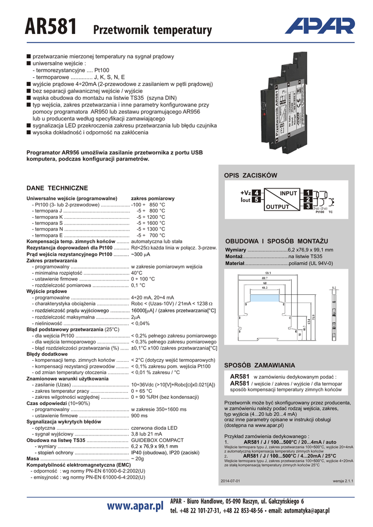 AR581 Przetwornik temperatury n przetwarzanie mierzonej temperatury na sygnał prądowy n uniwersalne wejście : - termorezystancyjne .... Pt100 - termoparowe .............. J, K, S, N, E n wyjście prądowe 4÷20mA (2-przewodowe z zasilaniem w pętli prądowej) n bez separacji galwanicznej wejście / wyjście n wąska obudowa do montażu na listwie TS35 (szyna DIN) n typ wejścia, zakres przetwarzania i inne parametry konfigurowane przy pomocy programatora AR950 lub zestawu programującego AR956 lub u producenta według specyfikacji zamawiającego n sygnalizacja LED przekroczenia zakresu przetwarzania lub błędu czujnika n wysoka dokładność i odporność na zakłócenia Programator AR956 umożliwia zasilanie przetwornika z portu USB komputera, podczas konfiguracji parametrów. OPIS ZACISKÓW DANE TECHNICZNE + 1 +Vz 4 INPUT Uniwersalne wejście (programowalne) zakres pomiarowy 2 Iout 5 - Pt100 (3- lub 2-przewodowe) ..................... -100 ÷ 850 °C 3 (3-p) (2-p) OUTPUT - termopara J ................................................ -5 ÷ 800 °C Pt100 TC - termopara K ............................................... -5 ÷ 1200 °C - termopara S ............................................... -5 ÷ 1600 °C - termopara N ............................................... -5 ÷ 1300 °C - termopara E ............................................... -5 ÷ 700 °C Kompensacja temp. zimnych końców ......... automatyczna lub stała OBUDOWA I SPOSÓB MONTAŻU Rezystancja doprowadzeń dla Pt100 ........... Rd<25W każda linia w połącz. 3-przew. Wymiary .............................6,2 x76,9 x 99,1 mm A Prąd wejścia rezystancyjnego Pt100 ........... ~300 m Montaż.................................na listwie TS35 Zakres przetwarzania Materiał................................poliamid (UL 94V-0) - programowalny .......................................... w zakresie pomiarowym wejścia - minimalna rozpiętość ................................. 40°C - ustawienie firmowe .................................... 0 ÷ 100 °C - rozdzielczość pomiarowa .......................... 0,1 °C Wyjście prądowe - programowalne .......................................... 4÷20 mA, 20÷4 mA - charakterystyka obciążenia ....................... Robc < (Uzas-10V) / 21mA < 1238 W - rozdzielczość prądu wyjściowego .............. 16000[m A] / (zakres przetwarzania[°C] - rozdzielczość maksymalna ........................ 2m A - nieliniowość ............................................... < 0,04% Błąd podstawowy przetwarzania (25°C) - dla wejścia Pt100 ....................................... < 0,2% pełnego zakresu pomiarowego - dla wejścia termoparowego ....................... < 0,3% pełnego zakresu pomiarowego - błąd rozdzielczości przetwarzania (%) ...... ±0,1°C x100 /zakres przetwarzania[°C] Błędy dodatkowe - kompensacji temp. zimnych końców ......... < 2°C (dotyczy wejść termoparowych) SPOSÓB ZAMAWIANIA - kompensacji rezystancji przewodów ......... < 0,1% zakresu pom. wejścia Pt100 - od zmian temperatury otoczenia ............... < 0,01 % zakresu / °C AR581 w zamówieniu dedykowanym podać : Znamionowe warunki użytkowania AR581 / wejście / zakres / wyjście / dla termopar - zasilanie (Uzas) ......................................... 10÷36Vdc (>10[V]+Robc[W ]x0.021[A]) sposób kompensacji temperatury zimnych końców - zakres temperatur pracy ........................... 0 ÷ 65 °C - zakres wilgotności względnej .................... 0 ÷ 90 %RH (bez kondensacji) Czas odpowiedzi (10÷90%) - programowalny .......................................... w zakresie 350÷1600 ms - ustawienie firmowe .................................... 900 ms Sygnalizacja wykrytych błędów - optyczna .................................................... czerwona dioda LED - sygnał wyjściowy ....................................... 3,8 lub 21 mA Obudowa na listwę TS35 .............................. GUIDEBOX COMPACT - wymiary ................................................... 6,2 x 76,9 x 99,1 mm - stopień ochrony ....................................... IP40 (obudowa), IP20 (zaciski) Masa ................................................................ ~ 20g Kompatybilność elektromagnetyczna (EMC) - odporność : wg normy PN-EN 61000-6-2:2002(U) - emisyjność : wg normy PN-EN 61000-6-4:2002(U) www.apar.pl Przetwornik może być skonfigurowany przez producenta, w zamówieniu należy podać rodzaj wejścia, zakres, typ wyjścia (4...20 lub 20...4 mA) oraz inne parametry opisane w instrukcji obsługi (dostępna na www.apar.pl) Przykład zamówienia dedykowanego : 1. AR581 / J / 100...500°C / 20...4mA / auto Wejście termopara typu J, zakres przetwarzania 100÷500°C, wyjście 20÷4mA z automatyczną kompensacją temperatury zimnych końców 2. AR581 / J / 100...500°C / 4...20mA / 25°C Wejście termopara typu J, zakres przetwarzania 100÷500°C, wyjście 4÷20mA ze stałą kompensacją temperatury zimnych końców 25°C 2014-07-01 APAR - Biuro Handlowe, 05-090 Raszyn, ul. Gałczyńskiego 6 tel. +48 22 101-27-31, +48 22 853-48-56 • email: [email protected] wersja 2.1.1