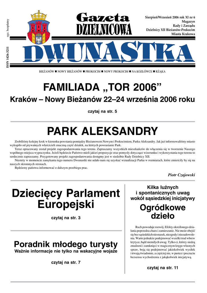 ISSN 1426-3211 egz. bezp³atny Sierpień/Wrzesień 2006 rok XI nr 6 Magazyn Rady i Zarz¹du Dzielnicy XII Bie¿anów-Prokocim Miasta Krakowa Bieżanów n Nowy Bieżanów n Prokocim n Nowy Prokocim n Na Kozłówce n rżąka FAMILIADA „TOR 2006” Kraków – Nowy Bieżanów 22–24 września 2006 roku czytaj na str. 5 PARK ALEKSANDRY Zrobiliśmy kolejny krok w kierunku powstania pomiędzy Bieżanowem Nowym i Prokocimiem, Parku Aleksandry. Jak już informowaliśmy miasto wykupiło od prywatnych właścicieli znaczną część działek, na których powrastanie Park. Teraz opracowany został projekt zagospodarowania tego terenu. Zapraszamy wszystkich mieszkańców do włączenia się w tworzenie Naszego wspólnego miejsca wypoczynku. Jeżeli będziecie Państwo mieli jakieś propozycje oraz pomysły dotyczące wizerunku i wykorzystania tego terenu to serdecznie zapraszamy. Przygotowany projekt zagospodarowania dostępny jest w siedzibie Rady Dzielnicy XII. Niestety w momencie zamykania tego numeru Dwunastki nie udało nam się uzyskać wizualizacji Parku w rozmiarach, które zmieściły by się na naszych skromnych stronach. Będziemy państwa informować o dalszym przebiegu prac. Piotr Czajowski Dziecięcy Parlament Europejski czytaj na str. 3 Poradnik młodego turysty Ważnie informacje nie tylko na wakacyjne wojaże Kilka luźnych i spontanicznych uwag wokół sąsiedzkiej inicjatywy Ogródkowe dzieło Ruch powoduje rozwój. Efekty określonego działania poprzedza chaos i zamieszanie. Nie może obejść się bez sąsiedzkich niesnasek, niezgody i niezadowolenia. Warto jednakże podejmować wszelki trud wbrew krytyce, bądź niemiłych uwag. Tylko ci, którzy siedzą znudzeni i zamknięci w magicznym kręgu własnych spraw, boją się podejmować jakiekolwiek wysiłek i trwają świadomie, a częściej nie, w pustce i poczuciu bezsensu wychodzenia z jakąkolwiek inicjatywą. czytaj na str. 7 czytaj na str. 11 WYMIANA DOWODÓW Do końca 2006 roku powinny zostać wymienione dowody wydane w latach 1992–1995 oraz dowody niewymienione z lat wcześniejszych. Można również wymienić dowód wydany później. Wymiana dowodu osobistego jest obowiązkowa. Zachęca mieszkańców do wymiany starych dowodów osobistych na nowe. Mieszkańcy Krakowa mogą dopełnić niezbędnych formalności codziennie od poniedziałku do piątku w godz. od 8.00 do 18.00. w Wydział Spraw Administracyjnych UMK. Mieszkańcy naszej dzielnicy mogą składać wnioski obsługiwani są na I piętrze budynku Centrum Administracyjnego UMK przy al. Powstania Warszawskiego 10. Dokumenty potrzebne do załatwienia formalności: –wypełniony wniosek, –aktualne i jednakowe fotografie, –dowód uiszczenia opłaty 30 zł, –odpis aktu stanu cywilnego, jeżeli był on sporządzony poza Krakowem (odpis skrócony aktu urodzenia w przypadku osób, które nie wstąpiły w związek małżeński lub odpis skrócony aktu małżeństwa wraz z adnotacją o aktualnie używanym nazwisku). Akcja wymiany zakończy się 31 grudnia 2007 roku. Wtedy też wszystkie dowody „książeczkowe” stracą ważność. opracował Piotr Czajowski Miejski Rzecznik Konsumentów Miejski Rzecznik konsumentów przyjmuje mieszkańców naszego miasta w swojej siedzibie przy Al. Powstania Warszawskiego 10, VI piętro, pokój 615 i 617 w następujących terminach: –w poniedziałki w godzinach od godziny 9.30 do godziny 16.30, –od wtorku do piątku w godzinach od godziny 8.00 do godziny 15.00. Pracownicy Biura Rzecznika udzielają porad prawnych oraz prowadzą obsługę spraw wnoszonych przez Konsumentów do Rzecznika z jego upoważnienia. Sprawy dotyczące naruszenia praw i interesów Konsumentów można wnosić do Rzecznika bezpośrednio (osobiście) lub pisemnie za pośrednictwem poczty. W celu osobistego umówienia się w Biurze Rzecznika należy skontaktować się z Sekretariatem Biura pod numerem telefonu – 0 12 61 69 348, 0 12 61 69 370, 012 61 69 360 i umówić się na konkretny termin. Aby uzyskać pomoc lub poradę prawną należy wziąć ze sobą wszystkie oryginalne dokumenty dotyczące poruszanych spraw np. umowy, faktury, dokumenty gwarancyjne, rachunki itp. Biuro prowadzi telefoniczne porady konsumenckie bezpośrednio pod numerami telefonów: 012 61 69 370 oraz 012 61 69 360. opracował Piotr Czajowski Sierpień/Wrzesień 2006 Dziecięcy Parlament Europejski W słoneczne popołudnie 20 kwietnia 2006r. sala reprezentacyjna Urzędu Miasta Krakowa w Rynku Podgórskim rozbrzmiewała radosnym różnojęzycznym gwarem. Odbywała się wtedy sesja Parlamentu Dziecięcego, pierwsza w Krakowie, a druga w Europie, w ramach projektu „My Dzieci Europy, Obywatele Europy”. Jest to jeden z unijnych programów edukacyjnych. Gospodarzami spotkania w Krakowie byli uczniowie i pedagodzy ze Szkoły Podstawowej nr 123 z ul. Okólnej. Dla naszej szkoły, naszych uczniów mieszkających w mało atrakcyjnej części Krakowa projekt jest wielką szansą na poznanie życia, kultury uczniów z innych krajów. Stanowi to również motywację do uczenia się języków obcych. Nauczyciele mogą poznawać inne systemy edukacyjne, wymieniać doświadczenia. Obradom przewodniczyła Pani mec. Maria Antonina Hołuj z Rady Dzielnicy XII (Rada Dzielnicy XII wsparła nasz projekt finansowo i merytorycznie). Wśród licznie zgromadzonych gości byli nauczyciele ze szkół partnerskich biorących udział w projekcie z Finlandii, Hiszpanii, Włoch, Francji oraz z dwóch placówek w Rumunii, które dołączyły ostatnio do naszej grupy, rodzice naszych uczniów, przedstawiciele patronów medialnych – Dziennika Polskiego i Radia Kraków, Koła Krakowskiego Polskiego Stowarzyszenia Pedagogów i Animatorów KLANZA (instytucji wspierającej projekt) oraz gość szczególny – asystentka krakowskiego posła do Parlamentu Europejskiego Leopolda Rutowicza, Pani Agnieszka Maćkówka. Koordynator projektu Patrick Germain z Francji w swoim wystąpieniu podkreślił, iż to właśnie 