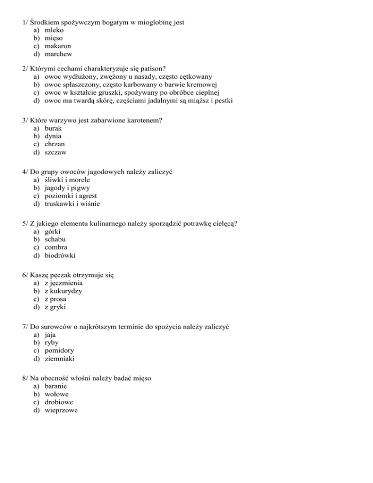 1/ Środkiem spoŜywczym bogatym w mioglobinę jest a) mleko b) mięso c) makaron d) marchew 2/ Którymi cechami charakteryzuje się patison? a) owoc wydłuŜony, zwęŜony u nasady, często cętkowany b) owoc spłaszczony, często karbowany o barwie kremowej c) owoc w kształcie gruszki, spoŜywany po obróbce cieplnej d) owoc ma twardą skórę, częściami jadalnymi są miąŜsz i pestki 3/ Które warzywo jest zabarwione karotenem? a) burak b) dynia c) chrzan d) szczaw 4/ Do grupy owoców jagodowych naleŜy zaliczyć a) śliwki i morele b) jagody i pigwy c) poziomki i agrest d) truskawki i wiśnie 5/ Z jakiego elementu kulinarnego naleŜy sporządzić potrawkę cielęcą? a) górki b) schabu c) combra d) biodrówki 6/ Kaszę pęczak otrzymuje się a) z jęczmienia b) z kukurydzy c) z prosa d) z gryki 7/ Do surowców o najkrótszym terminie do spoŜycia naleŜy zaliczyć a) jaja b) ryby c) pomidory d) ziemniaki 8/ Na obecność włośni naleŜy badać mięso a) baranie b) wołowe c) drobiowe d) wieprzowe 9/ Na podstawie danych w tabeli określ maksymalny czas przechowywania papryki a) 2 tygodnie b) 4 tygodnie Nazwa grupy warzyw Czas przechowywania w chłodni c) 7 miesięcy liściowe 2 tygodnie d) 8 miesięcy owocowe 4 tygodnie cebulowe 7 miesięcy korzeniowe 8 miesięcy 10/ Który z wymienionych surowców naleŜy przechowywać w najniŜszej temperaturze? a) mleko b) owoce c) warzywa d) pieczywo 11/ WskaŜ optymalne warunki przechowywania produktów zboŜowych a) b) c) d) Temperatura 0-4oC 0-4oC 10-14oC 10-14oC Wilgotność względna ok. 60% ok. 95% ok. 60% ok. 95% 12/ Mycie mięsa przed włoŜeniem do lodówki powoduje a) twardnienie mięsa b) rozwój drobnoustrojów c) pęcznienie substancji białkowych d) wypłukiwanie składników mineralnych 13/ Która instrukcja stosowana w zakładzie gastronomicznym dotyczy systemu GHP? a) instrukcja przyjęcia towaru b) instrukcja higieny personelu c) instrukcja ekspedycji potraw d) instrukcja rozmraŜania surowców 14/ Który produkt został utrwalony metodą biologiczną? a) ogórki kiszone b) pomidory suszone c) szpinak blanszowany d) pieczarki liofilizowane 15/ W celu całkowitego zniszczenia drobnoustrojów w utrwalanej Ŝywności naleŜy zastosować a) mroŜenie b) peklowanie c) sterylizowanie d) pasteryzowanie 16/ Na podstawie normatywu surowcowego wskaŜ metodę utrwalania dyni a) kiszenie b) liofilizacja Normatyw surowcowy c) pasteryzacja 1,0 kg obranej dyni d) marynowanie 0,5 kg cukru 0,3 l octu winnego przyprawy 17/ Urządzenia przedstawionego na zdjęciu naleŜy uŜyć do a) wyparzania jaj b) schładzania potraw c) pakowania próŜniowego d) przechowywania mroŜonek 18/ Kuchnia gorąca nie moŜe mieć bezpośredniego połączenia a) z ekspedycją potraw b) z magazynem odpadów c) z przygotowalnią czystą d) z magazynem szefa kuchni 19/ Pobrana z magazynu mąka ze śladami obecności szkodników a) moŜe być zastosowana do wypieków b) nie moŜe być dopuszczona do produkcji c) musi zostać przesiana trzykrotnie przed zastosowaniem d) moŜe zostać wykorzystana do produkcji ciasta gotowanego 20/ Jeśli do produkcji 5 porcji potrawy zuŜyto 600g surowca, to do sporządzenia 3 porcji tej potrawy naleŜy przygotować a) 0,12 kg b) 0,20 kg c) 0,36 kg d) 0,48 kg 21/ Mąka krupczatka, masło, jaja to składniki, których naleŜy uŜyć do sporządzenia klusek a) lanych b) francuskich c) kładzionych d) półfrancuskich 22/ Który deser naleŜy sporządzić na podstawie przedstawionego normatywu a) krem bawarski b) krem sułtański Surowiec Ilość c) mus czekoladowy Śmietanka 30% 800ml d) suflet czekoladowy Cukier – puder 100g Kakao 30g Rodzynki 100g Płatki migdałowe 75g Bezy 100g Cukier wanilinowy do smaku 23/ Którego surowca brakuje w przedstawionym wykazie surowców, potrzebnych do sporządzenia pstrąga na niebiesko a) piwa Surowiec b) octu Pstrąg rzeczny c) oleju Włoszczyzna d) mleka Ziele angielskie Pieprz Gorczyca Sól 24/ Stopień wysmaŜenia steku well done charakteryzuje się a) słabym wysmaŜeniem b) średnim wysmaŜeniem c) bardzo dobrym wysmaŜeniem d) praktycznie surowym mięsem 25/ Cztery filety uzyskuje się podczas filetowania a) karpia b) śledzia c) turbota d) węgorza 26/ Forma rozdrabniania warzyw w piórka jest charakterystyczna dla a) cebuli b) chrzanu c) marchwi d) pomidora 27/ Kisiel mleczny naleŜy zagęścić a) jajami b) śmietanką c) mąką pszenną d) mąką ziemniaczaną 28/ Eklery i ptysie naleŜy sporządzać z ciasta a) zbijanego b) parzonego c) francuskiego d) półfrancuskiego 29/ Befsztyk naleŜy sporządzać a) z ligawy b) z antrykotu c) z polędwicy wołowej d) z polędwicy wieprzowej 30/ Krokiety z farszem z kapusty i grzybów naleŜy formować a) w sakiewkę b) w chusteczkę c) w rulon otwarty d) w rulon zamknięty 31/ Do ugotowania 1 kg kaszy gryczanej na sypko naleŜy przygotować wodę w ilości a) 1,0 l b) 1,5 l c) 2,0 l d) 2,5 l 32/ WskaŜ, ile czasu naleŜy zaplanować do upieczenia 15 porcji zapiekanek, jeŜeli jednocześnie w czasie 30 minut moŜna upiec 3 porcje. a) 1,5 godz. b) 2,0 godz. c) 2,5 godz. d) 3,0 godz. 33/ Zupę owocową naleŜy zagęszczać a) zasmaŜką I stopnia b) podprawą zacieraną c) zawiesiną z mąki pszennej d) zawiesiną z mąki ziemniaczanej 34/ Podczas sporządzania wyrobów z ciasta droŜdŜowego gluten zawarty w mące pszennej zwiększa a) objętość i trwałość ciasta b) spoistość i ciągliwość ciasta c) ilość powietrza w wyrobach d) ilość skrobi podczas zarabiania 35/ Związki Maillarda powstają podczas produkcji a) kotletów b) surówek c) ziemniaków z wody d) pulpetów drobiowych 36/ Delikatny smak kapusty włoskiej uzyskuje się dzięki gotowaniu jej a) z olejem b) z cukrem c) z masłem d) z mlekiem 37/ Przedstawioną na zdjęciu przystawkę do maszyny wieloczynnościowej naleŜy stosować do a) tarcia sera b) mielenia kawy c) nacinania kotletów d) przecierania owoców 38/ Steamery naleŜy stosować do a) gotowania na parze b) gotowa