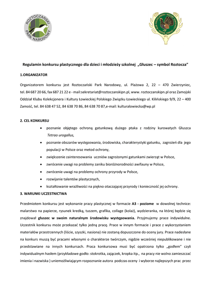 Regulamin konkursu plastycznego dla dzieci i młodzieży szkolnej „Głuszec – symbol Roztocza” 1.ORGANIZATOR Organizatorem konkursu jest Roztoczański Park Narodowy, ul. Plażowa 2, 22 – 470 Zwierzyniec, tel. 84 687 20 66, fax 687 21 22 e - mail:[email protected], www. roztoczanskipn.pl oraz Zamojski Oddział Klubu Kolekcjonera i Kultury Łowieckiej Polskiego Związku Łowieckiego ul. Kilińskiego 9/9, 22 – 400 Zamość, tel. 84 638 47 52, 84 638 70 86, 84 638 70 87,e-mail: [email protected] 2. CEL KONKURSU poznanie objętego ochroną gatunkową dużego ptaka z rodziny kurowatych Głuszca Tetrao urogallus, poznanie obszarów występowania, środowiska, charakterystyki gatunku, zagrożeń dla jego populacji w Polsce oraz metod ochrony, zwiększenie zainteresowania uczniów zagrożonymi gatunkami zwierząt w Polsce, zwrócenie uwagi na problemy zaniku bioróżnorodności awifauny w Polsce, zwrócenie uwagi na problemy ochrony przyrody w Polsce, rozwijanie talentów plastycznych, kształtowanie wrażliwości na piękno otaczającej przyrody i konieczność jej ochrony. 3. WARUNKI UCZESTNICTWA Przedmiotem konkursu jest wykonanie pracy plastycznej w formacie A3 - poziome w dowolnej technice: malarstwo na papierze, rysunek kredką, tuszem, grafika, collage (kolaż), wydzieranka, na której będzie się znajdował głuszec w swoim naturalnym środowisku występowania. Przyjmujemy prace indywidulne. Uczestnik konkursu może przekazać tylko jedną pracę. Prace w innym formacie i prace z wykorzystaniem materiałów przestrzennych (liście, szyszki, nasiona) nie zostaną dopuszczone do oceny jury. Prace nadesłane na konkurs muszą być pracami własnymi o charakterze twórczym, nigdzie wcześniej niepublikowane i nie przedstawiane na innych konkursach. Praca konkursowa musi być opatrzona tylko „godłem” czyli indywidualnym hasłem (przykładowe godło: stokrotka, zajączek, kropka itp., na pracy nie wolno zamieszczać imienia i nazwiska ) uniemożliwiającym rozpoznanie autora podczas oceny i wyborze najlepszych prac przez jury konkursu a ułatwiającym identyfikację pracy i danych osobowych uczestnika konkursu dopiero po zapoznaniu się z kartą zgłoszenia. Każdej pracy musi towarzyszyć wypełniona karta zgłoszenia (zał. 1 Regulaminu) oraz w przypadku autorów niepełnoletnich wypełnione oświadczenie opiekuna prawnego (zał. 2 Regulaminu). Karta zgłoszenia i wypełnione oświadczenie opiekuna prawnego w przypadku osób niepełnoletnich powinno zostać dołączone do pracy w zaklejonej kopercie. Koperta ta musi być podpisana tylko godłem. Konkurs ma charakter otwarty. Udział w nim jest bezpłatny. Konkurs jest rozgrywany w czterech kategoriach wiekowych dla następujących uczestników: Uczniowie szkół podstawowych, klasy I – III Uczniowie szkół podstawowych, klasy IV - VI Uczniowie szkół gimnazjalnych Uczniowie szkół ponadgimnazjalnych W konkursie nie mogą brać udziału członkowie rodzin pracowników z podmiotów biorących udział w przygotowaniu lub prowadzeniu konkursu „Głuszec – symbol Roztocza” 4. JURY KONKURSU Organizatorzy powołają Jury Konkursowe w skład, którego wejdą plastycy i przyrodnicy. Zadaniem Jury będzie ocena prac oraz przygotowanie listy laureatów i wyróżnionych. W ocenie prac Jury będzie stosować kryteria: a) zgodność z tematem, b) walory artystyczne, c) jakość wykonania. Decyzje Jury są ostateczne. 5. NAGRODY Nagrody w konkursie przyznaje Roztoczański Park Narodowy oraz Zamojski Oddział Klubu Kolekcjonera i Kultury Łowieckiej Polskiego Związku Łowieckiego na podstawie protokołu Jury Konkursowego. W każdej kategorii wiekowej zostanie wybranych 3 laureatów (I, II, III miejsce) i 3 osoby wyróżnione, którym zostaną przyznane nagrody. Jury konkursu może zadecydować o innym podziale nagród. Nagrodami w konkursie są m.in. nagrody niespodzianki, pamiątkowe dyplomy, okolicznościowe kubki, puzzle, pendrive + smycze oraz wydawnictwa Roztoczańskiego Parku Narodowego. 6.TERMIN I MIEJSCE SKŁADANIA PRAC Zgłoszone do konkursu prace muszą zostać dostarczone do Roztoczańskiego Parku Narodowego, ul. Plażowa 2, 22 – 470 Zwierzyniec (dyrekcja RPN, sekretariat), pocztą albo osobiście w nieprzekraczalnym terminie do dnia 25 maja 2016 roku. Prace należy odpowiednio zapakować, aby zabezpieczyć je przed zniszczeniem w czasie transportu. Na kopercie z pracą należy napisać dopisek „Konkurs plastyczny Głuszec symbol Roztocza”. O zakwalifikowaniu pracy do konkursu decyduje data stempla pocztowego. Prace nadesłane po terminie nie wezmą udziału w konkursie. 7.OGŁOSZENIE WYNIKÓW KONKURSU Laureaci konkursu i autorzy wyróżnieni zostaną telefonicznie zawiadomieni o wynikach konkursu i zaproszeni do udziału w uroczystych obchodach odsłonięcia pomnika głuszca, które odbędą się dnia 11 czerwca 2016r. przed Ośrodkiem Edukacyjno – Muzealnym Roztoczańskiego Parku Narodowego, ul. Plażowa 3, 22 – 470 Zwierzyniec z okazji X Krajowego Zjazdu Delegatów Klubu Kolekcjonera i Kultury Łowieckiej PZŁ. Podczas uroczystości nastąpi oficjalne ogłoszenie wyników i wręczenie nagród. Wyniki konkursu będą również opublikowane na stronie internetowej Roztoczańskiego Parku Narodowego pod adresem www. roztoczanskipn.pl. Wyniki konkursu i prace laureatów oraz osób wyróżnionych zostaną także opublikowane w kwartalniku „Myśliwiec kresowy”, czasopiśmie wydawanym przez Okręgową Radę Łowiecką w Zamościu. 8. INFORMACJE DODATKOWE Przystąpienie do konkursu jest jednoznaczne z przekazaniem majątkowych praw autorskich do prac plastycznych na rzecz Roztoczańskiego Parku Narodowego. Prace nadesłane na konkurs przechodzą na własność Roztoczańskiego Parku Narodowego. Z nadesłanych na konkurs prac zostanie stworzona wystawa w Ośrodku Edukacyjno – Muzealnym Roztoczańskiego Parku Narodowego. W przypadku nadesłania bardzo dużej ilości prac ze względów technicznych będą wyekspon