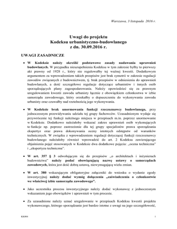 Warszawa, 3 listopada 2016 r. Uwagi do projektu Kodeksu urbanistyczno-budowlanego z dn. 30.09.2016 r. UWAGI ZASADNICZE W Kodeksie należy określić podstawowe zasady nadawania uprawnień budowlanych. W przypadku nieuzupełnienia Kodeksu w tym zakresie byłby to pierwszy akt prawny od 1928 r., który nie regulowałby tej ważnej kwestii. Dodatkowym argumentem za wprowadzeniem takich przepisów jest brak symetrii w zakresie regulacji zawodów związanych z budownictwem, tj. brak przepisów w odniesieniu do uprawnień budowlanych, a dość szczegółowe regulacje dotyczące urbanistów i innych osób sporządzających plany zagospodarowania. Należy opowiedzieć się za prawnym uregulowaniem kwestii zawodu urbanisty łącznie z obowiązkiem członkostwa w izbie samorządu zawodowego, który orzekałby o dopuszczeniu do wykonywania zawodu urbanisty oraz czuwałby nad rzetelnością jego wykonywania. W Kodeksie brak unormowania funkcji rzeczoznawcy budowlanego, przy jednoczesnym przewidywaniu udziału tej grupy fachowców. Uzasadnionym wydaje się przywrócenie tej funkcji należnego miejsca w przepisach m.in. poprzez unormowanie w Kodeksie. Dodatkowo należałoby wskazać zakres uprawnień osób wykonujących te funkcje np. poprzez zastrzeżenie dla tej grupy specjalistów prawa sporządzania ekspertyz oraz prawa dokonywania oceny istotnych odstępstw od warunków technicznych. W związku z wprowadzeniem regulacji dotyczącej funkcji rzeczoznawcy budowlanego należałoby również wprowadzić do art. 2 Kodeksu zawierającego objaśnienia pojęć stosowanych w Kodeksie dwa dodatkowe pojęcia: ,,ocena techniczna” i ,,ekspertyza techniczna”. W art. 357 § 3 odwołującym się do przepisów ,,o architektach i inżynierach budownictwa” należy podać obowiązującą nazwę ustawy o samorządach zawodowych, która jest dość dobrą ustawą, niewymagającą wielu zmian. W art. 380 wskazującym obligatoryjne załączniki do wniosku o wydanie zgody inwestycyjnej należy dodać wymóg dołączenia ,,zaświadczenia o członkostwie we właściwej izbie samorządu zawodowego”. Jako uczestnika procesu inwestycyjnego należy dodać wykonawcę z jednoczesnym wskazaniem jego obowiązków i uprawnień w tym procesie. Za uzasadnione należy uznać uregulowanie w przepisach Kodeksu kwestii projektu wykonawczego, którego sporządzanie jest bardzo istotne z uwagi na jego szczegółowość, KK004 1 co ma znaczenie dla prawidłowej realizacji obiektu budowlanego. Jednocześnie należy zastrzec obowiązek sporządzania takich projektów przez osoby posiadające odpowiednie uprawnienia budowlane, będące członkami właściwej izby samorządu zawodowego. Z uwagi na szeroki zakres zmian należy zadbać o dłuższy okres vacatio legis, przy rozważeniu możliwości wprowadzenia zróżnicowanego czasu wejścia w życie w odniesieniu do poszczególnych regulacji. Analiza projektu wskazuje, że w projekcie Kodeksu zabrakło pewnych istotnych zagadnień, np. w zakresie: stosowania Eurokodów; obligatoryjnych etapów prac przedprojektowych; kierunkowych rozwiązań dla BIM i nowych technologii. I. UWAGI OGÓLNE Jednym z pierwszych spostrzeżeń po lekturze projektu kodeksu jest jego asymetria, tj. różne potraktowanie części urbanistycznej i budowlanej. Dotyczy to nie tylko objętości dokumentu, ale przede wszystkim zakresu regulacji. O ile w części urbanistycznej szczegółowo opisano różnego rodzaju procedury, o tyle w części budowlanej w wielu kwestiach natury kodeksowej odsyła się do regulacji odrębnych (samodzielne funkcje techniczne w budownictwie, organy nadzoru budowlanego, wyroby budowlane). Taka struktura dokumentu sprawia, że pełna i odpowiedzialna ocena przewidzianych w Kodeksie rozwiązań bez znajomości zapowiadanych przepisów odrębnych oraz przepisów wprowadzających jest obarczona co najmniej ryzykiem wielkiego błędu. II. OCENA STANU DOTYCHCZASOWEGO 1) Należy uznać, że wskazana w uzasadnieniu projektu ustawy ocena dotychczasowych regulacji prawnych oraz ich funkcjonowania w zakresie szeroko rozumianej gospodarki przestrzennej i procesu budowlanego, co do zasady jest trafna. Szczególnie odnosi się to do problematyki gospodarki przestrzennej, w nieco mniejszym stopniu do procesu budowlanego. Wobec powyższego, w niniejszej opinii wskazuje się jedynie te elementy oceny stanu dotychczasowego, które budzą wątpliwości. 2) Autorzy uzasadnienia projektu Kodeksu na równi potraktowali wadliwie skonstruowane instytucje prawne bądź konkretne przepisy i ukształtowaną, często niewłaściwą praktykę ich stosowania. Tymczasem najlepszy nawet przepis, ale niewłaściwie stosowany nie przyniesie zakładanych efektów. W takich przypadkach warto zastanowić się nad przyczynami błędnego funkcjonowania przepisu, czy zmieniać go na inny tylko wobec braku środków skutecznego wyegzekwowania rozwiązania już istniejącego. Przykładem tego może być podejście do „renty planistycznej”, odszkodowań bądź wysokich kosztów realizacji infrastruktury KK004 2 technicznej na terenach rozproszonej zabudowy. W takich przypadkach ocenę stanu powinien poprzedzać audyt. 3) Koszty realizacji infrastruktury technicznej na terenach rozproszonej zabudowy są wynikiem polityki gminy a nie obowiązujących regulacji prawnych. Ustawodawca nie tylko nie zabraniał tworzenia przepisów ograniczających rozpraszanie zabudowy – miejscowych planów zagospodarowania przestrzennego, a wręcz do ich tworzenia zachęcał. Gminy, które z tych możliwości nie chciały korzystać nie mogą teraz podnosić argumentu kosztów infrastruktury. 4) Wątpliwości budzi zawarta w uzasadnieniu projektu ocena regulacji dotyczących samowoli budowlanej. Regulacje te są dalekie od doskonałości ze względu na ich nadmierny automatyzm i oderwanie od faktycznej wartości samowoli. Ale te argumenty są wspomniane jako uzupełaniające do przyjęcia zasady „braku sankcji za naruszenie ustaleń planu miej