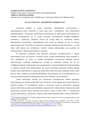 MAREK KONSTANKIEWICZ (Zakład Archiwistyki, Uniwersytet Marii Curie Skłodowskiej) ADRIAN NIEWĘGŁOWSKI (Katedra Prawa Gospodarczego i Handlowego, Uniwersytet Marii Curie Skłodowskiej) STATUS PRAWNY ARCHIWÓW OSOBISTYCH1 Archiwum osobiste to całość materiałów archiwalnych wytworzonych i zgromadzonych przez człowieka w czasie jego życia i działalności, wraz archiwaliami odziedziczonymi. Tradycyjnie archiwistyka interesowała się spuściznami archiwalnymi po osobach wyróżniających się ze swego otoczenia, prowadzących rozległą działalność zawodową i społeczną. Aktualnie zwraca się uwagę także na archiwalną wartość dokumentacji wytworzonej i zgromadzonej przez osoby nie należący do tak czy inaczej pojmowanych elit. Wszystkie te archiwalia wzbudzają zainteresowanie historyków, a wśród wielu osób obecna jest świadomość wartości własnej dokumentacji oraz potrzeba jej zabezpieczenia w dłuższej perspektywie czasowej. W archiwach osobistych jako pewnych całościach ukształtowanych w sposób indywidualny przez ich twórców wyróżnić można zwykle dokumentację, która narastała w toku działalności tej osoby (w ramach niewątpliwie specyficznej odmiany procesu aktowórczego), materiały odziedziczone (zwykle po członkach rodziny, ale też po współpracownikach i instytucjach) oraz zgromadzone w ramach działalności kolekcjonerskiej w zakresie różnych form dokumentacji. Do użycia określenia archiwum osobiste skłania właśnie chęć podkreślenia, iż spuścizna archiwalna traktowana jako integralna całość może być nie tylko wynikiem prowadzonej działalności kancelaryjnej, ale też kolekcjonerstwa czy urzeczywistnienia potrzeby dokumentowania życia własnego i swych bliskich2. Celem niniejszego referatu jest syntetyczne przedstawienie statusu prawnego interesującego nas rodzaju archiwaliów oraz złożonych z nich organicznych całości jakimi są archiwa osobiste. W szczególności chodzi o zwrócenie uwagi na specyficzne regulacje prawne, które dotyczą takowych materiałów wyłącznie lub w dużej mierze. Podstawowym dla poniższych rozważań aktem prawnym jest ustawa z dnia 14 lipca 1983 r. o narodowym zasobie archiwalnym i archiwach, w dalszej części tekstu określana jako „ustawa archiwalna” 1 Praca naukowa finansowana ze środków budżetowych na naukę w latach 2010-2012 jako projekt badawczy (Nr projektu: N N110 150039). 2 A. Piber, Spuścizna – jej istota, zawartość, układ, metody porządkowania, „Archeion” t. 42, 1965, s. 44-45. Różne propozycje terminologiczne zestawia R. Górski, Archiwa osobiste. Problemy gromadzenia, opracowania i udostępniania, „Problemy Archiwistyki” 2009, nr 2, [dostęp on-line, 19 V 2009 r.] http://www.archiwa.gov.pl/images/stories/Wydawnictwa/Problemy2_5.pdf , s. 22-23. 2 3 . Pominięto kwestię rozgraniczenia archiwaliów od materiałów bibliotecznych, a w pewnej mierze też od muzealiów i zabytków. Ma ona znaczenie nie tylko dla definiowania zadań różnych rodzajów instytucji pamięci, ale wiąże się z nią możliwość stosowania do niektórych przynajmniej rodzajów dokumentacji regulacji prawa bibliotecznego, muzealnego oraz dotyczącego ochrony zabytków. Dla oceny statusu prawnego archiwaliów o charakterze osobistym kluczowa jest definicja nieewidencjonowanego niepaństwowego zasobu archiwalnego zawarta w art. 46 ustawy archiwalnej. Wskazano w nim na dwie przesłanki zaliczenia archiwaliów do tej kategorii. Pierwsza to fakt powstania materiałów w wyniku działalności osób fizycznych, zaś druga to warunek by były one własnością tych osób (w domyśle w wyniku działalności których powstały) lub ich prawnych następców. Z takiej konstrukcji wynika, iż omawiana część narodowego zasobu archiwalnego zasadniczo nie może obejmować archiwaliów wytworzonych przez wszelkie jednostki organizacyjne, zwłaszcza że art. 7 i 43 ustawy archiwalnej wyłączają możliwość by stanowiły one własność osoby fizycznej4. Pewna wątpliwość wiąże się z sytuacją gdy wytworzone i zgromadzone przez osobę fizyczną archiwalia staną się własnością jej prawnego następcy. Potencjalnie może nim być osoba fizyczna, osoba prawna jak i jednostka organizacyjna niebędąca osobą prawną, której ustawa przyznaje zdolność prawną. Do przeniesienia własności może dojść w drodze umowy lub dziedziczenia. Literalne brzmienie art. 46 sugeruje, że przedmiotowe archiwalia nadal stanowią nieewidencjonowany niepaństwowy zasób archiwalny. Tymczasem według art. 15 ust. 2 archiwalia wytworzone przez osobę fizyczną, jeśli przeszły na własność Państwa stanowią państwowy zasób archiwalny. Z kolei art. 42 wskazuje, że do ewidencjonowanego niepaństwowego zasobu archiwalnego należą archiwalia powstałe w wyniku działalności określonych w nim jednostek organizacyjnych oraz stanowiące ich własność, a więc również materiały innej proweniencji. Wydaje się więc, że wytworzone przez osobę fizyczną archiwalia należą do nieewidencjonowanego niepaństwowego zasobu archiwalnego dopóki nie staną się własnością jednostki organizacyjnej. Gdy to ostatnie nastąpi, zależnie od statusu tego podmiotu wchodzą odpowiednio do ewidencjonowanego niepaństwowego lub państwowego zasobu archiwalnego i zostają objęte ściślejszą ochroną prawną. Przyjęcie odmiennej 3 Ustawa z dnia 14 lipca 1983 r. o narodowym zasobie archiwalnym i archiwach (tekst jednolity Dz. U. 2011, nr 123, poz. 698; zm. nr 171, poz. 1016). 4 W praktyce spuścizny archiwalne po osobach fizycznych zwierają dokumentację proweniencji instytucjonalnej, na co zwracał uwagę A. Piber, Spuścizna – jej istota, zawartość, układ, metody porządkowania, „Archeion” t. 42, 1965, s. 54-55. 3 interpretacji prowadziło by sytuacji, że zachowujące status nieewidencjonowanego niepaństwowego zasobu archiwalnego materiały archiwalne znajdujące się w zasobie na przy