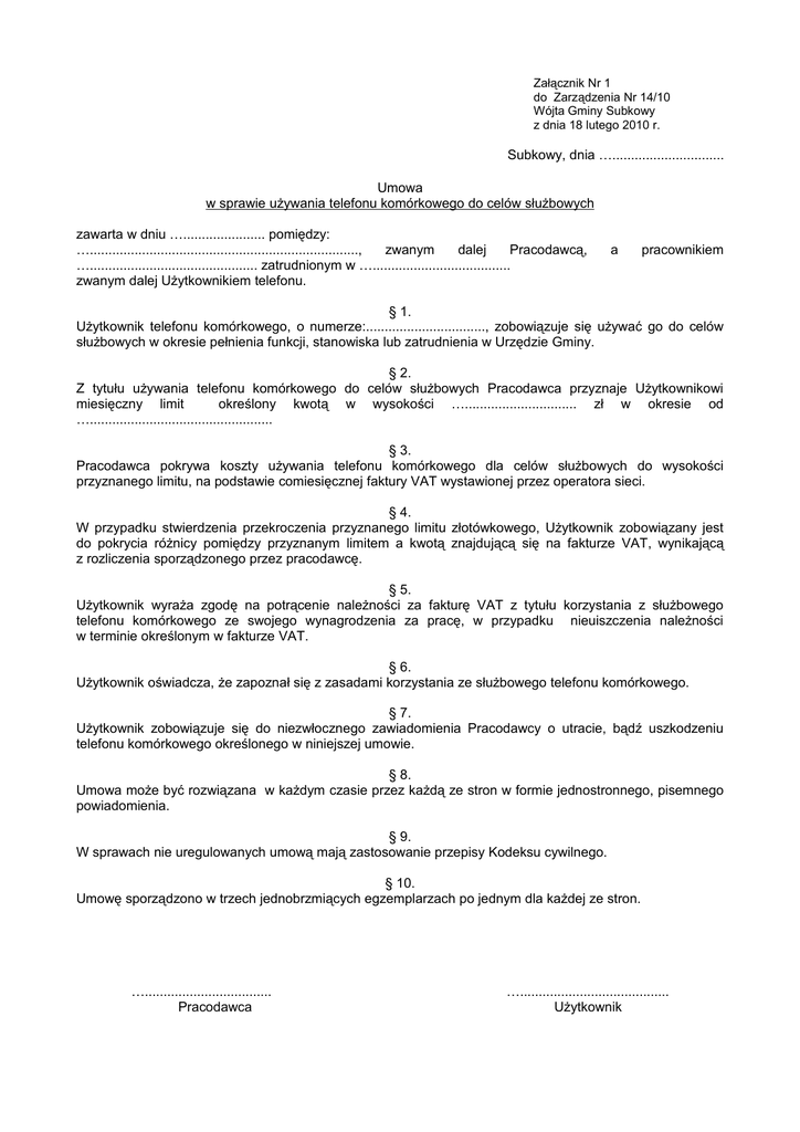 Załącznik Nr 1 do Zarządzenia Nr 14/10 Wójta Gminy Subkowy z dnia 18 lutego 2010 r. Subkowy, dnia ….............................. Umowa w sprawie używania telefonu komórkowego do celów służbowych zawarta w dniu …...................... pomiędzy: …........................................................................, zwanym dalej Pracodawcą, …............................................. zatrudnionym w …..................................... zwanym dalej Użytkownikiem telefonu. a pracownikiem § 1. Użytkownik telefonu komórkowego, o numerze:................................, zobowiązuje się używać go do celów służbowych w okresie pełnienia funkcji, stanowiska lub zatrudnienia w Urzędzie Gminy. § 2. Z tytułu używania telefonu komórkowego do celów służbowych Pracodawca przyznaje Użytkownikowi miesięczny limit określony kwotą w wysokości ….............................. zł w okresie od …................................................. § 3. Pracodawca pokrywa koszty używania telefonu komórkowego dla celów służbowych do wysokości przyznanego limitu, na podstawie comiesięcznej faktury VAT wystawionej przez operatora sieci. § 4. W przypadku stwierdzenia przekroczenia przyznanego limitu złotówkowego, Użytkownik zobowiązany jest do pokrycia różnicy pomiędzy przyznanym limitem a kwotą znajdującą się na fakturze VAT, wynikającą z rozliczenia sporządzonego przez pracodawcę. § 5. Użytkownik wyraża zgodę na potrącenie należności za fakturę VAT z tytułu korzystania z służbowego telefonu komórkowego ze swojego wynagrodzenia za pracę, w przypadku nieuiszczenia należności w terminie określonym w fakturze VAT. § 6. Użytkownik oświadcza, że zapoznał się z zasadami korzystania ze służbowego telefonu komórkowego. § 7. Użytkownik zobowiązuje się do niezwłocznego zawiadomienia Pracodawcy o utracie, bądź uszkodzeniu telefonu komórkowego określonego w niniejszej umowie. § 8. Umowa może być rozwiązana w każdym czasie przez każdą ze stron w formie jednostronnego, pisemnego powiadomienia. § 9. W sprawach nie uregulowanych umową mają zastosowanie przepisy Kodeksu cywilnego. § 10. Umowę sporządzono w trzech jednobrzmiących egzemplarzach po jednym dla każdej ze stron. ….................................. Pracodawca …........................................ Użytkownik