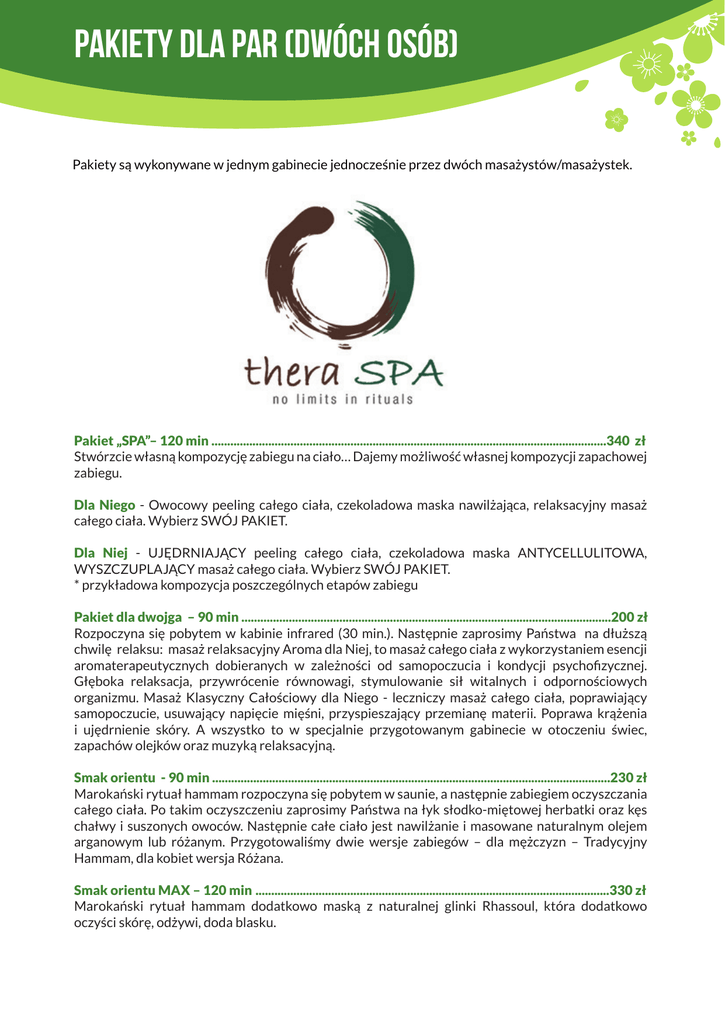 PAKIETY DLA PAR (dwóch osób) Pakiety są wykonywane w jednym gabinecie jednocześnie przez dwóch masażystów/masażystek. Pakiet „SPA”– 120 min .............................................................................................................................340 zł Stwórzcie własną kompozycję zabiegu na ciało… Dajemy możliwość własnej kompozycji zapachowej zabiegu. Dla Niego - Owocowy peeling całego ciała, czekoladowa maska nawilżająca, relaksacyjny masaż całego ciała. Wybierz SWÓJ PAKIET. Dla Niej - UJĘDRNIAJĄCY peeling całego ciała, czekoladowa maska ANTYCELLULITOWA, WYSZCZUPLAJĄCY masaż całego ciała. Wybierz SWÓJ PAKIET. * przykładowa kompozycja poszczególnych etapów zabiegu Pakiet dla dwojga – 90 min .....................................................................................................................200 zł Rozpoczyna się pobytem w kabinie infrared (30 min.). Następnie zaprosimy Państwa na dłuższą chwilę relaksu: masaż relaksacyjny Aroma dla Niej, to masaż całego ciała z wykorzystaniem esencji aromaterapeutycznych dobieranych w zależności od samopoczucia i kondycji psychofizycznej. Głęboka relaksacja, przywrócenie równowagi, stymulowanie sił witalnych i odpornościowych organizmu. Masaż Klasyczny Całościowy dla Niego - leczniczy masaż całego ciała, poprawiający samopoczucie, usuwający napięcie mięśni, przyspieszający przemianę materii. Poprawa krążenia i ujędrnienie skóry. A wszystko to w specjalnie przygotowanym gabinecie w otoczeniu świec, zapachów olejków oraz muzyką relaksacyjną. Smak orientu - 90 min ..............................................................................................................................230 zł Marokański rytuał hammam rozpoczyna się pobytem w saunie, a następnie zabiegiem oczyszczania całego ciała. Po takim oczyszczeniu zaprosimy Państwa na łyk słodko-miętowej herbatki oraz kęs chałwy i suszonych owoców. Następnie całe ciało jest nawilżanie i masowane naturalnym olejem arganowym lub różanym. Przygotowaliśmy dwie wersje zabiegów – dla mężczyzn – Tradycyjny Hammam, dla kobiet wersja Różana. Smak orientu MAX – 120 min ................................................................................................................330 zł Marokański rytuał hammam dodatkowo maską z naturalnej glinki Rhassoul, która dodatkowo oczyści skórę, odżywi, doda blasku. PAKIETY DLA PAR (dwóch osób) Pomarańczowe orzeźwienie dla dwojga – 90 min ............................................................................240 zł Specjalnie skomponowany zabieg, składający się z pomarańczowego peelingu ciała, oraz pomarańczowego masażu ciała. Działanie olejku pomarańczowego przede wszystkim wpływa kojąco na układ nerwowy, wzmacnia tkankę łączną, a jego działanie ujędrniające i antycellulitowe sprawa, że skóra po zabiegu jest napięta, nawilżona i bardzo gładka. Zabieg połączony z degustacją różnych smaków pomarańczowych. A wszystko to w specjalnie przygotowanym gabinecie w otoczeniu świec, zapachów olejków oraz muzyką relaksacyjną. Słodki Całus – 120 min .............................................................................................................................240 zł Pobyt kabinie infrared (60 min), masaż ciepłym miodem dla Niej – to rozluźniający zabieg masażu z polewaniem ciała ciepłym miodem i oliwą. Oprócz głęboko odżywczego, nawilżającego i przeciwstarzeniowego działania, ma charakter terapeutyczny, wpływa przeciwzapalnie i przeciwbólowo, masaż Aroma dla Niego - to masaż całego ciała z wykorzystaniem esencji aromaterapeutycznych dobieranych w zależności od samopoczucia i kondycji psychofizycznej. Efektem zabiegów jest gładka i odżywiona skóra oraz relaks całego ciała. A wszystko to w specjalnie przygotowanym gabinecie w otoczeniu świec, zapachów olejków oraz muzyką relaksacyjną. Ona i On – 2,15 min ...................................................................................................................................290 zł Peeling całego ciała wraz z masażem relaksacyjnym częściowym z wykorzystaniem esencji aromaterapeutycznych dobieranych w zależności od samopoczucia i kondycji psychofizycznej. Głęboka relaksacja, przywrócenie równowagi, stymulowanie sił witalnych i odpornościowych organizmu. Efektem zabiegów jest gładka i odżywiona skóra. Na koniec relaksujący masaż twarzy. A wszystko to w specjalnie przygotowanym gabinecie w otoczeniu świec, zapachów olejków oraz muzyką relaksacyjną. Relax we Dwoje – 120 min ......................................................................................................................280 zł Pobyt w SPA rozpoczyna się pobytem w kabinie infrared (60 min.). Następnie wykonywany jest Masaż Świecą dla Niej- to zabieg łączący w sobie masaż, aromaterapię i ciepło płomienia świecy. Masaż ten wykonywany jest wyłącznie ciepłym olejkiem ze świec, składających się całkowicie z naturalnych wosków oraz aromatycznej mieszanki olejów eterycznych, masaż Gorącymi Kamieniami dla Niego - specjalne kamienie do masażu z bazaltu pochodzenia wulkanicznego mają okrągły kształt i wymiary pasujące do dłoni. Gładka powierzchnia kamienia ułatwia poślizg na skórze. Ponadto kamienie charakteryzują się znakomitym współczynnikiem ciepła, co pozwala na wykonywanie masażu zarówno rozgrzanymi, jak i oziębionymi kamieniami. Wykorzystując różne techniki masażu ciepłymi lub zimnymi kamieniami, uzyskuje się efekt głębokiego relaksu dzięki przepływowi pozytywnej energii i kreowaniu uczucia równowagi. A wszystko to w specjalnie przygotowanym gabinecie w otoczeniu świec, zapachów olejków oraz muzyką relaksacyjną. Chwila dla Dwojga – 75 min ........................................................................