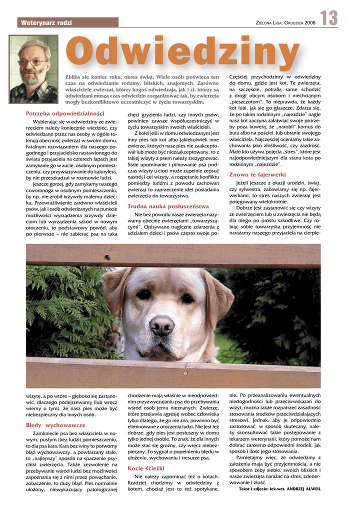 Weterynarz radzi ZIELONA LIGA, GRUDZIEŃ 2008 Odwiedziny Zbliża się koniec roku, okres świąt. Wiele osób poświęca ten czas na odwiedzanie rodziny, bliskich, znajomych. Zarówno właściciele zwierząt, którzy kogoś odwiedzają, jak i ci, którzy są odwiedzani muszą czas odwiedzin zorganizować tak, by zwierzęta mogły bezkonfliktowo uczestniczyć w życiu towarzyskim. Potrzeba odpowiedzialności Wybierając się w odwiedziny ze zwierzęciem należy koniecznie wiedzieć, czy odwiedzane przez nas osoby w ogóle tolerują obecność zwierząt w swoim domu. Fatalnym rozwiązaniem dla naszego pogodnego i przyjacielsko nastawionego do świata przyjaciela na czterech łapach jest zamykanie go w aucie, osobnym pomieszczeniu, czy przywiązywanie do kaloryfera, by nie przeszkadzał w rozmowie ludzi. Jeszcze gorzej, gdy zamykamy naszego czworonoga w osobnym pomieszczeniu, by np. nie zrobił krzywdy małemu dziecku. Przewrażliwienie zarówno właścicieli psów, jak i osób odwiedzanych na punkcie możliwości wyrządzenia krzywdy dzieciom lub wyrządzenia szkód w nowym otoczeniu, to podstawowy powód, aby po pierwsze – nie zabierać psa na taką wizytę, a po wtóre – głęboko się zastanowić, dlaczego podejrzewamy (lub wręcz wiemy o tym), że nasz pies może być niebezpieczny dla innych osób. Błędy wychowawcze Zamknięcie psa bez właściciela w nowym, pustym (bez ludzi) pomieszczeniu, to dla psa kara. Kara bez winy to potworny błąd wychowawczy, a powtarzany stale, to „najlepszy” sposób na spaczenie psychiki zwierzęcia. Także zezwolenie na przebywanie wśród ludzi bez możliwości zapoznania się z nimi przez powąchanie, zobaczenie, to duży błąd. Pies normalnie ułożony, niewykazujący patologicznej chęci gryzienia ludzi, czy innych psów, powinien zawsze współuczestniczyć w życiu towarzyskim swoich właścicieli. Z kolei jeśli w domu odwiedzanym jest inny pies lub kot albo jakiekolwiek inne zwierzę, których nasz pies nie zaakceptował lub może być niezaakceptowany, to z takiej wizyty z psem należy zrezygnować. Stałe upominanie i pilnowanie psa podczas wizyty u cioci może zupełnie zepsuć nastrój i cel wizyty, a rozpętanie konfliktu pomiędzy ludźmi z powodu zachowań zwierząt to zaprzeczenie idei posiadania zwierzęcia do towarzystwa. Trudna nauka posłuszeństwa Nie bez powodu nasze zwierzęta nazywamy obecnie zwierzętami „towarzyszącymi”. Opisywane tragiczne zdarzenia z udziałem dzieci i psów często swoje po- chodzenie mają właśnie w nieodpowiednim przyzwyczajaniu psa do przebywania wśród osób jemu nieznanych. Zwierzę, które przejawia agresję wobec człowieka tylko dlatego, że go nie zna, powinno być eliminowane z otoczenia ludzi. Nie jest też dobrze, gdy pies jest posłuszny w domu tylko jednej osobie. To znak, że dla innych może stać się groźny, czy wręcz niebezpieczny. To sygnał o popełnieniu błędu w ułożeniu, wychowaniu i tresurze psa. Kocie ścieżki Nie należy zapominać też o kotach. Rzadziej chodzimy w odwiedziny z kotem, chociaż jest to też spotykane. 13 Częściej przychodzimy w odwiedziny do domu, gdzie jest kot. Te zwierzęta, na szczęście, potrafią same schodzić z drogi obcym osobom i niechcianym „pieszczotom”. To nieprawda, że każdy kot lubi, jak się go głaszcze. Zdarza się, że po takim rodzinnym „najeździe” nagle nasz kot zaczyna załatwiać swoje potrzeby poza kuwetą, że „narobił” komuś do buta albo na pościel, lub ubranie swojego właściciela. Najczęściej oceniamy takie zachowania jako złośliwość, czy zazdrość. Mało kto używa pojęcia „stres”, które jest najodpowiedniejszym dla stanu kota po rodzinnym „najeździe”. Znowu te fajerwerki Jeżeli jeszcze z okazji urodzin, świąt, czy sylwestra, zabawiamy się np. fajerwerkami, to stres naszych zwierząt jest potęgowany wielokrotnie. Dobrze jest zastanowić się czy wizyty ze zwierzęciem lub u zwierzęcia nie będą dla niego po prostu szkodliwe. Czy robiąc sobie towarzyską przyjemność nie narażamy naszego przyjaciela na cierpie- nie. Po przeanalizowaniu ewentualnych niedogodności lub przeciwwskazań do wizyt, można także rozpatrzeć zasadność stosowania środków przeciwdziałających stresowi. Jednak, aby je odpowiednio zastosować, w sposób skuteczny, należy skonsultować takie postępowanie z lekarzem weterynarii, który pomoże nam dobrać zarówno odpowiedni środek, jak sposób i ilość jego stosowania. Pamiętajmy więc, że odwiedziny z założenia mają być przyjemnością, a nie sposobem żeby siebie, swoich bliskich i nasze zwierzęta narażać na stres, zdenerwowanie i złość. Tekst i zdjęcie: lek.wet. ANDRZEJ ALWEIL