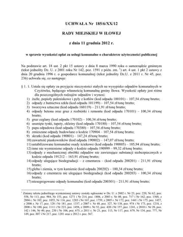 UCHWAŁA Nr 185/6/XX/12 RADY MIEJSKIEJ W IŁOWEJ z dnia 11 grudnia 2012 r. w sprawie wysokości opłat za usługi komunalne o charakterze użyteczności publicznej Na podstawie art. 18 ust. 2 pkt 15 ustawy z dnia 8 marca 1990 roku o samorządzie gminnym (tekst jednolity Dz. U. z 2001 roku Nr 142, poz. 1591 z późn. zm. 1) art. 4 ust. 1 pkt 2 ustawy z dnia 20 grudnia 1996 r. o gospodarce komunalnej (tekst jednolity Dz.U. z 2011 r. Nr 45, poz. 236) uchwala się, co następuje: § 1. 1. Ustala się opłaty za przyjęcie nieczystości stałych na wysypisko odpadów komunalnych w Czyżówku, będącego własnością komunalną gminy Iłowa. Wysokość opłaty jest różna dla poszczególnych rodzajów odpadów i wynosi: 1) żużle, popioły paleniskowe i pyły z kotłów (kod odpadu 100101) – 107,54 zł/tonę brutto; 2) odpady z hutnictwa szkła (kod odpadu 101199) – 107,54 zł/tonę brutto; 3) tworzywa sztuczne (kod odpadu 160119) – 211,91 zł/tonę brutto; 4) odpady betonu oraz gruz z rozbiórki i remontu (kod odpadu 170101) – 100,34 zł/tonę brutto; 5) gruz ceglany (kod odpadu 170102) – 100,34 zł/tonę brutto; 6) usunięte tynki, tapety, okleiny (kod odpadu 170180) – 107,54 zł/tonę brutto; 7) papa odpadowa (kod odpadu 170380) – 107,54 zł/tonę brutto; 8) zmieszane odpady budowlane o kodzie 170904 – 107,54 zł/tonę brutto; 9) skratki (kod odpadu 190801) – 147,24 zł/tonę brutto; 10) zawartość piaskowników (kod odpadu 190802) – 147,07 zł/tonę brutto; 11) ustabilizowane komunalne osady ściekowe (kod odpadu 190805) – 105,94 zł/tonę brutto; 12) inne nie wymienione odpady o kodzie odpadu 190999 – 99,32 zł/tonę brutto; 13) odpady z mechanicznej obróbki odpadów nie zawierające substancji niebezpiecznych o kodzie odpadu 191212 – 163,91 zł/tonę brutto; 14) odpady ulegające biodegradacji – z cmentarza – (kod odpadu 200201) – 211,91 zł/tonę brutto; 15) gleba i ziemia, w tym kamienie (kod odpadu 200202) – 100,34 zł/tonę brutto; 16) odpady z cmentarza nie ulegające biodegradacji (kod odpadu 200203) – 100,34 zł/tonę brutto; 17) niesegregowane odpady komunalne (kod odpadu 200301) – 211,91 zł/tonę brutto; 1 Zmiany tekstu jednolitego wymienionej ustawy zostały ogłoszone w Dz. U. z 2002 r. Nr 23, poz. 220, Nr 62, poz. 558, Nr 113, poz. 984, Nr 153, poz. 1271 i Nr 214, poz. 1806, z 2003 r. Nr 80, poz. 717 i Nr 162, poz. 1568, z 2004 r. Nr 102, poz. 1055, Nr 116, poz. 1203 i Nr 167, poz. 1759, z 2005 r. Nr 172, poz. 1441 i Nr 175, poz. 1457, z 2006 r. Nr 17, poz. 128 i Nr 181, poz. 1337, z 2007 r. Nr 48, poz. 327, Nr 138, poz. 974 i Nr 173, poz. 1218, z 2008 r. Nr 180, poz. 1111 i Nr 223, poz. 1458, z 2009 r. Nr 52, poz. 420 i Nr 157, poz. 1241, z 2010 r. Nr 28, poz. 142 i 146, Nr 40, poz. 230 i Nr 106, poz. 675, z 2011 r. Nr 21, poz. 113, Nr 117, poz. 679, Nr 134, poz. 777, Nr 149, poz. 887 i Nr 217, poz. 1281 oraz z 2012 r. poz. 567. 18) odpady z targowisk (kod odpadu 200302) – 211,91 zł/tonę brutto; 19) odpady z czyszczenia ulic (kod odpadu 200303) – 183,09 zł/tonę brutto; 20) odpady ze studzienek kanalizacyjnych (kod odpadu 200306) – 107,54 zł/tonę brutto; 21) odpady wielkogabarytowe (kod odpadu 200307) – 211,91 zł/tonę brutto; 22) inne odpady komunalne o kodzie odpadu 200399 – 211,91 zł/tonę brutto. 2. Ustala się opłatę za przyjęcie ścieków bytowych i ścieków komunalnych dowożonych do punktu zlewnego oczyszczalni ścieków w Iłowej, będącej własnością komunalną gminy Iłowa, w wysokości 2,88 zł brutto za jeden metr sześcienny. § 2. 1. Opłaty, o których mowa w § 1, pobiera odpowiednio administrator wysypiska odpadów komunalnych w Czyżówku lub administrator oczyszczalni ścieków w Iłowej. 2. Administrator wysypiska i oczyszczalni zobowiązany jest do prowadzenia ewidencji przyjętych odpadów i pobieranych opłat. § 3. Traci moc uchwała Rady Miejskiej w Iłowej Nr 95/6/X/11 z dnia 29 listopada 2011 r. w sprawie wysokości opłat za usługi komunalne o charakterze użyteczności publicznej § 4 Wykonanie uchwały powierza się Burmistrzowi Iłowej. § 5. Uchwała wchodzi w życie z dniem podjęcia z mocą obowiązującą od dnia 1 stycznia 2013 r. Przewodniczący Rady Józef Brzezicki
