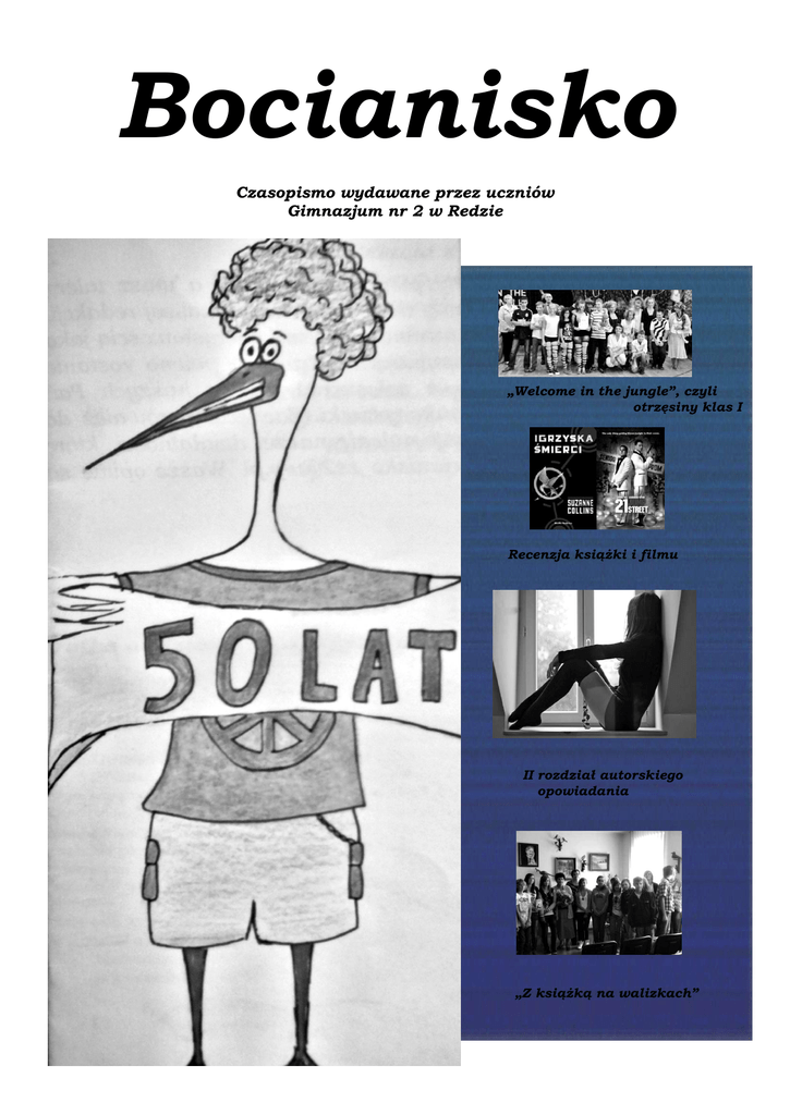 Bocianisko Czasopismo wydawane przez uczniów Gimnazjum nr 2 w Redzie „Welcome in the jungle”, czyli otrzęsiny klas I Recenzja książki i filmu II rozdział autorskiego opowiadania „Z książką na walizkach” Wraz z następnym numerem naszej gazetki „Bocianisko” startuje oficjalna witryna internetowa. Znajdziecie w niej jeszcze więcej ciekawych artykułów, najświeższych informacji z życia szkoły, relacji z uroczystości wzbogaconych galeriami zdjęć. Będziecie również mieli okazję ocenić działalność strony i wypowiedzieć się pod artykułami, poznać skład naszej redakcji i pobrać archiwalne numery. Mamy nadzieję, że dorówna popularnością naszym ostatnim numerom i stanie się dla was niezastąpionym źródłem pomocy, rozrywki i wiedzy. Aby nasza gazetka jak najlepiej prosperowała, a wasz talent piśmienniczy rozkwitł, zapraszamy do współpracy w naszej redakcji. W gronie kolegów wykażesz się swoim talentem i pomysłowością jako redaktor oficjalnej, szkolnej prasy, a Twój trud na pewno zostanie nagrodzony. Chętnych prosimy o zgłoszenie się do naszych Pań Polonistek lub o maila na skrzynkę gazetki. Zachęcamy również do dzielenia się pomysłami na udoskonalenie naszej działalności, które możecie przysyłać na adres: [email protected] .Wasze opinie są dla nas niezmiernie ważne! Kasia Kabata Alan Balewski Julia Błaszczyk Marcelina Wilczewska Joanna Janiak Wiktoria Jabłonowska Agnieszka Modzelewska Beata Gruba Natalia Tomczyk Kinga Ranachowska Karolina Zdrojewska Spis treści: • Co nieco o naszych noblistach • Recenzje książki i filmu • Życzenia z okazji 50 – lecia • Relacja z otrzęsin • Drugi rozdział autorskiego opowiadania • „Biała śmierć” - król strzelców • Igrzyska olimpijskie • „Z książką na walizkach” • Zrób to sam...czyli przepisy dla młodego kucharza • Konkurs z nagrodami Krótko o historii naszej szkoły Od roku 1958 do 1962 trwały prace przy budowie nowego budynku Szkoły Podstawowej nr 3 w Redzie. Uroczystego otwarcia budynku dokonano 3 września 1962 roku. 25 września 1970 roku nadano Szkole Podstawowej nr 3 w Redzie imię Stefana Żeromskiego. 27 listopada 1972 roku odbyła sie uroczystość, w czasie której wręczono szkole sztandar. Dużym osiągnięciem polepszającym warunki materialne placówki było dobudowanie nowego segmentu do budynku już istniejącego. Nowe skrzydło oddano do użytku 10 listopada 1994 roku. Dnia 1 września 1999 roku, w wyniku wprowadzonej reformy oświaty w całym kraju, rozpoczęliśmy rok szkolny jako Zespółe Szkół nr 3. Dyrektorem był mgr Jan Skrobul, a zastępcą mgr Łucja Sadowska. 1 września 2001 r. Zespół Szkół nr 3 w Redzie przestał istnieć. W jego miejsce powstały dwie odrębne placówki Szkoła Podstawowa nr 3, w której funkcję dyrektora pełnił mgr Jan Skrobul oraz Gimnazjum nr 2, w którym funkcję dyrektora objęła mgr Teresa Kania. 1 września 2005 r. ponownie, decyzją władz miasta Redy, połączono dwie szkoły i powstał Zespół Szkół nr 2. Funkcję dyrektora sprawuje mgr Jan Skrobul. Zespół posiada dwie Panie wicedyrektor: mgr Łucję Sadowską (odpowiedzialną za Szkołę Podstawową nr 3) i mgr Barbara Zawal-Brzezińska (odpowiedzialną za Gimnazjum nr 2).2010 roku zaczęły się prace przy budowie nowej hali Drodzy Uczniowie! 3 września rozpoczął się nowy rok szkolny 2012/2013. Będzie to rok szczególny, m.in. z uwagi na obchody 50-lecia szkoły...ale czy tylko z tego powodu? Jak wiecie, nasze gimnazjum od zawsze nosiło pełną nazwę - Gimnazjum nr 2 w Redzie. Lecz po 50 latach działalności wreszcie czas na zmianę! Nasza szkoła dostanie swoich patronów. Będzie nosić nazwę Gimnazjum nr 2 w Redzie im. Polskich Noblistów. Aby przybliżyć Wam historię, stworzyłam krótkie życiorysy każdego z nich. Miłej lektury! Władysław Stanisław Reymont powieściopisarz, nowelista, reportażysta. Urodził się 7 maja 1867 roku we wsi Kobiele Wielkie w pobliżu Radomska, zmarł 5 grudnia 1925 roku w Warszawie. W roku 1917 otrzymał za „Chłopów” nagrodę Polskiej Akademii Umiejętności. W 1924 roku został laureatem Nagrody Nobla za tę samą powieść. Henryk Sienkiewicz polski powieściopisarz, nowelista, laureat Nagrody Nobla w dziedzinie literatury. Urodził się 5 maja 1846 roku. Rozgłos przyniosła Sienkiewiczowi Nagroda Nobla, którą otrzymał w 1905 roku z a powieść „Quo vadis”. Zmarł w Vevey 15 listopada 1916 roku, gdzie go pochowano. Czesław Miłosz (1911-2004) - jeden z największych twórców polskiej literatury XX wieku, członek Polskiej Akademii Umiejętności, Stowarzyszenia Pisarzy Polskich , kawaler Orderu Orła Białego, pochowany w Krypcie Zasłużonych na Skałce. W roku 1960 zamieszkał w Stanach Zjednoczonych i rozpoczął pracę jako wykładowca literatury słowiańskiej na Uniwersytecie Kalifornijskim w Berkeley oraz na Harvardzie. W 1978 roku Miłosz otrzymał Międzynarodową Nagrodę Literacką Neustadt zwaną „Małym Noblem”, a w 1980 roku został laureatem Nagrody Nobla. Maria Salomea Skłodowska-Curie – na świat przyszła 7 lipca 1867 roku w Warszawie. Chemik, fizyk polskiego pochodzenia, prekursorka radiochemii, dwukrotnie odznaczona Nagroda Nobla. Została pierwszą kobietą w historii z tytułem doktora fizyki, rok ten przyniósł jej również Nagrodę Nobla. W roku 1911 otrzymała drugą Nagrodę Nobla, co zaowocowało pieniędzmi z rządu francuskiego na budowę prywatnego Instytutu Radowego. Zmarła 4 lipca 1934 roku w Alpejskiej klinice w Passy. Wisława Szymborska – urodzona 1 lipca 1923 na Prowencie, które obecnie należy do Kórnika, zmarła 1 lutego 2012 w Krakowie. Studiowała na uniwersytecie Jagiellońskim polonistykę i socjologi. Studiów jednak nie ukończyła. Należy do najczęściej tłumaczonych autorów polskich. Jej wiersze zostały przetłumaczone na 42 języki. W 1996 roku Wisława Szymborska otrzymała Nagr