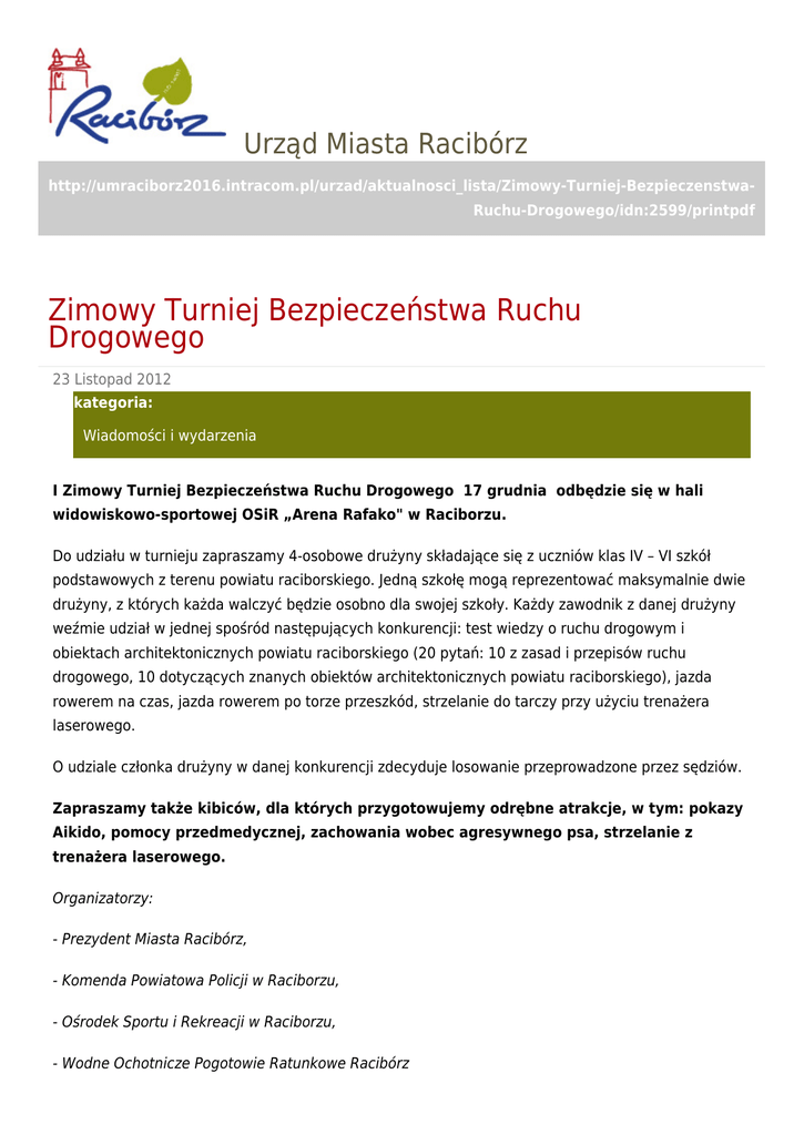 Urząd Miasta Racibórz http://umraciborz2016.intracom.pl/urzad/aktualnosci_lista/Zimowy-Turniej-BezpieczenstwaRuchu-Drogowego/idn:2599/printpdf Zimowy Turniej Bezpieczeństwa Ruchu Drogowego 23 Listopad 2012 kategoria: Wiadomości i wydarzenia I Zimowy Turniej Bezpieczeństwa Ruchu Drogowego 17 grudnia odbędzie się w hali widowiskowo-sportowej OSiR „Arena Rafako" w Raciborzu. Do udziału w turnieju zapraszamy 4-osobowe drużyny składające się z uczniów klas IV – VI szkół podstawowych z terenu powiatu raciborskiego. Jedną szkołę mogą reprezentować maksymalnie dwie drużyny, z których każda walczyć będzie osobno dla swojej szkoły. Każdy zawodnik z danej drużyny weźmie udział w jednej spośród następujących konkurencji: test wiedzy o ruchu drogowym i obiektach architektonicznych powiatu raciborskiego (20 pytań: 10 z zasad i przepisów ruchu drogowego, 10 dotyczących znanych obiektów architektonicznych powiatu raciborskiego), jazda rowerem na czas, jazda rowerem po torze przeszkód, strzelanie do tarczy przy użyciu trenażera laserowego. O udziale członka drużyny w danej konkurencji zdecyduje losowanie przeprowadzone przez sędziów. Zapraszamy także kibiców, dla których przygotowujemy odrębne atrakcje, w tym: pokazy Aikido, pomocy przedmedycznej, zachowania wobec agresywnego psa, strzelanie z trenażera laserowego. Organizatorzy: - Prezydent Miasta Racibórz, - Komenda Powiatowa Policji w Raciborzu, - Ośrodek Sportu i Rekreacji w Raciborzu, - Wodne Ochotnicze Pogotowie Ratunkowe Racibórz