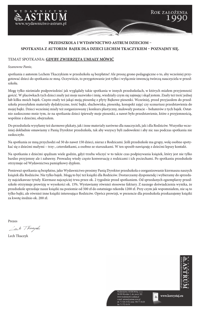 PRZEDSZKOLA I WYDAWNICTWO ASTRUM DZIECIOM – SPOTKANIA Z AUTOREM BAJEK DLA DZIECI LECHEM TKACZYKIEM – POZNAJMY SIĘ. TEMAT SPOTKANIA: GDYBY ZWIERZĘTA UMIAŁY MÓWIĆ Szanowne Panie, spotkania z autorem Lechem Tkaczykiem w przedszkolu są bezpłatne! Ale proszę grono pedagogiczne o to, aby wcześniej przygotować dzieci do spotkania ze mną. Oczywiście, to przygotowanie jest tylko i wyłącznie inwencją twórczą nauczyciela w przedszkolu. Mogę tylko nieśmiało podpowiedzieć jak wyglądały takie spotkania w innych przedszkolach, w których miałem przyjemność gościć. W placówkach tych dzieci znały już moje nazwisko i imię, wiedziały czym się zajmuję i skąd jestem. Znały też treść jednej lub kilku moich bajek. Często znały też jakąś moją piosenkę z płyty Bajkowe piosenki. Wcześniej, przed przyjazdem do przedszkola przesyłałem materiały dydaktyczne, treść bajki, słuchowiska, piosenkę, konspekt zajęć czy scenariusz przedstawienia do mojej bajki. Dzieci wcześniej miały też zorganizowany j konkurs plastyczny, malowały postacie – bohaterów z tych bajek. Ostatnio zaskoczono mnie tym, że na spotkaniu dzieci śpiewały moje piosenki, a nawet było przedstawienie, które z przyjemnością, wspólnie z dziećmi, obejrzałem. Do przedszkola wysyłamy też darmowe plakaty, jak i inne materiały zarówno dla nauczycieli, jak i dla Rodziców. Wszystko wcześniej dokładnie omawiamy z Panią Dyrektor przedszkola, tak aby wszyscy byli zadowoleni i aby nic nas podczas spotkania nie zaskoczyło. Na spotkania ze mną przychodzi od 50 do nawet 150 dzieci, nieraz z Rodzicami. Jeśli przedszkole ma grupy, wolę osobno spotykać się z dziećmi małymi – trzy-, czterolatkami, a osobno ze starszakami. W ten sposób nawiązuję z dziećmi lepszy kontakt. Na spotkaniu z dziećmi spędzam wiele godzin, gdyż trzeba wliczyć w to także czas podpisywania książek, który jest nie tylko bardzo przyjemny ale i zabawny. Prowadzę wtedy często konwersację z rodzicami i ich pociechami. Po spotkaniu przedszkole otrzymuje od Wydawnictwa pamiątkowy dyplom. Ponieważ spotkania są bezpłatne, jako Wydawnictwo prosimy Panią Dyrektor przedszkola o zorganizowanie kiermaszu naszych książek dla Rodziców. Nie tylko bajek. Mogą to być też książki dla Rodziców. Dostarczamy dysponendę i wybieramy do sprzedaży najciekawsze tytuły. Kiermasz najczęściej trwa przez ok. 2 tygodnie przed spotkaniem. Od sprzedanych egzemplarzy przedszkole otrzymuje prowizję w wysokości ok. 15%. Wystawiamy również stosowne faktury. Z naszego doświadczenia wynika, że przedszkole sprzedaje nasze książki na poziomie od 500 zł do ostatniego rekordu 1200 zł. Przy czym jak wspomniałem, nie są to tylko bajki, ale również inne książki interesujące Rodziców. Oprócz prowizji, w prezencie dla przedszkola przekazujemy książki za kwotę średnio ok. 200 zł. Prezes Lech Tkaczyk
