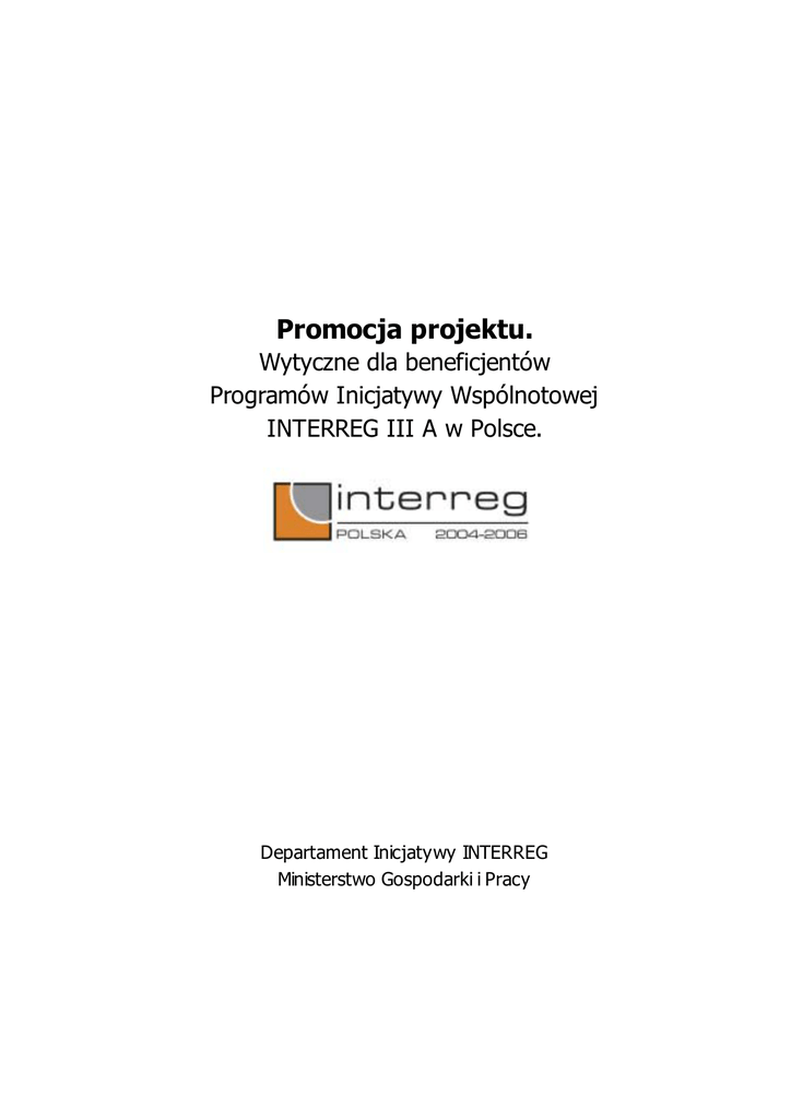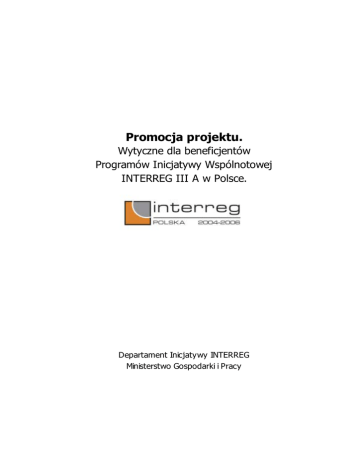 Promocja projektu. Wytyczne dla beneficjentów Programów Inicjatywy Wspólnotowej INTERREG III A w Polsce. Departament Inicjatywy INTERREG Ministerstwo Gospodarki i Pracy Promocja projektu. Wytyczne dla beneficjentów Programów Inicjatywy Wspólnotowej INTERREG III A w Polsce. Wykaz używanych skrótów ................................................................ 3 Wstęp............................................................................................ 4 Postawy prawne działań informacyjnych i promocyjnych.......................... 6 Narzędzia informacji i promocji ........................................................... 7 Projekty infrastrukturalne ............................................................... 7 Projekty miękkie ........................................................................... 9 Oznaczanie projektu ........................................................................11 Logo Unii Europejskiej .....................................................................13 Liczba gwiazd..............................................................................13 Geometria godła ..........................................................................14 Rozmieszczenie gwiazd i pozycja godła.............................................14 Kolory flagi .................................................................................15 Druk czterokolorowy..................................................................16 Internet ..................................................................................16 Reprodukcja jednobarwna .............................................................16 Reprodukcja na kolorowym tle........................................................17 Reprodukcja na niebieskim tle ........................................................17 Właściwe oznaczenia projektów w poszczególnych programach................19 Program Polska (Województwo Zachodniopomorskie) – Meklemburgia Pomorze Przednie / Brandenburgia..................................................19 Program Polska (Województwo Lubuskie) – Kraj Związkowy Brandenburgia22 Program Rzeczpospolita Polska (Województwo Dolnośląskie) – Wolny Kraj Związkowy Saksonia........................................................................24 Program Czechy – Polska..................................................................27 Program Polska – Republika Słowacka.................................................29 Program Sąsiedztwa Polska – Białoruś – Ukraina INTERREG III A /TACIS CBC ...................................................................................................32 Program Sąsiedztwa Litwa – Polska – Obwód Kaliningradzki Federacji Rosyjskiej INTERREG III A/TACIS CBC ................................................34 Koszty promocji projektu. .................................................................37 Podsumowanie ...............................................................................38 Bibliografia ....................................................................................39 2 Promocja projektu. Wytyczne dla beneficjentów Programów Inicjatywy Wspólnotowej INTERREG III A w Polsce. Wykaz używanych skrótów UE – Unia Europejska IW – Inicjatywa Wspólnotowa EFRR – Europejski Fundusz Rozwoju Regionalnego 3 Promocja projektu. Wytyczne dla beneficjentów Programów Inicjatywy Wspólnotowej INTERREG III A w Polsce. Wstęp Programy Inicjatywy Wspólnotowej INTERREG III, finansowanej ze środków Europejskiego Funduszu Rozwoju Regionalnego (EFRR), odróżniają się od innych realizowanych w ramach Funduszy Strukturalnych swoim międzynarodowym charakterem. Jako cele IW INTERREG przyjmuje się wzmocnienie spójności gospodarczej i społecznej Wspólnoty poprzez promowanie współpracy przygranicznej, transnarodowej i międzyregionalnej oraz wspieranie zrównoważonego rozwoju na obszarze Unii. Z tego względu w ramach tejże inicjatywy zostały wyodrębnione trzy komponenty: A, B, C. Komponent A – to programy współpracy przygranicznej pomiędzy sąsiadującymi regionami, włączając w to granice zewnętrzne (programy sąsiedztwa) oraz niektóre granice morskie. Komponent B – to programy współpracy ponadnarodowej w zakresie planowania przestrzennego i rozwoju regionalnego, przyczynianie się do harmonijnej integracji terytorialnej na obszarze wspólnotowym. Komponent C – to programy współpracy międzyregionalnej polegające na wymianie doświadczeń w zakresie rozwoju regionalnego oraz polityk i technik spójności angażujące we współpracę zarówno organy państwowe, regionalne jak i lokalne . Beneficjenci z Polski mają możliwość brania udziału w programach realizowanych w ramach każdego z trzech komponentów. W sumie na terenie Polski jest realizowanych trzynaście programów IW INTERREG: - - siedem programów współpracy przygranicznej INTERREG III A : o Program Polska (Województwo Zachodniopomorskie) – Meklemburgia Pomorze Przednie / Brandenburgia o Program Polska (Województwo Lubuskie) – Kraj Związkowy Brandenburgia o Program Rzeczpospolita Polska (Województwo Dolnośląskie) – Wolny Kraj Związkowy Saksonia o Program Czechy – Polska o Program Polska – Republika Słowacka o Program Sąsiedztwa Polska – Białoruś – Ukraina INTERREG III A /TACIS CBC o Program Sąsiedztwa Litwa – Polska – Obwód Kaliningradzki Federacji Rosyjskiej INTERREG III A/TACIS CBC dwa programy współpracy ponadnarodowej INTERREG III B: o BSR (ang. Balitic Sea Region) Program Regionu Morza Bałtyckiego 4 Promocja projektu. Wytyczne dla beneficjentów Programów Inicjatywy Wspólnotowej INTERREG III A w Polsce. o - - CADSES (ang. Central Adriatic Danubian South-Eastern European Space) Program Obszaru Europy Środkowej, Adriatyckiej, Naddunajskiej i Południowo-Wschodniej dwa programy współpracy międzyregionalnej INTERREG III C: o Program Strefy Północne