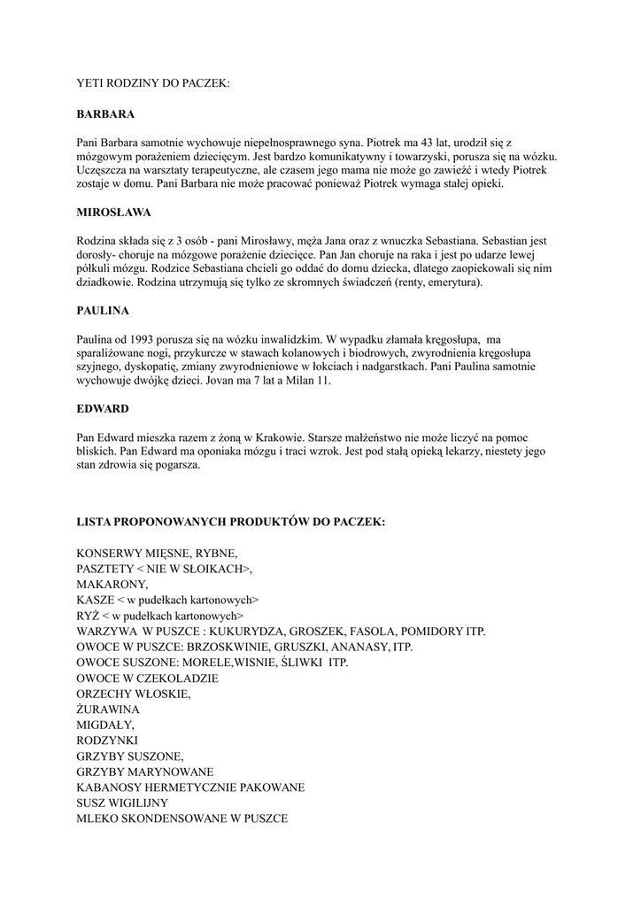 YETI RODZINY DO PACZEK: BARBARA Pani Barbara samotnie wychowuje niepełnosprawnego syna. Piotrek ma 43 lat, urodził się z mózgowym porażeniem dziecięcym. Jest bardzo komunikatywny i towarzyski, porusza się na wózku. Uczęszcza na warsztaty terapeutyczne, ale czasem jego mama nie może go zawieźć i wtedy Piotrek zostaje w domu. Pani Barbara nie może pracować ponieważ Piotrek wymaga stałej opieki. MIROSŁAWA Rodzina składa się z 3 osób - pani Mirosławy, męża Jana oraz z wnuczka Sebastiana. Sebastian jest dorosły- choruje na mózgowe porażenie dziecięce. Pan Jan choruje na raka i jest po udarze lewej półkuli mózgu. Rodzice Sebastiana chcieli go oddać do domu dziecka, dlatego zaopiekowali się nim dziadkowie. Rodzina utrzymują się tylko ze skromnych świadczeń (renty, emerytura). PAULINA Paulina od 1993 porusza się na wózku inwalidzkim. W wypadku złamała kręgosłupa, ma sparaliżowane nogi, przykurcze w stawach kolanowych i biodrowych, zwyrodnienia kręgosłupa szyjnego, dyskopatię, zmiany zwyrodnieniowe w łokciach i nadgarstkach. Pani Paulina samotnie wychowuje dwójkę dzieci. Jovan ma 7 lat a Milan 11. EDWARD Pan Edward mieszka razem z żoną w Krakowie. Starsze małżeństwo nie może liczyć na pomoc bliskich. Pan Edward ma oponiaka mózgu i traci wzrok. Jest pod stałą opieką lekarzy, niestety jego stan zdrowia się pogarsza. LISTA PROPONOWANYCH PRODUKTÓW DO PACZEK: KONSERWY MIĘSNE, RYBNE, PASZTETY < NIE W SŁOIKACH>, MAKARONY, KASZE < w pudełkach kartonowych> RYŻ < w pudełkach kartonowych> WARZYWA W PUSZCE : KUKURYDZA, GROSZEK, FASOLA, POMIDORY ITP. OWOCE W PUSZCE: BRZOSKWINIE, GRUSZKI, ANANASY, ITP. OWOCE SUSZONE: MORELE,WISNIE, ŚLIWKI ITP. OWOCE W CZEKOLADZIE ORZECHY WŁOSKIE, ŻURAWINA MIGDAŁY, RODZYNKI GRZYBY SUSZONE, GRZYBY MARYNOWANE KABANOSY HERMETYCZNIE PAKOWANE SUSZ WIGILIJNY MLEKO SKONDENSOWANE W PUSZCE MASŁO ORZECHOWE, CZEKOLADOWE W PALSTIKOWYM OPAKOWANIU KAKAO KAKAO DLA DZIECI ROSOŁKI DROBIOWE, WOŁOWE, WARZYWNE KAWA ROZPUSZCZALNA KAWA INKA, KAWA MIELONA HERBATA SŁODYCZE, MASA MAKOWA, MASA KRÓWKOWA CIASTA, CIASTA W PROSZKU, KREMY PRZYPRAWY SYPKIE TYPU: CYNAMON, GAŁKA MUSZKATOŁOWA, PIEPRZ, SOL, CZOSNEK, PAPRYKA, BAZYLIA, PRZYPRAWA DO KURCZAKA ITP. ZUPY W PROSZKU < ŻUREK, BARSZCZ CZERWONY, ZUPA GRZYBOWA ITP.> KETCHUP, MUSZTARDA, SOSY W PLASTIKOWANYM OPAKOWANIU PŁATKI ŚNIADANIOWE, MUSLI, MIÓD PROSZKI DO PRANIA PŁYNY DO PŁUKANIA PRANIA