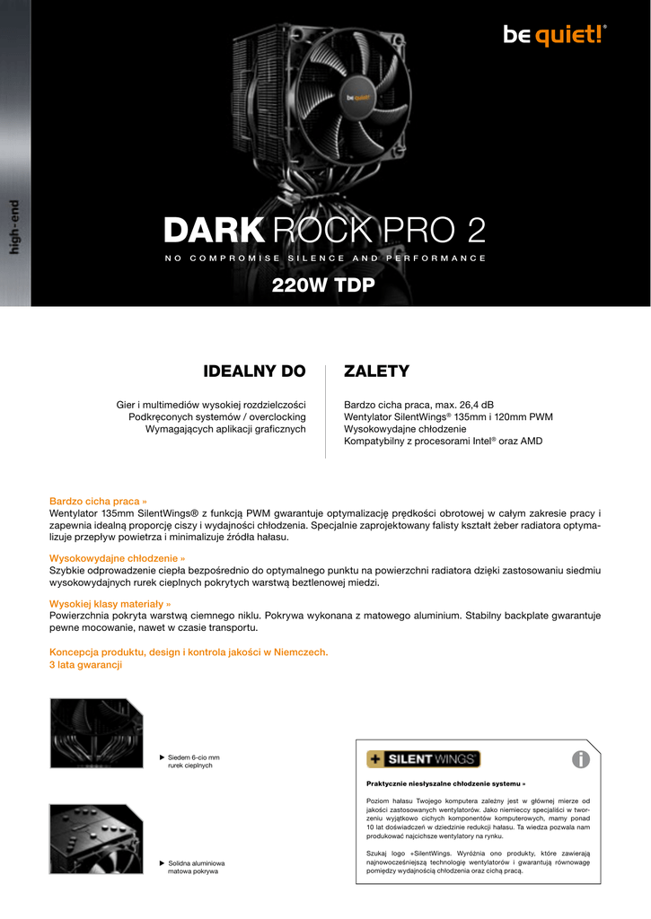 DARK ROCK PRO 2 N O C O M P R O M I S E S I L E N C E A N D P E R F O R M A N C E 220W TDP IDEALNY DO Gier i multimediów wysokiej rozdzielczości Podkręconych systemów / overclocking Wymagających aplikacji graficznych ZALETY Bardzo cicha praca, max. 26,4 dB Wentylator SilentWings® 135mm i 120mm PWM Wysokowydajne chłodzenie Kompatybilny z procesorami Intel® oraz AMD Bardzo cicha praca » Wentylator 135mm SilentWings® z funkcją PWM gwarantuje optymalizację prędkości obrotowej w całym zakresie pracy i zapewnia idealną proporcję ciszy i wydajności chłodzenia. Specjalnie zaprojektowany falisty kształt żeber radiatora optymalizuje przepływ powietrza i minimalizuje źródła hałasu. Wysokowydajne chłodzenie » Szybkie odprowadzenie ciepła bezpośrednio do optymalnego punktu na powierzchni radiatora dzięki zastosowaniu siedmiu wysokowydajnych rurek cieplnych pokrytych warstwą beztlenowej miedzi. Wysokiej klasy materiały » Powierzchnia pokryta warstwą ciemnego niklu. Pokrywa wykonana z matowego aluminium. Stabilny backplate gwarantuje pewne mocowanie, nawet w czasie transportu. Koncepcja produktu, design i kontrola jakości w Niemczech. 3 lata gwarancji Siedem 6-cio mm rurek cieplnych Praktycznie niesłyszalne chłodzenie systemu » Poziom hałasu Twojego komputera zależny jest w głównej mierze od jakości zastosowanych wentylatorów. Jako niemieccy specjaliści w tworzeniu wyjątkowo cichych komponentów komputerowych, mamy ponad 10 lat doświadczeń w dziedzinie redukcji hałasu. Ta wiedza pozwala nam produkować najcichsze wentylatory na rynku. Solidna aluminiowa matowa pokrywa Szukaj logo +SilentWings. Wyróżnia ono produkty, które zawierają najnowocześniejszą technologię wentylatorów i gwarantują równowagę pomiędzy wydajnością chłodzenia oraz cichą pracą. DARK ROCK PRO 2 N O C O M P R O M I S E S I L E N C E A N D P E R F O R M A N C E Konstrukcja Dane techniczne Typ coolera Dark Rock Pro 2 Kod produktu BK017 Wymiary z wentylatorem (mm) 138 x 166 x 147 Waga z wentylatorem (g) 1260 Materiał powierzchni chłodzącej / wykończenie Aluminium / niklowanie Kompatybliność / Socket Intel: LGA 775 / 1155 / 1156 / 1366 / 2011 AMD: 754 / 939 / 940 / AM2 (+) / AM3 (+) / FM1 Wydajność znamionowa (W) 220 Ilość ciepłowodów 7 (6mm) Głośność (dB(A)) @ 50 /75 /100% 13.5 / 19.8 / 26.4 Delta T (°C) @ 100W (ze sztucznym źródłem ciepła) 9 Dane techniczne wentylatora Typ wentylatora 2x SilentWings PWM Dane logistyczne Wymiary wentylatora (mm) 135 x 135 x 25 / 120 x 120 x 25 Model BQ DR2-76-135 rpm @ 100% PWM 1500 / 1700 Kod produktu BK017 Głośność (dB(A)) @ 100% PWM 21.5 / 24.3 Przepływ powietrza FAD (m³/h); (cfm) 113.8; 67.8 / 93.3; 57.2 Wymiary opakowania (D x S x W mm) 260 x 225 x 165 Ciśnienie powietrza (mm/H2O) 1.82 / 2.1 Waga z opakowaniem (kg) 1.58 Pobór prądu (A) 0.25 / 0.2 Szt. w op. zbiorczym 8 Podłączenie 4-pin PWM Waga op. zbiorczego (kg) 16 Żywotność 25°C (h) 300,000 Kod EAN 4260052182857 Akcesoria w zestawie 1g wysokiej jakości pasty termoprzewodzącej, Zestaw montażowy backplate, Intel® and AMD, i nstrukcja montażu (DE, EN, FR, ES, PL) Infolinia: 22 664 80 22 (pon-pt 9:00-17:00) Wersja 04/2012 Nie ponosimy odpowiedzialności za poprawność powyższych danych. Zdjęcie ma charakter poglądowy i może się różnić od produktu. bequiet.com/pl
