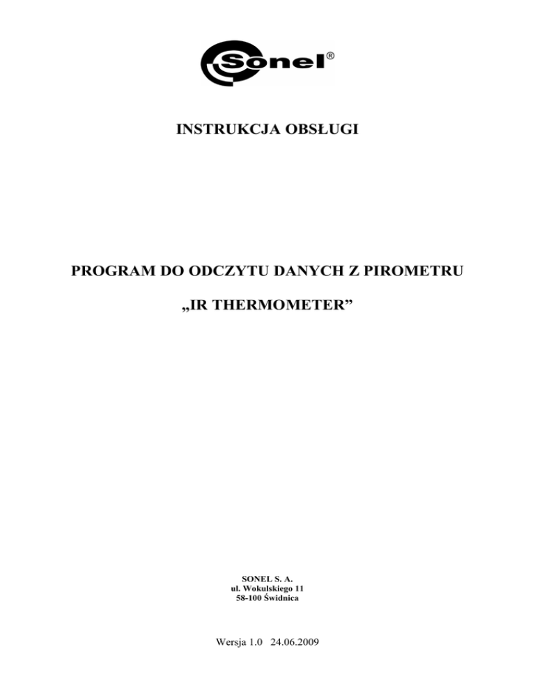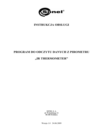 INSTRUKCJA OBSŁUGI PROGRAM DO ODCZYTU DANYCH Z PIROMETRU „IR THERMOMETER” SONEL S. A. ul. Wokulskiego 11 58-100 Świdnica Wersja 1.0 24.06.2009 1. O programie. Program „IR Thermometer” umoŜliwia odczyt i rejestrację danych przesyłanych z pirometru w czasie rzeczywistym. 2. Wymagania systemowe i sprzętowe. Program wymaga systemu Windows 2000, Windows XP lub Windows Vista. Minimalne wymagania sprzętowe to komputer PC lub NoteBook z Pentium 90MHz lub wyŜszym, 32MB RAM oraz 7MB wolnej przestrzeni na dysku. Rekomendowana rozdzielczość ekranu to 1024x768 pikseli. Program obsługuje porty COM od 1 do 16. 3. Instalacja programu i sterowników. UWAGA: Nie naleŜy podłączać miernika przed zainstalowaniem sterowników. Po zainstalowaniu programu instalator automatycznie przejdzie do instalacji sterownika. Po włoŜeniu płyty do napędu naleŜy wybrać instalację programu „IR Thermometer”, a następnie postępować według wskazań instalatora. Po zainstalowaniu programu instalator przejdzie do instalacji sterowników. NaleŜy postępować według wskazań. W momencie pojawienia się poniŜszego okna naleŜy zaznaczyć: „Launch the CP210x VCP Driver Installer”. Pole powinno być zaznaczone ! Rysunek 1. Okno instalacji sterowników z opcją „Launch the CP210x …” do zaznaczenia. Po zaznaczeniu i przyciśnięciu „Finish” naleŜy postępować dalej według wskazań instalatora. 4. Uruchomienie. 1 Po zainstalowaniu program uruchamia się klikając na ikonę „IR Thermometer” na pulpicie (lub w menu Start). Uruchomi się okno programu, brak podłączonego pirometru sygnalizowany jest napisem „OFFLINE” na belce narzędzi. Rysunek 2. Brak podłączonego miernika. NaleŜy podłączyć miernik, znajdujący się w trybie pomiaru (oraz aktywną opcją USB), a następnie nacisnąć ikonę lub z menu „Tools” wybrać opcję „Autodetect COM port”. UWAGA: miernik nie zostanie poprawnie wykryty, jeŜeli nie będzie uruchomiona w nim komunikacja USB (sposób włączenia opisany w instrukcji obsługi przyrządu) dodatkowo pirometr musi pracować w trybie pomiaru ciągłego lub z wciśniętym spustem pomiarowym. Brak komunikacji moŜe być sygnalizowany oknem: Rysunek 3. Brak komunikacji z pirometrem. Sprawdź podłączenie oraz czy miernik jest w trybie USB i SCAN (pomiaru). NaleŜy sprawdzić takŜe czy sterowniki są zainstalowane poprawnie. JeŜeli podłączenie jest poprawne oraz miernik jest w trybie USB i SCAN (pomiaru) i nadal występuje brak komunikacji to naleŜy sprawdzić czy sterowniki są zainstalowane poprawnie. W momencie poprawnego połączenia programu z pirometrem komunikat „OFFLINE” zmieni się na „ONLINE” oraz zaczną być wyświetlane dane pobierane z miernika w czasie rzeczywistym. 2 Rysunek 4. Pirometr prawidłowo podłączony, na wizualizacji bieŜące dane z miernika. 5. Interfejs uŜytkownika. Rysunek 5. Okno programu. 3 5.1. Menu główne. Rysunek 6. Menu główne. Save – zapis zarejestrowanych danych do pliku. Open – otwarcie zapisanych w pliku danych. Print – wydruk. Auto Detect the COM port – automatyczne wykrywanie portu, do którego podłączony jest miernik i uruchomienia komunikacji. Undo Zoom – resetowanie powiększenia okna wykresu. Clear the screen data – wyczyszczenie okna wykresu Clear all the data – wyczyszczenie wszystkich danych i wykresu. 5.2. Okna danych. EMS – aktualnie ustawiona emisyjność, DIF – wartość róŜnicowa temperatury, Time - częstotliwość próbkowania, DATA IR, TK – aktualna temperatura dla podczerwieni i termopary, 4 IR MAX, MIN, AVG – temperatura maksymalna, minimalna i średnia dla podczerwieni. IR, Tk Alarm – sygnalizacja przekroczenia wartości granicznych, odpowiednio wysokiej (Hi) i niskiej (Lo) dla podczerwieni (IR) i termopary (TK). Okno z odczytami pomiarów. 5.3. Wykres. Okno wykresu mierzonych temperatur. Okno ustawiania górnej (HI) i dolnej (Lo) wartości alarmowej. Linie wyznaczające obszar pomiędzy wartościami alarmowymi. 5 Pasek wyboru koloru tła (BG) oraz koloru linii (IR, TK). Menu „View” umoŜliwia włączanie i wyłączanie: IR – wykresu temperatury rejestrowanej w podczerwieni, TK – wykresu temperatury rejestrowanej przez termoparę, X Axis – linii osi X Y Axis – linii osi Y. Belka odczytu danych dla wskazanego przez uŜytkownika punktu na wykresie. 6. Pomoc. Pomoc programu dostępna jest poprzez wybranie „Contents” z menu „Help” lub kliknięcie na ikonę . Opcja „About Thermometer…” w menu „Help” wyświetla okno z wersją programu. 6
