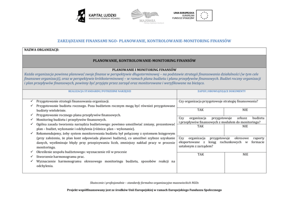 ZARZĄDZANIE FINANSAMI NGO- PLANOWANIE, KONTROLOWANIE-MONITORING FINANSÓW NAZWA ORGANIZACJI: PLANOWANIE, KONTROLOWANIE-MONITORING FINANSÓW PLANOWANIE I MONITORING FINANSÓW Każda organizacja powinna planować swoje finanse w perspektywie długoterminowej – na podstawie strategii finansowania działalności (w tym cele finansowe organizacji), oraz w perspektywie krótkoterminowej – w ramach planu budżetu i planu przepływów finansowych. Budżet roczny organizacji i plan przepływów finansowych, powinny być przyjęte przez zarząd oraz monitorowane i weryfikowane na bieżąco. REALIZACJA STANDARDU/POTRZEBNE NARZĘDZI Przygotowanie strategii finansowania organizacji. Przygotowanie budżetu rocznego. Poza budżetem rocznym mogą być również przygotowane budżety wieloletnie. Przygotowanie rocznego planu przepływów finansowych. Monitoring budżetu i przepływów finansowych. Ogólna zasada tworzenia narzędzia budżetowego: powinno umożliwiać zmiany, prezentować plan – budżet, wykonanie i odchylenia (różnica: plan – wykonanie). Rekomendujemy, żeby system monitorowania budżetu był połączony z systemem księgowym (przy założeniu, że plan kont odpowiada planowi budżetu), co umożliwi szybsze uzyskanie danych, wyeliminuje błędy przy przepisywaniu liczb, zmniejszy nakład pracy w procesie monitoringu. Określenie zespołu budżetowego: wyznaczenie ról w procesie Stworzenie harmonogramu prac. Wyznaczenie harmonogramu okresowego monitoringu budżetu, sposobów reakcji na odchylenia. ZAPISY/OBOWIĄZUJĄCE DOKUMENTY Czy organizacja przygotowuje strategię finansowania? TAK NIE Czy organizacja przygotowuje arkusz budżetu i przepływów finansowych z modułem do monitoringu? TAK NIE Czy organizacja przygotowuje okresowe raporty eksportowane z ksiąg rachunkowych w formacie ustalonym z zarządem? TAK Skutecznie i profesjonalnie – standardy formalno-organizacyjne mazowieckich NGOs Projekt współfinansowany jest ze środków Unii Europejskiej w ramach Europejskiego Funduszu Społecznego NIE KRYTERIA REALIZACJI STANDARDU PYTANIA POMOCNICZE SPRAWDZAJĄCE/ WERYFIKUJĄCE WDRAŻANIE STANDARDU W JAKIM STOPNIU ORGANIZACJA SPEŁNIA KRYTERIA DANEGO STANDARDU nie spełnia W małym stopniu spełnia W średnim stopniu spełnia W znacznym stopniu spełnia W pełni spełnia nie spełnia W małym stopniu spełnia W średnim stopniu spełnia W znacznym stopniu spełnia W pełni spełnia Minimum: Spisana minimum dwuletnia strategia finansowania organizacji, przyjęty przez zarząd budżet roczny. Czy w organizacji istnieje spisana minimum dwuletnia strategia jej finansowania i przyjęty przez zarząd budżet roczny? Kontrola realizacji budżetu powinna przeprowadzana minimum raz na roku/kwartał. Czy kontrola przeprowadzana roku/kwartał? być pół realizacji minimum budżetu raz na jest pół Rekomendacje: Spisana minimum trzyletnia strategia finansowania organizacji, Czy w organizacji istnieje spisana minimum trzyletnia strategia finansowania organizacji? Przyjęty przez zarząd plan przepływów finansowych spójny z budżetem w ujęciu kwartalnym i ujęciu miesięcznym (w zależności od potrzeb organizacji), Czy w organizacji jest przyjęty przez zarząd plan przepływów finansowych spójny z budżetem? Monitoring budżetu i przepływów finansowych raz w miesiącu, Czy w organizacji jest przeprowadzany raz w miesiącu monitoring budżetu i przepływów finansowych? Czy sporządzanie oraz monitoring budżetu i przepływów finansowych odbywa się przy współpracy zarządzających i księgowych? Sporządzanie oraz monitoring budżetu i przepływów finansowych odbywa się przy współpracy zarządzających i księgowych. Skutecznie i profesjonalnie – standardy formalno-organizacyjne mazowieckich NGOs Projekt współfinansowany jest ze środków Unii Europejskiej w ramach Europejskiego Funduszu Społecznego