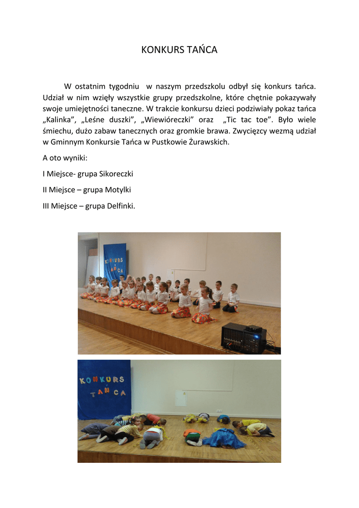 KONKURS TAŃCA W ostatnim tygodniu w naszym przedszkolu odbył się konkurs tańca. Udział w nim wzięły wszystkie grupy przedszkolne, które chętnie pokazywały swoje umiejętności taneczne. W trakcie konkursu dzieci podziwiały pokaz tańca „Kalinka”, „Leśne duszki”, „Wiewióreczki” oraz „Tic tac toe”. Było wiele śmiechu, dużo zabaw tanecznych oraz gromkie brawa. Zwycięzcy wezmą udział w Gminnym Konkursie Tańca w Pustkowie Żurawskich. A oto wyniki: I Miejsce- grupa Sikoreczki II Miejsce – grupa Motylki III Miejsce – grupa Delfinki.